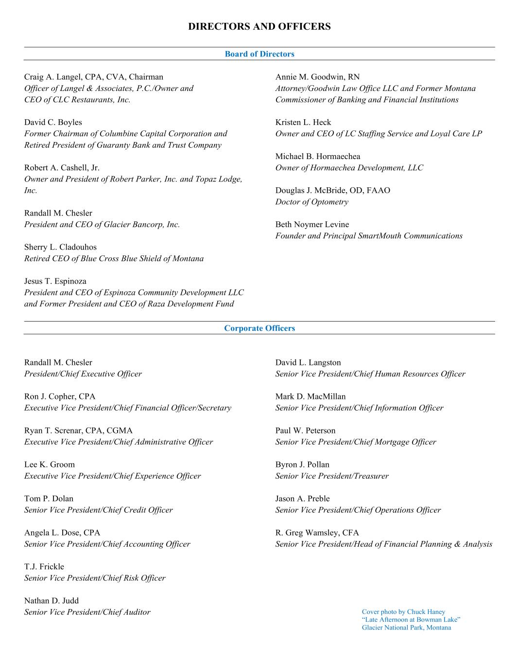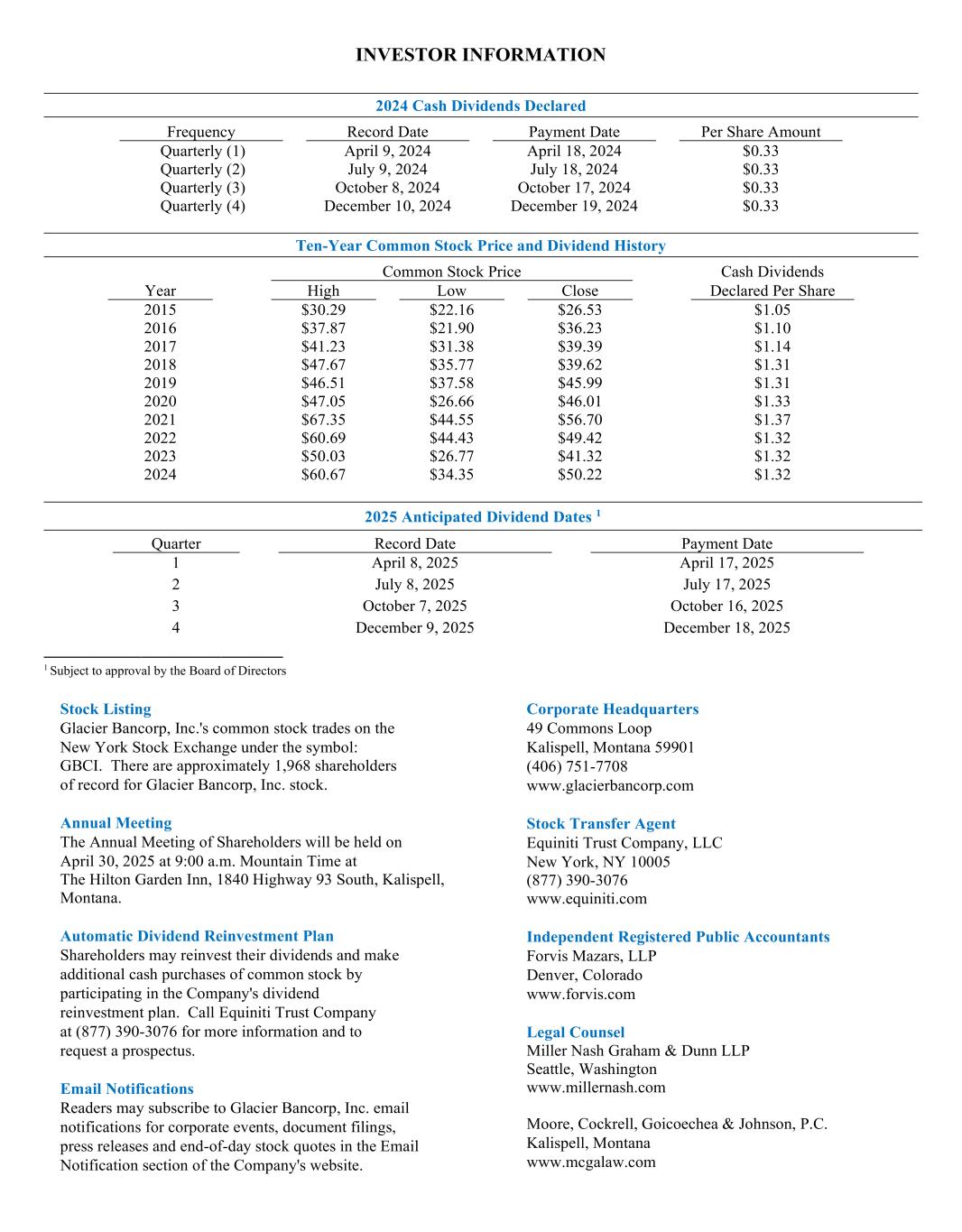 DIRECTORS AND OFFICERS Board of Directors Craig A. Langel, CPA, CVA, Chairman Officer of Langel & Associates, P.C./Owner and CEO of CLC Restaurants, Inc. David C. Boyles Former Chairman of Columbine Capital Corporation and Retired President of Guaranty Bank and Trust Company Robert A. Cashell, Jr. Owner and President of Robert Parker, Inc. and Topaz Lodge, Inc. Randall M. Chesler President and CEO of Glacier Bancorp, Inc. Sherry L. Cladouhos Retired CEO of Blue Cross Blue Shield of Montana Jesus T. Espinoza President and CEO of Espinoza Community Development LLC and Former President and CEO of Raza Development Fund Annie M. Goodwin, RN Attorney/Goodwin Law Office LLC and Former Montana Commissioner of Banking and Financial Institutions Kristen L. Heck Owner and CEO of LC Staffing Service and Loyal Care LP Michael B. Hormaechea Owner of Hormaechea Development, LLC Douglas J. McBride, OD, FAAO Doctor of Optometry Beth Noymer Levine Founder and Principal SmartMouth Communications Corporate Officers Randall M. Chesler President/Chief Executive Officer Ron J. Copher, CPA Executive Vice President/Chief Financial Officer/Secretary Ryan T. Screnar, CPA, CGMA Executive Vice President/Chief Administrative Officer Lee K. Groom Executive Vice President/Chief Experience Officer Tom P. Dolan Senior Vice President/Chief Credit Officer Angela L. Dose, CPA Senior Vice President/Chief Accounting Officer T.J. Frickle Senior Vice President/Chief Risk Officer Nathan D. Judd Senior Vice President/Chief Auditor David L. Langston Senior Vice President/Chief Human Resources Officer Mark D. MacMillan Senior Vice President/Chief Information Officer Paul W. Peterson Senior Vice President/Chief Mortgage Officer Byron J. Pollan Senior Vice President/Treasurer Jason A. Preble Senior Vice President/Chief Operations Officer R. Greg Wamsley, CFA Senior Vice President/Head of Financial Planning & Analysis Cover photo by Chuck Haney “Late Afternoon at Bowman Lake” Glacier National Park, Montana INVESTOR INFORMATION 2024 Cash Dividends Declared Frequency Record Date Payment Date Per Share Amount Quarterly (1) April 9, 2024 April 18, 2024 $0.33 Quarterly (2) July 9, 2024 July 18, 2024 $0.33 Quarterly (3) October 8, 2024 October 17, 2024 $0.33 Quarterly (4) December 10, 2024 December 19, 2024 $0.33 Ten-Year Common Stock Price and Dividend History Common Stock Price Cash Dividends Year High Low Close Declared Per Share 2015 $30.29 $22.16 $26.53 $1.05 2016 $37.87 $21.90 $36.23 $1.10 2017 $41.23 $31.38 $39.39 $1.14 2018 $47.67 $35.77 $39.62 $1.31 2019 $46.51 $37.58 $45.99 $1.31 2020 $47.05 $26.66 $46.01 $1.33 2021 $67.35 $44.55 $56.70 $1.37 2022 $60.69 $44.43 $49.42 $1.32 2023 $50.03 $26.77 $41.32 $1.32 2024 $60.67 $34.35 $50.22 $1.32 ___________________________ 1 Subject to approval by the Board of Directors Stock Listing Glacier Bancorp, Inc.'s common stock trades on the New York Stock Exchange under the symbol: GBCI. There are approximately 1,968 shareholders of record for Glacier Bancorp, Inc. stock. Annual Meeting The Annual Meeting of Shareholders will be held on April 30, 2025 at 9:00 a.m. Mountain Time at The Hilton Garden Inn, 1840 Highway 93 South, Kalispell, Montana. Automatic Dividend Reinvestment Plan Shareholders may reinvest their dividends and make additional cash purchases of common stock by participating in the Company's dividend reinvestment plan. Call Equiniti Trust Company at (877) 390-3076 for more information and to request a prospectus. Email Notifications Readers may subscribe to Glacier Bancorp, Inc. email notifications for corporate events, document filings, press releases and end-of-day stock quotes in the Email Notification section of the Company's website. Corporate Headquarters 49 Commons Loop Kalispell, Montana 59901 (406) 751-7708 www.glacierbancorp.com Stock Transfer Agent Equiniti Trust Company, LLC New York, NY 10005 (877) 390-3076 www.equiniti.com Independent Registered Public Accountants Forvis Mazars, LLP Denver, Colorado www.forvis.com Legal Counsel Miller Nash Graham & Dunn LLP Seattle, Washington www.millernash.com Moore, Cockrell, Goicoechea & Johnson, P.C. Kalispell, Montana www.mcgalaw.com 2025 Anticipated Dividend Dates 1 Quarter Record Date Payment Date 1 April 8, 2025 April 17, 2025 2 July 8, 2025 July 17, 2025 3 October 7, 2025 October 16, 2025 4 December 9, 2025 December 18, 2025
