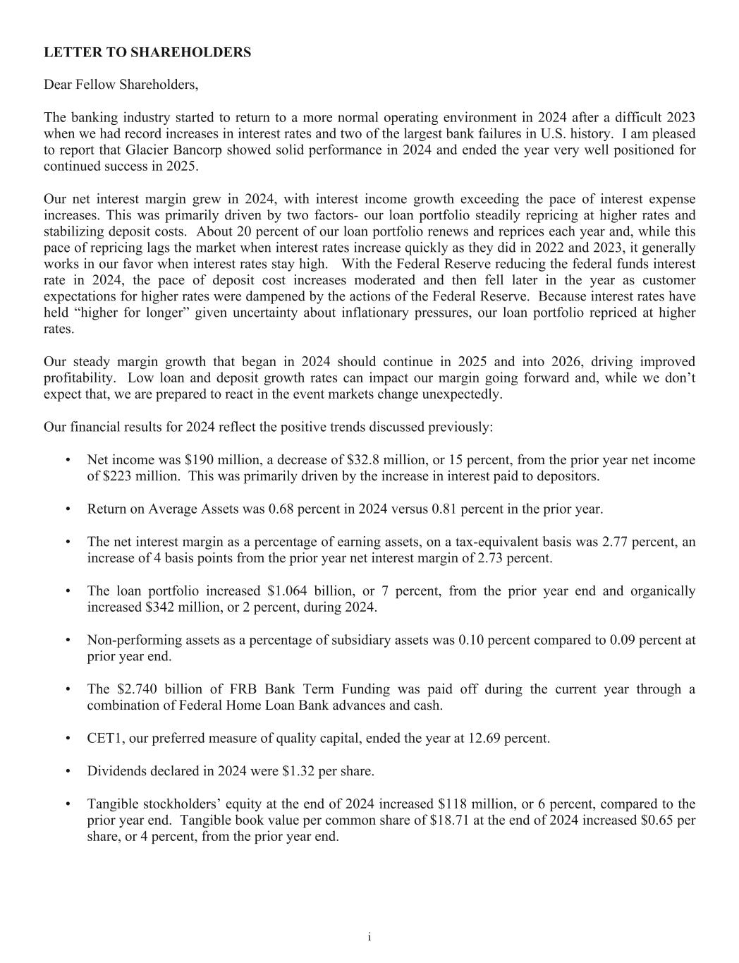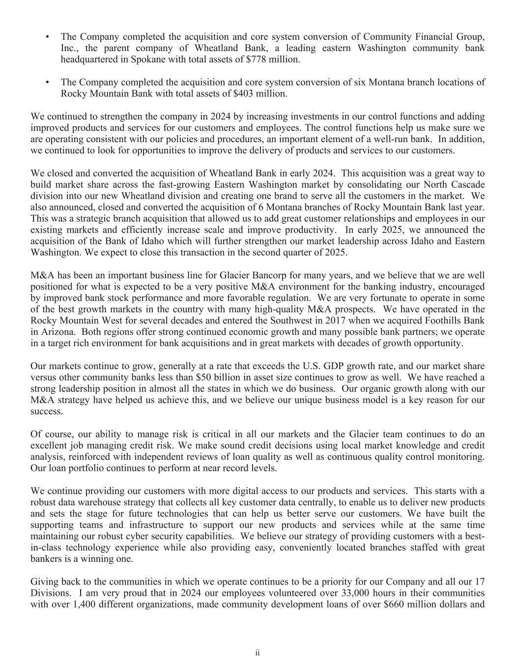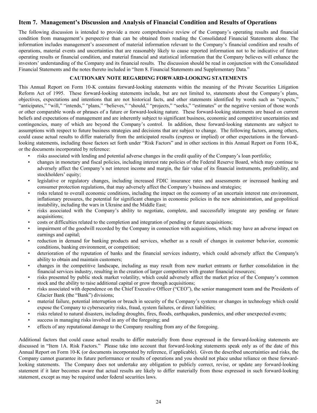 Item 7. Management’s Discussion and Analysis of Financial Condition and Results of Operations The following discussion is intended to provide a more comprehensive review of the Company’s operating results and financial condition from management’s perspective than can be obtained from reading the Consolidated Financial Statements alone. The information includes management’s assessment of material information relevant to the Company’s financial condition and results of operations, material events and uncertainties that are reasonably likely to cause reported information not to be indicative of future operating results or financial condition, and material financial and statistical information that the Company believes will enhance the investors’ understanding of the Company and its financial results. The discussion should be read in conjunction with the Consolidated Financial Statements and the notes thereto included in “Item 8. Financial Statements and Supplementary Data.” CAUTIONARY NOTE REGARDING FORWARD-LOOKING STATEMENTS This Annual Report on Form 10-K contains forward-looking statements within the meaning of the Private Securities Litigation Reform Act of 1995. These forward-looking statements include, but are not limited to, statements about the Company’s plans, objectives, expectations and intentions that are not historical facts, and other statements identified by words such as “expects,” “anticipates,” “will,” “intends,” “plans,” “believes,” “should,” “projects,” “seeks,” “estimates” or the negative version of those words or other comparable words or phrases of a future or forward-looking nature. These forward-looking statements are based on current beliefs and expectations of management and are inherently subject to significant business, economic and competitive uncertainties and contingencies, many of which are beyond the Company’s control. In addition, these forward-looking statements are subject to assumptions with respect to future business strategies and decisions that are subject to change. The following factors, among others, could cause actual results to differ materially from the anticipated results (express or implied) or other expectations in the forward- looking statements, including those factors set forth under “Risk Factors” and in other sections in this Annual Report on Form 10-K, or the documents incorporated by reference: • risks associated with lending and potential adverse changes in the credit quality of the Company’s loan portfolio; • changes in monetary and fiscal policies, including interest rate policies of the Federal Reserve Board, which may continue to adversely affect the Company’s net interest income and margin, the fair value of its financial instruments, profitability, and stockholders’ equity; • legislative or regulatory changes, including increased FDIC insurance rates and assessments or increased banking and consumer protection regulations, that may adversely affect the Company’s business and strategies; • risks related to overall economic conditions, including the impact on the economy of an uncertain interest rate environment, inflationary pressures, the potential for significant changes in economic policies in the new administration, and geopolitical instability, including the wars in Ukraine and the Middle East; • risks associated with the Company’s ability to negotiate, complete, and successfully integrate any pending or future acquisitions; • costs or difficulties related to the completion and integration of pending or future acquisitions; • impairment of the goodwill recorded by the Company in connection with acquisitions, which may have an adverse impact on earnings and capital; • reduction in demand for banking products and services, whether as a result of changes in customer behavior, economic conditions, banking environment, or competition; • deterioration of the reputation of banks and the financial services industry, which could adversely affect the Company's ability to obtain and maintain customers; • changes in the competitive landscape, including as may result from new market entrants or further consolidation in the financial services industry, resulting in the creation of larger competitors with greater financial resources; • risks presented by public stock market volatility, which could adversely affect the market price of the Company’s common stock and the ability to raise additional capital or grow through acquisitions; • risks associated with dependence on the Chief Executive Officer (“CEO”), the senior management team and the Presidents of Glacier Bank (the “Bank”) divisions; • material failure, potential interruption or breach in security of the Company’s systems or changes in technology which could expose the Company to cybersecurity risks, fraud, system failures, or direct liabilities; • risks related to natural disasters, including droughts, fires, floods, earthquakes, pandemics, and other unexpected events; • success in managing risks involved in any of the foregoing; and • effects of any reputational damage to the Company resulting from any of the foregoing. Additional factors that could cause actual results to differ materially from those expressed in the forward-looking statements are discussed in “Item 1A. Risk Factors.” Please take into account that forward-looking statements speak only as of the date of this Annual Report on Form 10-K (or documents incorporated by reference, if applicable). Given the described uncertainties and risks, the Company cannot guarantee its future performance or results of operations and you should not place undue reliance on these forward- looking statements. The Company does not undertake any obligation to publicly correct, revise, or update any forward-looking statement if it later becomes aware that actual results are likely to differ materially from those expres