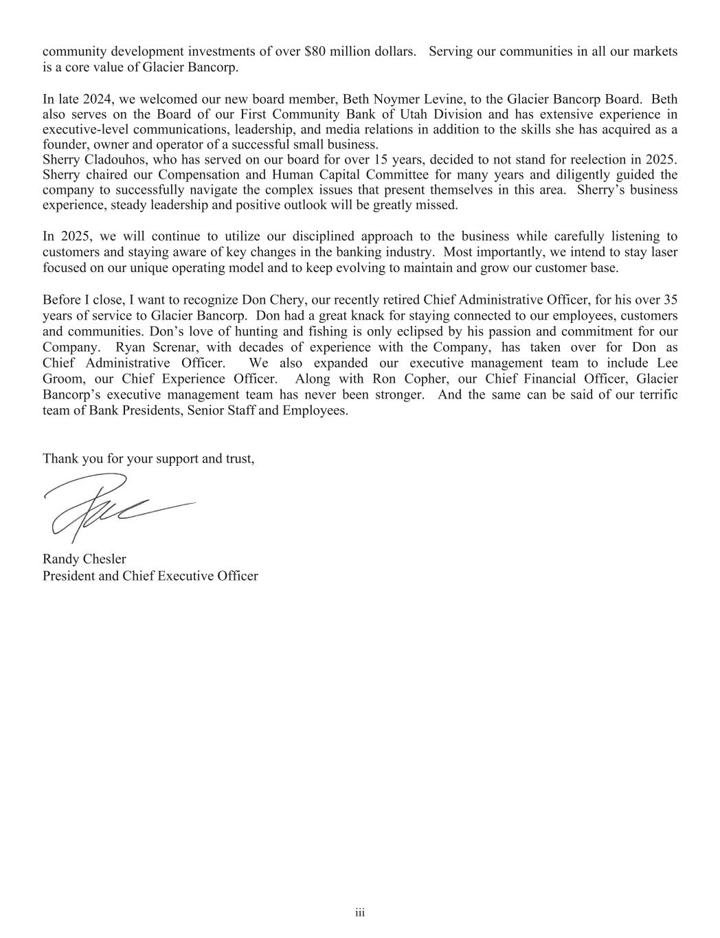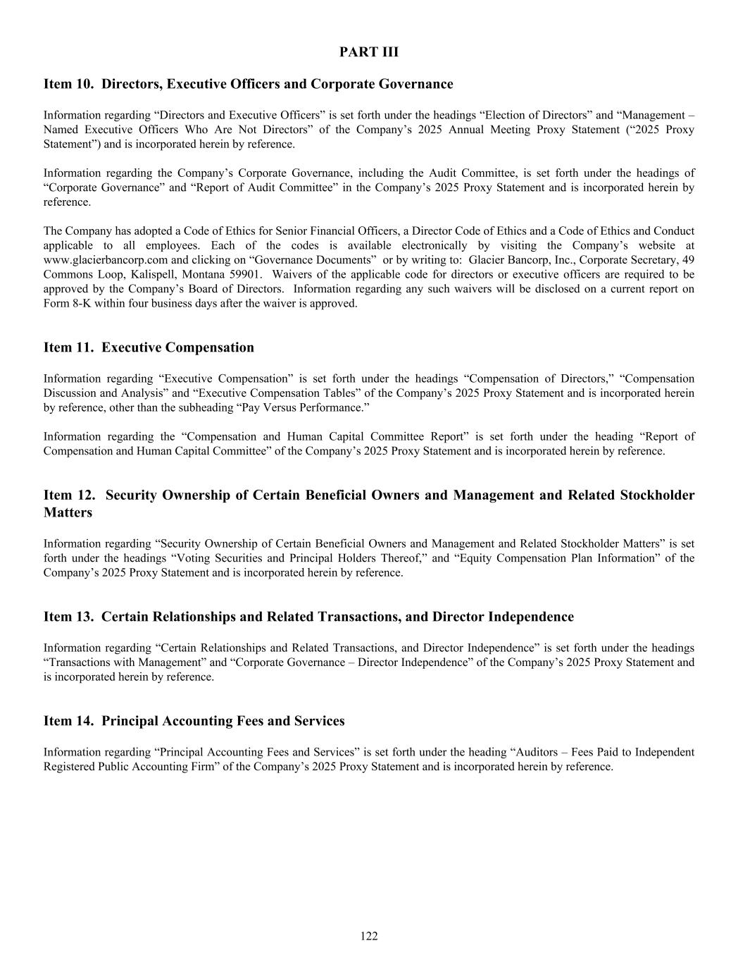 PART III Item 10. Directors, Executive Officers and Corporate Governance Information regarding “Directors and Executive Officers” is set forth under the headings “Election of Directors” and “Management – Named Executive Officers Who Are Not Directors” of the Company’s 2025 Annual Meeting Proxy Statement (“2025 Proxy Statement”) and is incorporated herein by reference. Information regarding the Company’s Corporate Governance, including the Audit Committee, is set forth under the headings of “Corporate Governance” and “Report of Audit Committee” in the Company’s 2025 Proxy Statement and is incorporated herein by reference. The Company has adopted a Code of Ethics for Senior Financial Officers, a Director Code of Ethics and a Code of Ethics and Conduct applicable to all employees. Each of the codes is available electronically by visiting the Company’s website at www.glacierbancorp.com and clicking on “Governance Documents” or by writing to: Glacier Bancorp, Inc., Corporate Secretary, 49 Commons Loop, Kalispell, Montana 59901. Waivers of the applicable code for directors or executive officers are required to be approved by the Company’s Board of Directors. Information regarding any such waivers will be disclosed on a current report on Form 8-K within four business days after the waiver is approved. Item 11. Executive Compensation Information regarding “Executive Compensation” is set forth under the headings “Compensation of Directors,” “Compensation Discussion and Analysis” and “Executive Compensation Tables” of the Company’s 2025 Proxy Statement and is incorporated herein by reference, other than the subheading “Pay Versus Performance.” Information regarding the “Compensation and Human Capital Committee Report” is set forth under the heading “Report of Compensation and Human Capital Committee” of the Company’s 2025 Proxy Statement and is incorporated herein by reference. Item 12. Security Ownership of Certain Beneficial Owners and Management and Related Stockholder Matters Information regarding “Security Ownership of Certain Beneficial Owners and Management and Related Stockholder Matters” is set forth under the headings “Voting Securities and Principal Holders Thereof,” and “Equity Compensation Plan Information” of the Company’s 2025 Proxy Statement and is incorporated herein by reference. Item 13. Certain Relationships and Related Transactions, and Director Independence Information regarding “Certain Relationships and Related Transactions, and Director Independence” is set forth under the headings “Transactions with Management” and “Corporate Governance – Director Independence” of the Company’s 2025 Proxy Statement and is incorporated herein by reference. Item 14. Principal Accounting Fees and Services Information regarding “Principal Accounting Fees and Services” is set forth under the heading “Auditors – Fees Paid to Independent Registered Public Accounting Firm” of the Company’s 2025 Proxy Statement and is incorporated herein by reference. 122