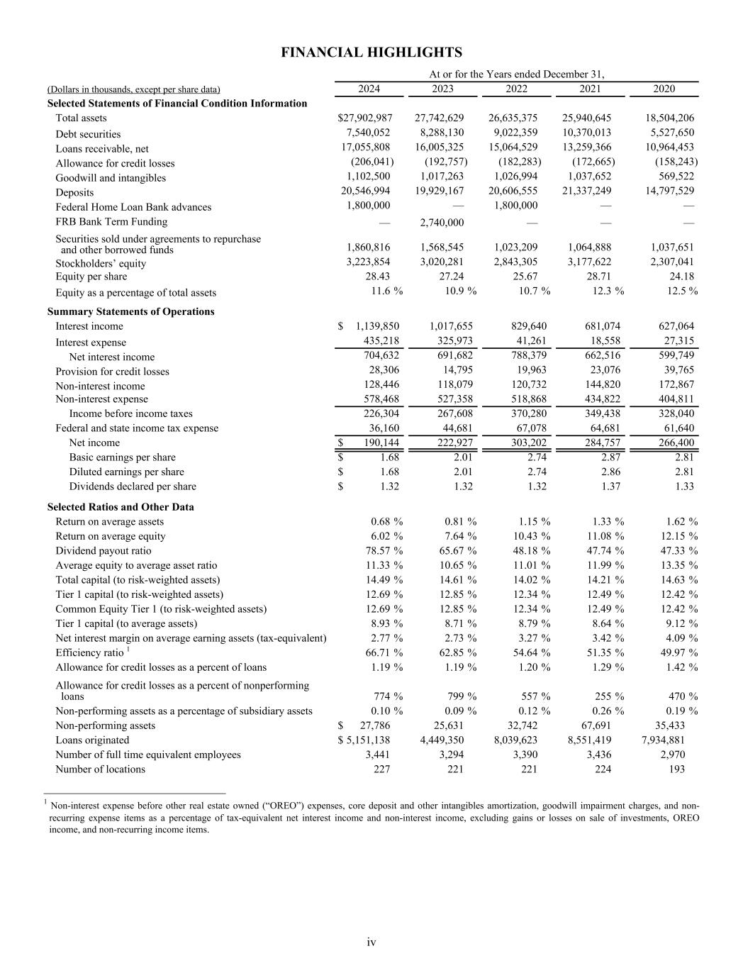 FINANCIAL HIGHLIGHTS At or for the Years ended December 31, (Dollars in thousands, except per share data) 2024 2023 2022 2021 2020 Selected Statements of Financial Condition Information Total assets $ 27,902,987 27,742,629 26,635,375 25,940,645 18,504,206 Debt securities 7,540,052 8,288,130 9,022,359 10,370,013 5,527,650 Loans receivable, net 17,055,808 16,005,325 15,064,529 13,259,366 10,964,453 Allowance for credit losses (206,041) (192,757) (182,283) (172,665) (158,243) Goodwill and intangibles 1,102,500 1,017,263 1,026,994 1,037,652 569,522 Deposits 20,546,994 19,929,167 20,606,555 21,337,249 14,797,529 Federal Home Loan Bank advances 1,800,000 — 1,800,000 — — FRB Bank Term Funding — 2,740,000 — — — Securities sold under agreements to repurchase and other borrowed funds 1,860,816 1,568,545 1,023,209 1,064,888 1,037,651 Stockholders’ equity 3,223,854 3,020,281 2,843,305 3,177,622 2,307,041 Equity per share 28.43 27.24 25.67 28.71 24.18 Equity as a percentage of total assets 11.6 % 10.9 % 10.7 % 12.3 % 12.5 % Summary Statements of Operations Interest income $ 1,139,850 1,017,655 829,640 681,074 627,064 Interest expense 435,218 325,973 41,261 18,558 27,315 Net interest income 704,632 691,682 788,379 662,516 599,749 Provision for credit losses 28,306 14,795 19,963 23,076 39,765 Non-interest income 128,446 118,079 120,732 144,820 172,867 Non-interest expense 578,468 527,358 518,868 434,822 404,811 Income before income taxes 226,304 267,608 370,280 349,438 328,040 Federal and state income tax expense 36,160 44,681 67,078 64,681 61,640 Net income $ 190,144 222,927 303,202 284,757 266,400 Basic earnings per share $ 1.68 2.01 2.74 2.87 2.81 Diluted earnings per share $ 1.68 2.01 2.74 2.86 2.81 Dividends declared per share $ 1.32 1.32 1.32 1.37 1.33 Selected Ratios and Other Data Return on average assets 0.68 % 0.81 % 1.15 % 1.33 % 1.62 % Return on average equity 6.02 % 7.64 % 10.43 % 11.08 % 12.15 % Dividend payout ratio 78.57 % 65.67 % 48.18 % 47.74 % 47.33 % Average equity to average asset ratio 11.33 % 10.65 % 11.01 % 11.99 % 13.35 % Total capital (to risk-weighted assets) 14.49 % 14.61 % 14.02 % 14.21 % 14.63 % Tier 1 capital (to risk-weighted assets) 12.69 % 12.85 % 12.34 % 12.49 % 12.42 % Common Equity Tier 1 (to risk-weighted assets) 12.69 % 12.85 % 12.34 % 12.49 % 12.42 % Tier 1 capital (to average assets) 8.93 % 8.71 % 8.79 % 8.64 % 9.12 % Net interest margin on average earning assets (tax-equivalent) 2.77 % 2.73 % 3.27 % 3.42 % 4.09 % Efficiency ratio 1 66.71 % 62.85 % 54.64 % 51.35 % 49.97 % Allowance for credit losses as a percent of loans 1.19 % 1.19 % 1.20 % 1.29 % 1.42 % Allowance for credit losses as a percent of nonperforming loans 774 % 799 % 557 % 255 % 470 % Non-performing assets as a percentage of subsidiary assets 0.10 % 0.09 % 0.12 % 0.26 % 0.19 % Non-performing assets $ 27,786 25,631 32,742 67,691 35,433 Loans originated $ 5,151,138 4,449,350 8,039,623 8,551,419 7,934,881 Number of full time equivalent employees 3,441 3,294 3,390 3,436 2,970 Number of locations 227 221 221 224 193 ______________________________ 1 Non-interest expense before other real estate owned (“OREO”) expenses, core deposit and other intangibles amortization, goodwill impairment charges, and non- recurring expense items as a percentage of tax-equivalent net interest income and non-interest income, excluding gains or losses on sale of investments, OREO income, and non-recurring income items. iv