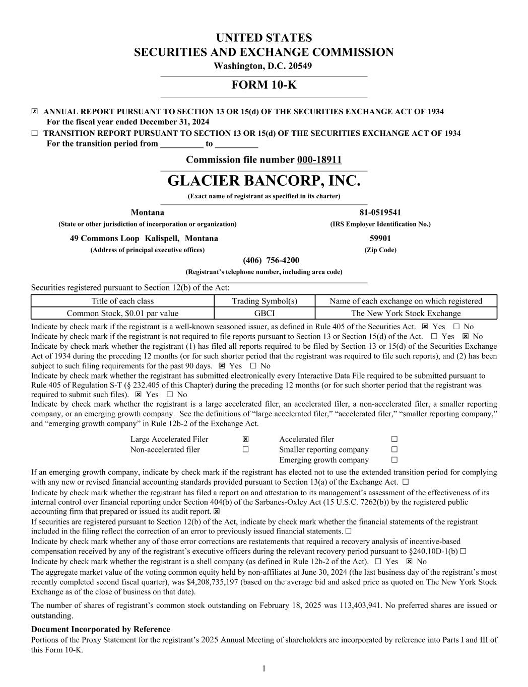 UNITED STATES SECURITIES AND EXCHANGE COMMISSION Washington, D.C. 20549 ________________________________________________________________________________________________________________________ FORM 10-K ________________________________________________________________________________________________________________________ ☒ ANNUAL REPORT PURSUANT TO SECTION 13 OR 15(d) OF THE SECURITIES EXCHANGE ACT OF 1934 For the fiscal year ended December 31, 2024 ☐ TRANSITION REPORT PURSUANT TO SECTION 13 OR 15(d) OF THE SECURITIES EXCHANGE ACT OF 1934 For the transition period from __________ to __________ Commission file number 000-18911 ________________________________________________________________________________________________________________________ GLACIER BANCORP, INC. (Exact name of registrant as specified in its charter) ________________________________________________________________________________________________________________________ Montana 81-0519541 (State or other jurisdiction of incorporation or organization) (IRS Employer Identification No.) 49 Commons Loop Kalispell, Montana 59901 (Address of principal executive offices) (Zip Code) (406) 756-4200 (Registrant’s telephone number, including area code) ________________________________________________________________________________________________________________________ Securities registered pursuant to Section 12(b) of the Act: Title of each class Trading Symbol(s) Name of each exchange on which registered Common Stock, $0.01 par value GBCI The New York Stock Exchange Indicate by check mark if the registrant is a well-known seasoned issuer, as defined in Rule 405 of the Securities Act. ☒ Yes ☐ No Indicate by check mark if the registrant is not required to file reports pursuant to Section 13 or Section 15(d) of the Act. ☐ Yes ☒ No Indicate by check mark whether the registrant (1) has filed all reports required to be filed by Section 13 or 15(d) of the Securities Exchange Act of 1934 during the preceding 12 months (or for such shorter period that the registrant was required to file such reports), and (2) has been subject to such filing requirements for the past 90 days. ☒ Yes ☐ No Indicate by check mark whether the registrant has submitted electronically every Interactive Data File required to be submitted pursuant to Rule 405 of Regulation S-T (§ 232.405 of this Chapter) during the preceding 12 months (or for such shorter period that the registrant was required to submit such files). ☒ Yes ☐ No Indicate by check mark whether the registrant is a large accelerated filer, an accelerated filer, a non-accelerated filer, a smaller reporting company, or an emerging growth company. See the definitions of “large accelerated filer,” “accelerated filer,” “smaller reporting company,” and “emerging growth company” in Rule 12b-2 of the Exchange Act. Large Accelerated Filer ☒ Accelerated filer ☐ Non-accelerated filer ☐ Smaller reporting company ☐ Emerging growth company ☐ If an emerging growth company, indicate by check mark if the registrant has elected not to use the extended transition period for complying with any new or revised financial accounting standards provided pursuant to Section 13(a) of the Exchange Act. ☐ Indicate by check mark whether the registrant has filed a report on and attestation to its management’s assessment of the effectiveness of its internal control over financial reporting under Section 404(b) of the Sarbanes-Oxley Act (15 U.S.C. 7262(b)) by the registered public accounting firm that prepared or issued its audit report. ☒ If securities are registered pursuant to Section 12(b) of the Act, indicate by check mark whether the financial statements of the registrant included in the filing reflect the correction of an error to previously issued financial statements. ☐ Indicate by check mark whether any of those error corrections are restatements that required a recovery analysis of incentive-based compensation received by any of the registrant’s executive officers during the relevant recovery period pursuant to §240.10D-1(b) ☐ Indicate by check mark whether the registrant is a shell company (as defined in Rule 12b-2 of the Act). ☐ Yes ☒ No The aggregate market value of the voting common equity held by non-affiliates at June 30, 2024 (the last business day of the registrant’s most recently completed second fiscal quarter), was $4,208,735,197 (based on the average bid and asked price as quoted on The New York Stock Exchange as of the close of business on that date). The number of shares of registrant’s common stock outstanding on February 18, 2025 was 113,403,941. No preferred shares are issued or outstanding. Document Incorporated by Reference Portions of the Proxy Statement for the registrant’s 2025 Annual Meeting of shareholders are incorporated by reference into Parts I and III of this Form 10-K. 1