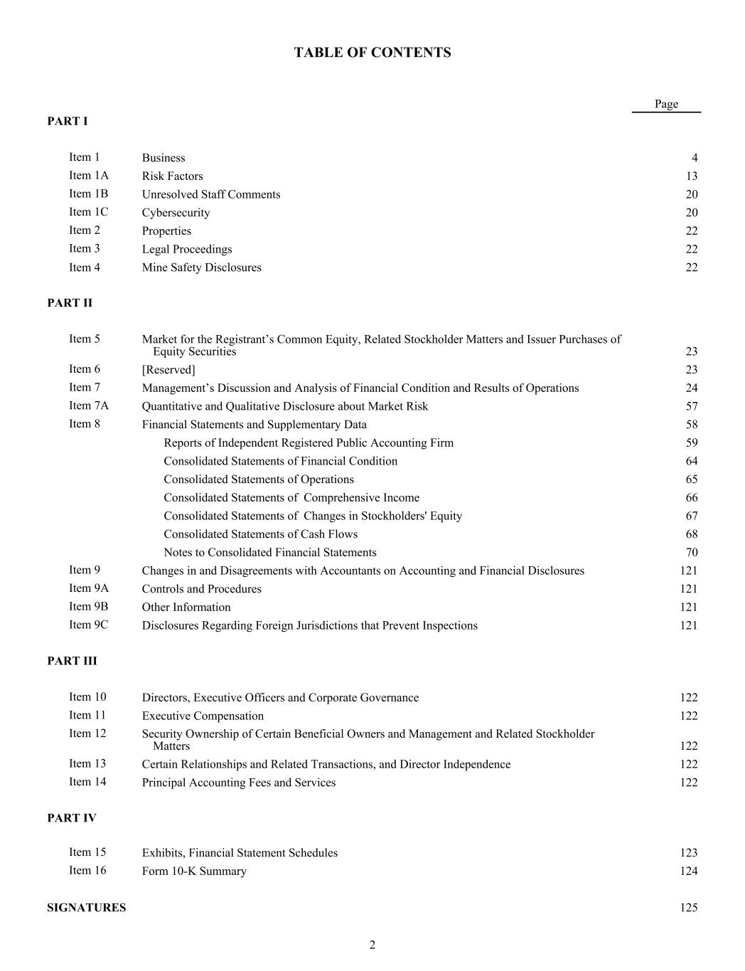 TABLE OF CONTENTS Page PART I Item 1 Business 4 Item 1A Risk Factors 13 Item 1B Unresolved Staff Comments 20 Item 1C Cybersecurity 20 Item 2 Properties 22 Item 3 Legal Proceedings 22 Item 4 Mine Safety Disclosures 22 PART II Item 5 Market for the Registrant’s Common Equity, Related Stockholder Matters and Issuer Purchases of Equity Securities 23 Item 6 [Reserved] 23 Item 7 Management’s Discussion and Analysis of Financial Condition and Results of Operations 24 Item 7A Quantitative and Qualitative Disclosure about Market Risk 57 Item 8 Financial Statements and Supplementary Data 58 Reports of Independent Registered Public Accounting Firm 59 Consolidated Statements of Financial Condition 64 Consolidated Statements of Operations 65 Consolidated Statements of Comprehensive Income 66 Consolidated Statements of Changes in Stockholders' Equity 67 Consolidated Statements of Cash Flows 68 Notes to Consolidated Financial Statements 70 Item 9 Changes in and Disagreements with Accountants on Accounting and Financial Disclosures 121 Item 9A Controls and Procedures 121 Item 9B Other Information 121 Item 9C Disclosures Regarding Foreign Jurisdictions that Prevent Inspections 121 PART III Item 10 Directors, Executive Officers and Corporate Governance 122 Item 11 Executive Compensation 122 Item 12 Security Ownership of Certain Beneficial Owners and Management and Related Stockholder Matters 122 Item 13 Certain Relationships and Related Transactions, and Director Independence 122 Item 14 Principal Accounting Fees and Services 122 PART IV Item 15 Exhibits, Financial Statement Schedules 123 Item 16 Form 10-K Summary 124 SIGNATURES 125 2