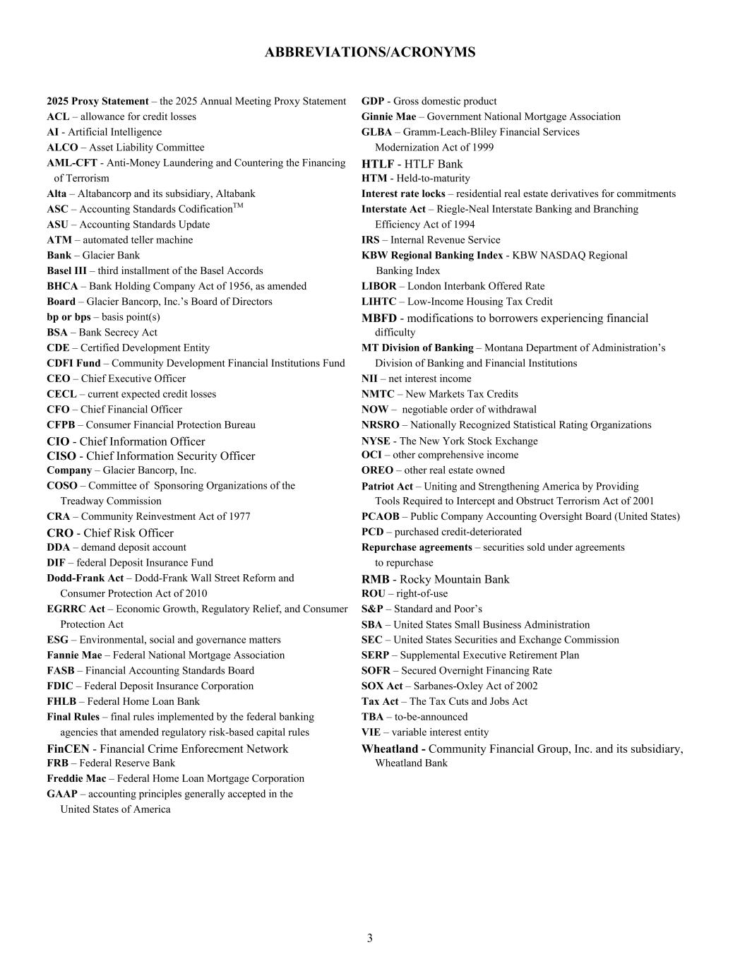ABBREVIATIONS/ACRONYMS 2025 Proxy Statement – the 2025 Annual Meeting Proxy Statement GDP - Gross domestic product ACL – allowance for credit losses Ginnie Mae – Government National Mortgage Association AI - Artificial Intelligence GLBA – Gramm-Leach-Bliley Financial Services ALCO – Asset Liability Committee Modernization Act of 1999 AML-CFT - Anti-Money Laundering and Countering the Financing HTLF - HTLF Bank of Terrorism HTM - Held-to-maturity Alta – Altabancorp and its subsidiary, Altabank Interest rate locks – residential real estate derivatives for commitments ASC – Accounting Standards CodificationTM Interstate Act – Riegle-Neal Interstate Banking and Branching ASU – Accounting Standards Update Efficiency Act of 1994 ATM – automated teller machine IRS – Internal Revenue Service Bank – Glacier Bank KBW Regional Banking Index - KBW NASDAQ Regional Basel III – third installment of the Basel Accords Banking Index BHCA – Bank Holding Company Act of 1956, as amended LIBOR – London Interbank Offered Rate Board – Glacier Bancorp, Inc.’s Board of Directors LIHTC – Low-Income Housing Tax Credit bp or bps – basis point(s) MBFD - modifications to borrowers experiencing financial BSA – Bank Secrecy Act difficulty CDE – Certified Development Entity MT Division of Banking – Montana Department of Administration’s CDFI Fund – Community Development Financial Institutions Fund Division of Banking and Financial Institutions CEO – Chief Executive Officer NII – net interest income CECL – current expected credit losses NMTC – New Markets Tax Credits CFO – Chief Financial Officer NOW – negotiable order of withdrawal CFPB – Consumer Financial Protection Bureau NRSRO – Nationally Recognized Statistical Rating Organizations CIO - Chief Information Officer NYSE - The New York Stock Exchange CISO - Chief Information Security Officer OCI – other comprehensive income Company – Glacier Bancorp, Inc. OREO – other real estate owned COSO – Committee of Sponsoring Organizations of the Patriot Act – Uniting and Strengthening America by Providing AppropriateTreadway Commission Tools Required to Intercept and Obstruct Terrorism Act of 2001 CRA – Community Reinvestment Act of 1977 PCAOB – Public Company Accounting Oversight Board (United States) CRO - Chief Risk Officer PCD – purchased credit-deteriorated DDA – demand deposit account Repurchase agreements – securities sold under agreements DIF – federal Deposit Insurance Fund to repurchase Dodd-Frank Act – Dodd-Frank Wall Street Reform and RMB - Rocky Mountain Bank Consumer Protection Act of 2010 ROU – right-of-use EGRRC Act – Economic Growth, Regulatory Relief, and Consumer S&P – Standard and Poor’s Protection Act SBA – United States Small Business Administration ESG – Environmental, social and governance matters SEC – United States Securities and Exchange Commission Fannie Mae – Federal National Mortgage Association SERP – Supplemental Executive Retirement Plan FASB – Financial Accounting Standards Board SOFR – Secured Overnight Financing Rate FDIC – Federal Deposit Insurance Corporation SOX Act – Sarbanes-Oxley Act of 2002 FHLB – Federal Home Loan Bank Tax Act – The Tax Cuts and Jobs Act Final Rules – final rules implemented by the federal banking TBA – to-be-announced agencies that amended regulatory risk-based capital rules VIE – variable interest entity FinCEN - Financial Crime Enforecment Network Wheatland - Community Financial Group, Inc. and its subsidiary, FRB – Federal Reserve Bank Wheatland Bank Freddie Mac – Federal Home Loan Mortgage Corporation GAAP – accounting principles generally accepted in the United States of America 3