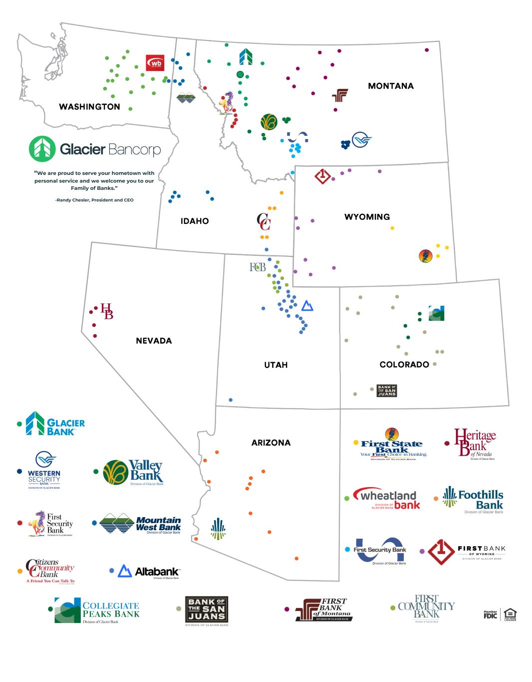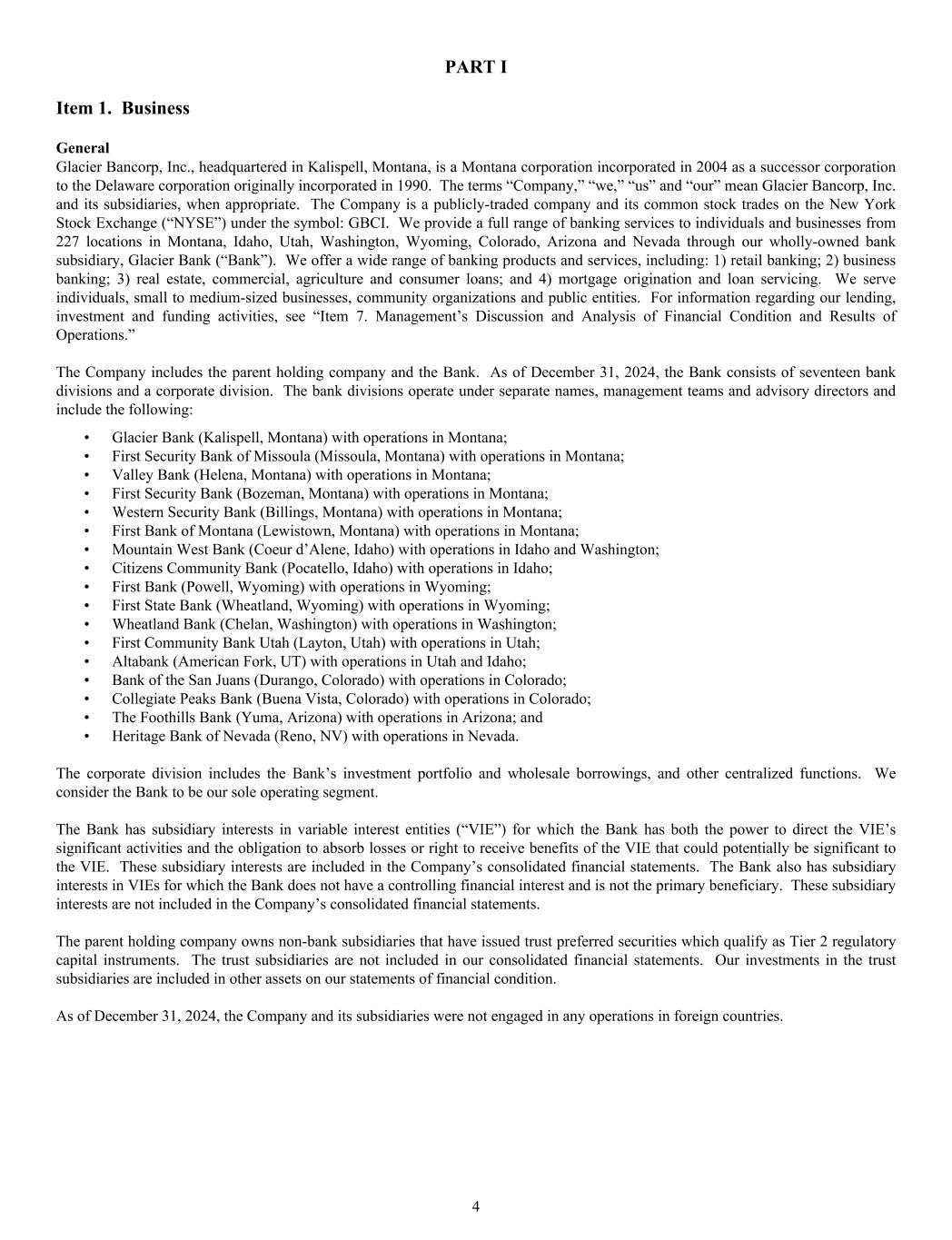 PART I Item 1. Business General Glacier Bancorp, Inc., headquartered in Kalispell, Montana, is a Montana corporation incorporated in 2004 as a successor corporation to the Delaware corporation originally incorporated in 1990. The terms “Company,” “we,” “us” and “our” mean Glacier Bancorp, Inc. and its subsidiaries, when appropriate. The Company is a publicly-traded company and its common stock trades on the New York Stock Exchange (“NYSE”) under the symbol: GBCI. We provide a full range of banking services to individuals and businesses from 227 locations in Montana, Idaho, Utah, Washington, Wyoming, Colorado, Arizona and Nevada through our wholly-owned bank subsidiary, Glacier Bank (“Bank”). We offer a wide range of banking products and services, including: 1) retail banking; 2) business banking; 3) real estate, commercial, agriculture and consumer loans; and 4) mortgage origination and loan servicing. We serve individuals, small to medium-sized businesses, community organizations and public entities. For information regarding our lending, investment and funding activities, see “Item 7. Management’s Discussion and Analysis of Financial Condition and Results of Operations.” The Company includes the parent holding company and the Bank. As of December 31, 2024, the Bank consists of seventeen bank divisions and a corporate division. The bank divisions operate under separate names, management teams and advisory directors and include the following: • Glacier Bank (Kalispell, Montana) with operations in Montana; • First Security Bank of Missoula (Missoula, Montana) with operations in Montana; • Valley Bank (Helena, Montana) with operations in Montana; • First Security Bank (Bozeman, Montana) with operations in Montana; • Western Security Bank (Billings, Montana) with operations in Montana; • First Bank of Montana (Lewistown, Montana) with operations in Montana; • Mountain West Bank (Coeur d’Alene, Idaho) with operations in Idaho and Washington; • Citizens Community Bank (Pocatello, Idaho) with operations in Idaho; • First Bank (Powell, Wyoming) with operations in Wyoming; • First State Bank (Wheatland, Wyoming) with operations in Wyoming; • Wheatland Bank (Chelan, Washington) with operations in Washington; • First Community Bank Utah (Layton, Utah) with operations in Utah; • Altabank (American Fork, UT) with operations in Utah and Idaho; • Bank of the San Juans (Durango, Colorado) with operations in Colorado; • Collegiate Peaks Bank (Buena Vista, Colorado) with operations in Colorado; • The Foothills Bank (Yuma, Arizona) with operations in Arizona; and • Heritage Bank of Nevada (Reno, NV) with operations in Nevada. The corporate division includes the Bank’s investment portfolio and wholesale borrowings, and other centralized functions. We consider the Bank to be our sole operating segment. The Bank has subsidiary interests in variable interest entities (“VIE”) for which the Bank has both the power to direct the VIE’s significant activities and the obligation to absorb losses or right to receive benefits of the VIE that could potentially be significant to the VIE. These subsidiary interests are included in the Company’s consolidated financial statements. The Bank also has subsidiary interests in VIEs for which the Bank does not have a controlling financial interest and is not the primary beneficiary. These subsidiary interests are not included in the Company’s consolidated financial statements. The parent holding company owns non-bank subsidiaries that have issued trust preferred securities which qualify as Tier 2 regulatory capital instruments. The trust subsidiaries are not included in our consolidated financial statements. Our investments in the trust subsidiaries are included in other assets on our statements of financial condition. As of December 31, 2024, the Company and its subsidiaries were not engaged in any operations in foreign countries. 4