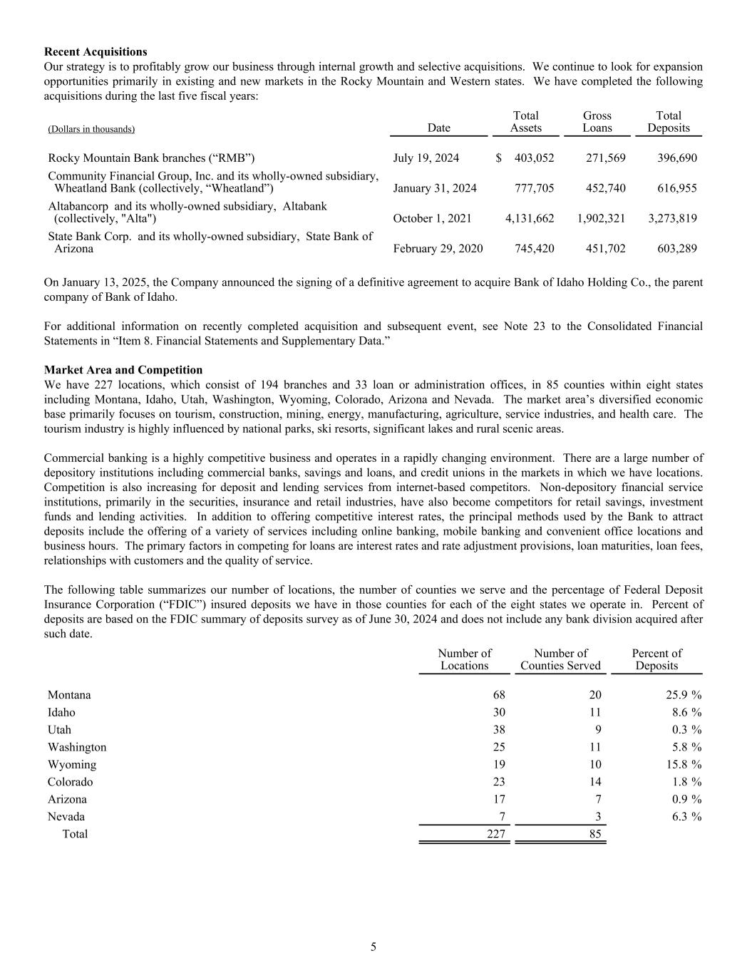 Recent Acquisitions Our strategy is to profitably grow our business through internal growth and selective acquisitions. We continue to look for expansion opportunities primarily in existing and new markets in the Rocky Mountain and Western states. We have completed the following acquisitions during the last five fiscal years: (Dollars in thousands) Date Total Assets Gross Loans Total Deposits Rocky Mountain Bank branches (“RMB”) July 19, 2024 $ 403,052 271,569 396,690 Community Financial Group, Inc. and its wholly-owned subsidiary, Wheatland Bank (collectively, “Wheatland”) January 31, 2024 777,705 452,740 616,955 Altabancorp and its wholly-owned subsidiary, Altabank (collectively, "Alta") October 1, 2021 4,131,662 1,902,321 3,273,819 State Bank Corp. and its wholly-owned subsidiary, State Bank of Arizona February 29, 2020 745,420 451,702 603,289 On January 13, 2025, the Company announced the signing of a definitive agreement to acquire Bank of Idaho Holding Co., the parent company of Bank of Idaho. For additional information on recently completed acquisition and subsequent event, see Note 23 to the Consolidated Financial Statements in “Item 8. Financial Statements and Supplementary Data.” Market Area and Competition We have 227 locations, which consist of 194 branches and 33 loan or administration offices, in 85 counties within eight states including Montana, Idaho, Utah, Washington, Wyoming, Colorado, Arizona and Nevada. The market area’s diversified economic base primarily focuses on tourism, construction, mining, energy, manufacturing, agriculture, service industries, and health care. The tourism industry is highly influenced by national parks, ski resorts, significant lakes and rural scenic areas. Commercial banking is a highly competitive business and operates in a rapidly changing environment. There are a large number of depository institutions including commercial banks, savings and loans, and credit unions in the markets in which we have locations. Competition is also increasing for deposit and lending services from internet-based competitors. Non-depository financial service institutions, primarily in the securities, insurance and retail industries, have also become competitors for retail savings, investment funds and lending activities. In addition to offering competitive interest rates, the principal methods used by the Bank to attract deposits include the offering of a variety of services including online banking, mobile banking and convenient office locations and business hours. The primary factors in competing for loans are interest rates and rate adjustment provisions, loan maturities, loan fees, relationships with customers and the quality of service. The following table summarizes our number of locations, the number of counties we serve and the percentage of Federal Deposit Insurance Corporation (“FDIC”) insured deposits we have in those counties for each of the eight states we operate in. Percent of deposits are based on the FDIC summary of deposits survey as of June 30, 2024 and does not include any bank division acquired after such date. Number of Locations Number of Counties Served Percent of Deposits Montana 68 20 25.9 % Idaho 30 11 8.6 % Utah 38 9 0.3 % Washington 25 11 5.8 % Wyoming 19 10 15.8 % Colorado 23 14 1.8 % Arizona 17 7 0.9 % Nevada 7 3 6.3 % Total 227 85 5