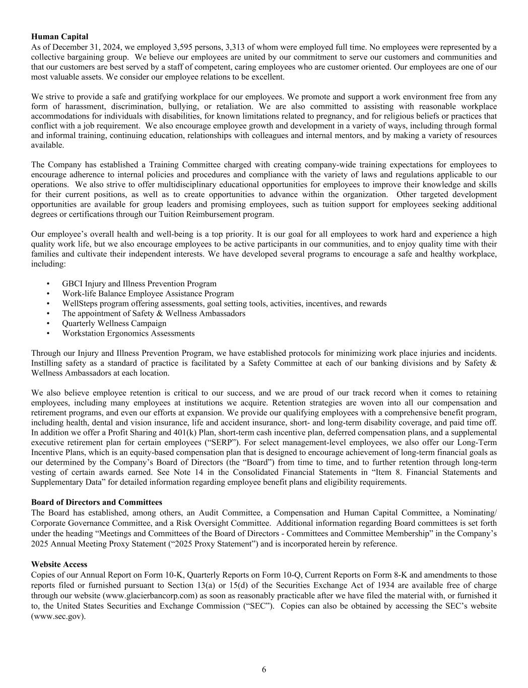 Human Capital As of December 31, 2024, we employed 3,595 persons, 3,313 of whom were employed full time. No employees were represented by a collective bargaining group. We believe our employees are united by our commitment to serve our customers and communities and that our customers are best served by a staff of competent, caring employees who are customer oriented. Our employees are one of our most valuable assets. We consider our employee relations to be excellent. We strive to provide a safe and gratifying workplace for our employees. We promote and support a work environment free from any form of harassment, discrimination, bullying, or retaliation. We are also committed to assisting with reasonable workplace accommodations for individuals with disabilities, for known limitations related to pregnancy, and for religious beliefs or practices that conflict with a job requirement. We also encourage employee growth and development in a variety of ways, including through formal and informal training, continuing education, relationships with colleagues and internal mentors, and by making a variety of resources available. The Company has established a Training Committee charged with creating company-wide training expectations for employees to encourage adherence to internal policies and procedures and compliance with the variety of laws and regulations applicable to our operations. We also strive to offer multidisciplinary educational opportunities for employees to improve their knowledge and skills for their current positions, as well as to create opportunities to advance within the organization. Other targeted development opportunities are available for group leaders and promising employees, such as tuition support for employees seeking additional degrees or certifications through our Tuition Reimbursement program. Our employee’s overall health and well-being is a top priority. It is our goal for all employees to work hard and experience a high quality work life, but we also encourage employees to be active participants in our communities, and to enjoy quality time with their families and cultivate their independent interests. We have developed several programs to encourage a safe and healthy workplace, including: • GBCI Injury and Illness Prevention Program • Work-life Balance Employee Assistance Program • WellSteps program offering assessments, goal setting tools, activities, incentives, and rewards • The appointment of Safety & Wellness Ambassadors • Quarterly Wellness Campaign • Workstation Ergonomics Assessments Through our Injury and Illness Prevention Program, we have established protocols for minimizing work place injuries and incidents. Instilling safety as a standard of practice is facilitated by a Safety Committee at each of our banking divisions and by Safety & Wellness Ambassadors at each location. We also believe employee retention is critical to our success, and we are proud of our track record when it comes to retaining employees, including many employees at institutions we acquire. Retention strategies are woven into all our compensation and retirement programs, and even our efforts at expansion. We provide our qualifying employees with a comprehensive benefit program, including health, dental and vision insurance, life and accident insurance, short- and long-term disability coverage, and paid time off. In addition we offer a Profit Sharing and 401(k) Plan, short-term cash incentive plan, deferred compensation plans, and a supplemental executive retirement plan for certain employees (“SERP”). For select management-level employees, we also offer our Long-Term Incentive Plans, which is an equity-based compensation plan that is designed to encourage achievement of long-term financial goals as our determined by the Company’s Board of Directors (the “Board”) from time to time, and to further retention through long-term vesting of certain awards earned. See Note 14 in the Consolidated Financial Statements in “Item 8. Financial Statements and Supplementary Data” for detailed information regarding employee benefit plans and eligibility requirements. Board of Directors and Committees The Board has established, among others, an Audit Committee, a Compensation and Human Capital Committee, a Nominating/ Corporate Governance Committee, and a Risk Oversight Committee. Additional information regarding Board committees is set forth under the heading “Meetings and Committees of the Board of Directors - Committees and Committee Membership” in the Company’s 2025 Annual Meeting Proxy Statement (“2025 Proxy Statement”) and is incorporated herein by reference. Website Access Copies of our Annual Report on Form 10-K, Quarterly Reports on Form 10-Q, Current Reports on Form 8-K and amendments to those reports filed or furnished pursuant to Section 13(a) or 15(d) of the Securities Exchange Act of 1934 are available free of charge through our website (www.glacierbancorp.com) as soon as reasonably practicable after we have filed the material with, or furnished it to, the United States Securities and Exchange Commission (“SEC”). Copies can also be obtained by accessing the SEC’s website (www.sec.gov). 6