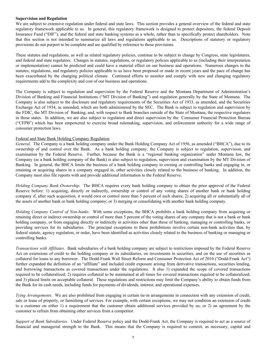Supervision and Regulation We are subject to extensive regulation under federal and state laws. This section provides a general overview of the federal and state regulatory framework applicable to us. In general, this regulatory framework is designed to protect depositors, the federal Deposit Insurance Fund (“DIF”), and the federal and state banking systems as a whole, rather than to specifically protect shareholders. Note that this section is not intended to summarize all laws and regulations applicable to us. Descriptions of statutory or regulatory provisions do not purport to be complete and are qualified by reference to those provisions. These statutes and regulations, as well as related regulatory policies, continue to be subject to change by Congress, state legislatures, and federal and state regulators. Changes in statutes, regulations, or regulatory policies applicable to us (including their interpretation or implementation) cannot be predicted and could have a material effect on our business and operations. Numerous changes to the statutes, regulations, and regulatory policies applicable to us have been proposed or made in recent years and the pace of change has been exacerbated by the changing political climate. Continued efforts to monitor and comply with new and changing regulatory requirements add to the complexity and cost of our business and operations. The Company is subject to regulation and supervision by the Federal Reserve and the Montana Department of Administration’s Division of Banking and Financial Institutions (“MT Division of Banking”) and regulation generally by the State of Montana. The Company is also subject to the disclosure and regulatory requirements of the Securities Act of 1933, as amended, and the Securities Exchange Act of 1934, as amended, which are both administered by the SEC. The Bank is subject to regulation and supervision by the FDIC, the MT Division of Banking, and, with respect to Bank branches outside of the State of Montana, the respective regulators in those states. In addition, we are also subject to regulation and direct supervision by the Consumer Financial Protection Bureau (“CFPB”) which has been empowered to exercise broad rulemaking, supervision, and enforcement authority for a wide range of consumer protection laws. Federal and State Bank Holding Company Regulation General. The Company is a bank holding company under the Bank Holding Company Act of 1956, as amended (“BHCA”), due to its ownership of and control over the Bank. As a bank holding company, the Company is subject to regulation, supervision, and examination by the Federal Reserve. Further, because the Bank is a “regional banking organization” under Montana law, the Company (as a bank holding company of the Bank) is also subject to regulation, supervision and examination by the MT Division of Banking. In general, the BHCA limits the business of a bank holding company to owning or controlling banks and engaging in, or retaining or acquiring shares in a company engaged in, other activities closely related to the business of banking. In addition, the Company must also file reports with and provide additional information to the Federal Reserve. Holding Company Bank Ownership. The BHCA requires every bank holding company to obtain the prior approval of the Federal Reserve before: 1) acquiring, directly or indirectly, ownership or control of any voting shares of another bank or bank holding company if, after such acquisition, it would own or control more than 5 percent of such shares; 2) acquiring all or substantially all of the assets of another bank or bank holding company; or 3) merging or consolidating with another bank holding company. Holding Company Control of Non-banks. With some exceptions, the BHCA prohibits a bank holding company from acquiring or retaining direct or indirect ownership or control of more than 5 percent of the voting shares of any company that is not a bank or bank holding company, or from engaging directly or indirectly in activities other than those of banking, managing or controlling banks, or providing services for its subsidiaries. The principal exceptions to these prohibitions involve certain non-bank activities that, by federal statute, agency regulation, or order, have been identified as activities closely related to the business of banking or managing or controlling banks. Transactions with Affiliates. Bank subsidiaries of a bank holding company are subject to restrictions imposed by the Federal Reserve Act on extensions of credit to the holding company or its subsidiaries, on investments in securities, and on the use of securities as collateral for loans to any borrower. The Dodd-Frank Wall Street Reform and Consumer Protection Act of 2010 (“Dodd-Frank Act”) further expanded the definition of an “affiliate” and included credit exposure arising from derivative transactions, securities lending, and borrowing transactions as covered transactions under the regulations. It also 1) expanded the scope of covered transactions required to be collateralized; 2) requires collateral to be maintained at all times for covered transactions required to be collateralized; and 3) placed limits on acceptable collateral. These regulations and restrictions may limit the Company’s ability to obtain funds from the Bank for its cash needs, including funds for payments of dividends, interest, and operational expenses. Tying Arrangements. We are also prohibited from engaging in certain tie-in arrangements in connection with any extension of credit, sale or lease of property, or furnishing of services. For example, with certain exceptions, we may not condition an extension of credit to a customer on either 1) a requirement that the customer obtain additional services provided by us; or 2) an agreement by the customer to refrain from obtaining other services from a competitor. Support of Bank Subsidiaries. Under Federal Reserve policy and