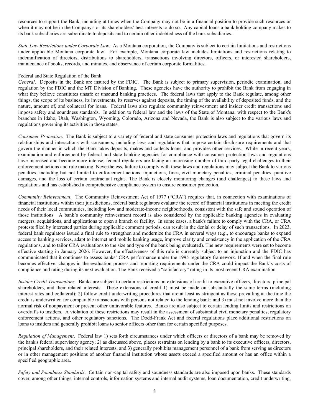 resources to support the Bank, including at times when the Company may not be in a financial position to provide such resources or when it may not be in the Company's or its shareholders' best interests to do so. Any capital loans a bank holding company makes to its bank subsidiaries are subordinate to deposits and to certain other indebtedness of the bank subsidiaries. State Law Restrictions under Corporate Law. As a Montana corporation, the Company is subject to certain limitations and restrictions under applicable Montana corporate law. For example, Montana corporate law includes limitations and restrictions relating to indemnification of directors, distributions to shareholders, transactions involving directors, officers, or interested shareholders, maintenance of books, records, and minutes, and observance of certain corporate formalities. Federal and State Regulation of the Bank General. Deposits in the Bank are insured by the FDIC. The Bank is subject to primary supervision, periodic examination, and regulation by the FDIC and the MT Division of Banking. These agencies have the authority to prohibit the Bank from engaging in what they believe constitutes unsafe or unsound banking practices. The federal laws that apply to the Bank regulate, among other things, the scope of its business, its investments, its reserves against deposits, the timing of the availability of deposited funds, and the nature, amount of, and collateral for loans. Federal laws also regulate community reinvestment and insider credit transactions and impose safety and soundness standards. In addition to federal law and the laws of the State of Montana, with respect to the Bank's branches in Idaho, Utah, Washington, Wyoming, Colorado, Arizona and Nevada, the Bank is also subject to the various laws and regulations governing its activities in those states. Consumer Protection. The Bank is subject to a variety of federal and state consumer protection laws and regulations that govern its relationships and interactions with consumers, including laws and regulations that impose certain disclosure requirements and that govern the manner in which the Bank takes deposits, makes and collects loans, and provides other services. While in recent years, examination and enforcement by federal and state banking agencies for compliance with consumer protection laws and regulations have increased and become more intense, federal regulators are facing an increasing number of third-party legal challenges to their enforcement actions and rule making. Nevertheless, failure to comply with these laws and regulations may subject the Bank to various penalties, including but not limited to enforcement actions, injunctions, fines, civil monetary penalties, criminal penalties, punitive damages, and the loss of certain contractual rights. The Bank is closely monitoring changes (and challenges) to these laws and regulations and has established a comprehensive compliance system to ensure consumer protection. Community Reinvestment. The Community Reinvestment Act of 1977 (“CRA”) requires that, in connection with examinations of financial institutions within their jurisdictions, federal bank regulators evaluate the record of financial institutions in meeting the credit needs of their local communities, including low and moderate-income neighborhoods, consistent with the safe and sound operation of those institutions. A bank’s community reinvestment record is also considered by the applicable banking agencies in evaluating mergers, acquisitions, and applications to open a branch or facility. In some cases, a bank's failure to comply with the CRA, or CRA protests filed by interested parties during applicable comment periods, can result in the denial or delay of such transactions. In 2023, federal bank regulators issued a final rule to strengthen and modernize the CRA in several ways (e.g., to encourage banks to expand access to banking services, adapt to internet and mobile banking usage, improve clarity and consistency in the application of the CRA regulations, and to tailor CRA evaluations to the size and type of the bank being evaluated). The new requirements were set to become effective starting in January 2026. However, the effectiveness of this rule is currently subject to an injunction and the FDIC has communicated that it continues to assess banks’ CRA performance under the 1995 regulatory framework. If and when the final rule becomes effective, changes in the evaluation process and reporting requirements under the CRA could impact the Bank’s costs of compliance and rating during its next evaluation. The Bank received a “satisfactory” rating in its most recent CRA examination. Insider Credit Transactions. Banks are subject to certain restrictions on extensions of credit to executive officers, directors, principal shareholders, and their related interests. These extensions of credit 1) must be made on substantially the same terms (including interest rates and collateral); 2) follow credit underwriting procedures that are at least as stringent as those prevailing at the time the credit is underwritten for comparable transactions with persons not related to the lending bank; and 3) must not involve more than the normal risk of nonpayment or present other unfavorable features. Banks are also subject to certain lending limits and restrictions on overdrafts to insiders. A violation of these restrictions may result in the assessment of substantial civil monetary penalties, regulatory enforcement actions, and other regulatory sanctions. The Dodd-Frank Act and federal regulations place additional restrictions on loans to insiders and generally prohibit loans to senior officers other than for certain specified purposes. Regulation of Management. Federal law 1) sets forth circumstances under which officers or directors of a bank may be removed by the bank's federal supervisory agency; 2) as discussed above, places restraints on lending 