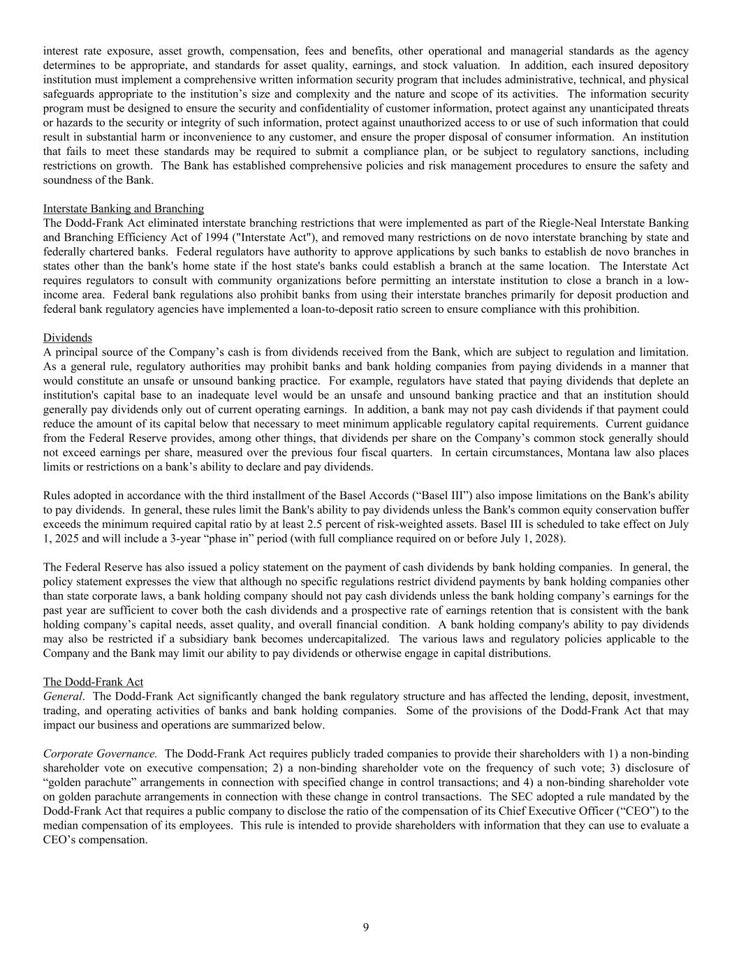 interest rate exposure, asset growth, compensation, fees and benefits, other operational and managerial standards as the agency determines to be appropriate, and standards for asset quality, earnings, and stock valuation. In addition, each insured depository institution must implement a comprehensive written information security program that includes administrative, technical, and physical safeguards appropriate to the institution’s size and complexity and the nature and scope of its activities. The information security program must be designed to ensure the security and confidentiality of customer information, protect against any unanticipated threats or hazards to the security or integrity of such information, protect against unauthorized access to or use of such information that could result in substantial harm or inconvenience to any customer, and ensure the proper disposal of consumer information. An institution that fails to meet these standards may be required to submit a compliance plan, or be subject to regulatory sanctions, including restrictions on growth. The Bank has established comprehensive policies and risk management procedures to ensure the safety and soundness of the Bank. Interstate Banking and Branching The Dodd-Frank Act eliminated interstate branching restrictions that were implemented as part of the Riegle-Neal Interstate Banking and Branching Efficiency Act of 1994 ("Interstate Act"), and removed many restrictions on de novo interstate branching by state and federally chartered banks. Federal regulators have authority to approve applications by such banks to establish de novo branches in states other than the bank's home state if the host state's banks could establish a branch at the same location. The Interstate Act requires regulators to consult with community organizations before permitting an interstate institution to close a branch in a low- income area. Federal bank regulations also prohibit banks from using their interstate branches primarily for deposit production and federal bank regulatory agencies have implemented a loan-to-deposit ratio screen to ensure compliance with this prohibition. Dividends A principal source of the Company’s cash is from dividends received from the Bank, which are subject to regulation and limitation. As a general rule, regulatory authorities may prohibit banks and bank holding companies from paying dividends in a manner that would constitute an unsafe or unsound banking practice. For example, regulators have stated that paying dividends that deplete an institution's capital base to an inadequate level would be an unsafe and unsound banking practice and that an institution should generally pay dividends only out of current operating earnings. In addition, a bank may not pay cash dividends if that payment could reduce the amount of its capital below that necessary to meet minimum applicable regulatory capital requirements. Current guidance from the Federal Reserve provides, among other things, that dividends per share on the Company’s common stock generally should not exceed earnings per share, measured over the previous four fiscal quarters. In certain circumstances, Montana law also places limits or restrictions on a bank’s ability to declare and pay dividends. Rules adopted in accordance with the third installment of the Basel Accords (“Basel III”) also impose limitations on the Bank's ability to pay dividends. In general, these rules limit the Bank's ability to pay dividends unless the Bank's common equity conservation buffer exceeds the minimum required capital ratio by at least 2.5 percent of risk-weighted assets. Basel III is scheduled to take effect on July 1, 2025 and will include a 3-year “phase in” period (with full compliance required on or before July 1, 2028). The Federal Reserve has also issued a policy statement on the payment of cash dividends by bank holding companies. In general, the policy statement expresses the view that although no specific regulations restrict dividend payments by bank holding companies other than state corporate laws, a bank holding company should not pay cash dividends unless the bank holding company’s earnings for the past year are sufficient to cover both the cash dividends and a prospective rate of earnings retention that is consistent with the bank holding company’s capital needs, asset quality, and overall financial condition. A bank holding company's ability to pay dividends may also be restricted if a subsidiary bank becomes undercapitalized. The various laws and regulatory policies applicable to the Company and the Bank may limit our ability to pay dividends or otherwise engage in capital distributions. The Dodd-Frank Act General. The Dodd-Frank Act significantly changed the bank regulatory structure and has affected the lending, deposit, investment, trading, and operating activities of banks and bank holding companies. Some of the provisions of the Dodd-Frank Act that may impact our business and operations are summarized below. Corporate Governance. The Dodd-Frank Act requires publicly traded companies to provide their shareholders with 1) a non-binding shareholder vote on executive compensation; 2) a non-binding shareholder vote on the frequency of such vote; 3) disclosure of “golden parachute” arrangements in connection with specified change in control transactions; and 4) a non-binding shareholder vote on golden parachute arrangements in connection with these change in control transactions. The SEC adopted a rule mandated by the Dodd-Frank Act that requires a public company to disclose the ratio of the compensation of its Chief Executive Officer (“CEO”) to the median compensation of its employees. This rule is intended to provide shareholders with information that they can use to evaluate a CEO’s compensation. 9