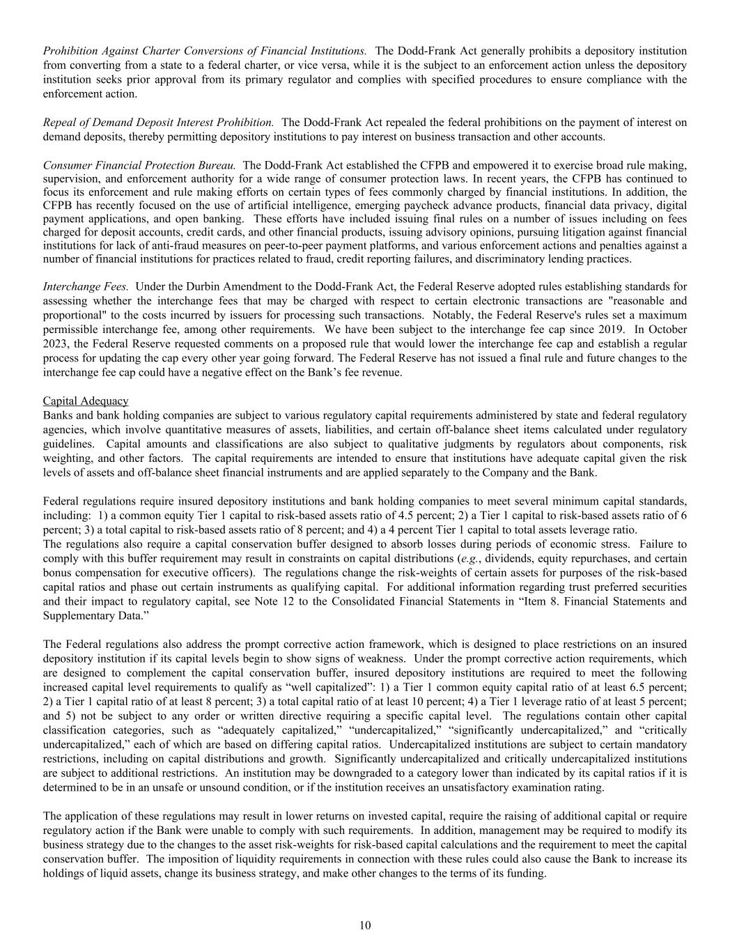 Prohibition Against Charter Conversions of Financial Institutions. The Dodd-Frank Act generally prohibits a depository institution from converting from a state to a federal charter, or vice versa, while it is the subject to an enforcement action unless the depository institution seeks prior approval from its primary regulator and complies with specified procedures to ensure compliance with the enforcement action. Repeal of Demand Deposit Interest Prohibition. The Dodd-Frank Act repealed the federal prohibitions on the payment of interest on demand deposits, thereby permitting depository institutions to pay interest on business transaction and other accounts. Consumer Financial Protection Bureau. The Dodd-Frank Act established the CFPB and empowered it to exercise broad rule making, supervision, and enforcement authority for a wide range of consumer protection laws. In recent years, the CFPB has continued to focus its enforcement and rule making efforts on certain types of fees commonly charged by financial institutions. In addition, the CFPB has recently focused on the use of artificial intelligence, emerging paycheck advance products, financial data privacy, digital payment applications, and open banking. These efforts have included issuing final rules on a number of issues including on fees charged for deposit accounts, credit cards, and other financial products, issuing advisory opinions, pursuing litigation against financial institutions for lack of anti-fraud measures on peer-to-peer payment platforms, and various enforcement actions and penalties against a number of financial institutions for practices related to fraud, credit reporting failures, and discriminatory lending practices. Interchange Fees. Under the Durbin Amendment to the Dodd-Frank Act, the Federal Reserve adopted rules establishing standards for assessing whether the interchange fees that may be charged with respect to certain electronic transactions are "reasonable and proportional" to the costs incurred by issuers for processing such transactions. Notably, the Federal Reserve's rules set a maximum permissible interchange fee, among other requirements. We have been subject to the interchange fee cap since 2019. In October 2023, the Federal Reserve requested comments on a proposed rule that would lower the interchange fee cap and establish a regular process for updating the cap every other year going forward. The Federal Reserve has not issued a final rule and future changes to the interchange fee cap could have a negative effect on the Bank’s fee revenue. Capital Adequacy Banks and bank holding companies are subject to various regulatory capital requirements administered by state and federal regulatory agencies, which involve quantitative measures of assets, liabilities, and certain off-balance sheet items calculated under regulatory guidelines. Capital amounts and classifications are also subject to qualitative judgments by regulators about components, risk weighting, and other factors. The capital requirements are intended to ensure that institutions have adequate capital given the risk levels of assets and off-balance sheet financial instruments and are applied separately to the Company and the Bank. Federal regulations require insured depository institutions and bank holding companies to meet several minimum capital standards, including: 1) a common equity Tier 1 capital to risk-based assets ratio of 4.5 percent; 2) a Tier 1 capital to risk-based assets ratio of 6 percent; 3) a total capital to risk-based assets ratio of 8 percent; and 4) a 4 percent Tier 1 capital to total assets leverage ratio. The regulations also require a capital conservation buffer designed to absorb losses during periods of economic stress. Failure to comply with this buffer requirement may result in constraints on capital distributions (e.g., dividends, equity repurchases, and certain bonus compensation for executive officers). The regulations change the risk-weights of certain assets for purposes of the risk-based capital ratios and phase out certain instruments as qualifying capital. For additional information regarding trust preferred securities and their impact to regulatory capital, see Note 12 to the Consolidated Financial Statements in “Item 8. Financial Statements and Supplementary Data.” The Federal regulations also address the prompt corrective action framework, which is designed to place restrictions on an insured depository institution if its capital levels begin to show signs of weakness. Under the prompt corrective action requirements, which are designed to complement the capital conservation buffer, insured depository institutions are required to meet the following increased capital level requirements to qualify as “well capitalized”: 1) a Tier 1 common equity capital ratio of at least 6.5 percent; 2) a Tier 1 capital ratio of at least 8 percent; 3) a total capital ratio of at least 10 percent; 4) a Tier 1 leverage ratio of at least 5 percent; and 5) not be subject to any order or written directive requiring a specific capital level. The regulations contain other capital classification categories, such as “adequately capitalized,” “undercapitalized,” “significantly undercapitalized,” and “critically undercapitalized,” each of which are based on differing capital ratios. Undercapitalized institutions are subject to certain mandatory restrictions, including on capital distributions and growth. Significantly undercapitalized and critically undercapitalized institutions are subject to additional restrictions. An institution may be downgraded to a category lower than indicated by its capital ratios if it is determined to be in an unsafe or unsound condition, or if the institution receives an unsatisfactory examination rating. The application of these regulations may result in lower returns on invested capital, require the raising of additional capital or require regulatory action if the Bank were unabl