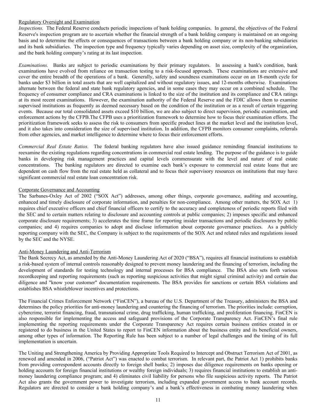 Regulatory Oversight and Examination Inspections. The Federal Reserve conducts periodic inspections of bank holding companies. In general, the objectives of the Federal Reserve's inspection program are to ascertain whether the financial strength of a bank holding company is maintained on an ongoing basis and to determine the effects or consequences of transactions between a bank holding company or its non-banking subsidiaries and its bank subsidiaries. The inspection type and frequency typically varies depending on asset size, complexity of the organization, and the bank holding company’s rating at its last inspection. Examinations. Banks are subject to periodic examinations by their primary regulators. In assessing a bank's condition, bank examinations have evolved from reliance on transaction testing to a risk-focused approach. These examinations are extensive and cover the entire breadth of the operations of a bank. Generally, safety and soundness examinations occur on an 18-month cycle for banks under $3 billion in total assets that are well capitalized and without regulatory issues, and 12-months otherwise. Examinations alternate between the federal and state bank regulatory agencies, and in some cases they may occur on a combined schedule. The frequency of consumer compliance and CRA examinations is linked to the size of the institution and its compliance and CRA ratings at its most recent examinations. However, the examination authority of the Federal Reserve and the FDIC allows them to examine supervised institutions as frequently as deemed necessary based on the condition of the institution or as a result of certain triggering events. Because our total consolidated assets exceed $10 billion, we are also subject to direct supervision, periodic examination, and enforcement actions by the CFPB.The CFPB uses a prioritization framework to determine how to focus their examination efforts. The prioritization framework seeks to assess the risk to consumers from specific product lines at the market level and the institution level, and it also takes into consideration the size of supervised institution. In addition, the CFPB monitors consumer complaints, referrals from other agencies, and market intelligence to determine where to focus their enforcement efforts. Commercial Real Estate Ratios. The federal banking regulators have also issued guidance reminding financial institutions to reexamine the existing regulations regarding concentrations in commercial real estate lending. The purpose of the guidance is to guide banks in developing risk management practices and capital levels commensurate with the level and nature of real estate concentrations. The banking regulators are directed to examine each bank’s exposure to commercial real estate loans that are dependent on cash flow from the real estate held as collateral and to focus their supervisory resources on institutions that may have significant commercial real estate loan concentration risk. Corporate Governance and Accounting The Sarbanes-Oxley Act of 2002 (“SOX Act”) addresses, among other things, corporate governance, auditing and accounting, enhanced and timely disclosure of corporate information, and penalties for non-compliance. Among other matters, the SOX Act 1) requires chief executive officers and chief financial officers to certify to the accuracy and completeness of periodic reports filed with the SEC and to certain matters relating to disclosure and accounting controls at public companies; 2) imposes specific and enhanced corporate disclosure requirements; 3) accelerates the time frame for reporting insider transactions and periodic disclosures by public companies; and 4) requires companies to adopt and disclose information about corporate governance practices. As a publicly reporting company with the SEC, the Company is subject to the requirements of the SOX Act and related rules and regulations issued by the SEC and the NYSE. Anti-Money Laundering and Anti-Terrorism The Bank Secrecy Act, as amended by the Anti-Money Laundering Act of 2020 (“BSA”), requires all financial institutions to establish a risk-based system of internal controls reasonably designed to prevent money laundering and the financing of terrorism, including the development of standards for testing technology and internal processes for BSA compliance. The BSA also sets forth various recordkeeping and reporting requirements (such as reporting suspicious activities that might signal criminal activity) and certain due diligence and "know your customer" documentation requirements. The BSA provides for sanctions or certain BSA violations and establishes BSA whistleblower incentives and protections. The Financial Crimes Enforcement Network (“FinCEN”), a bureau of the U.S. Department of the Treasury, administers the BSA and determines the policy priorities for anti-money laundering and countering the financing of terrorism. The priorities include: corruption, cybercrime, terrorist financing, fraud, transnational crime, drug trafficking, human trafficking, and proliferation financing. FinCEN is also responsible for implementing the access and safeguard provisions of the Corporate Transparency Act. FinCEN’s final rule implementing the reporting requirements under the Corporate Transparency Act requires certain business entities created in or registered to do business in the United States to report to FinCEN information about the business entity and its beneficial owners, among other types of information. The Reporting Rule has been subject to a number of legal challenges and the timing of its full implementation is uncertain. The Uniting and Strengthening America by Providing Appropriate Tools Required to Intercept and Obstruct Terrorism Act of 2001, as renewed and amended in 2006, (“Patriot Act”) was enacted to combat terrorism. In relevant part, the Patriot Act 1) prohibits banks from providing correspondent accounts directly to foreign sh