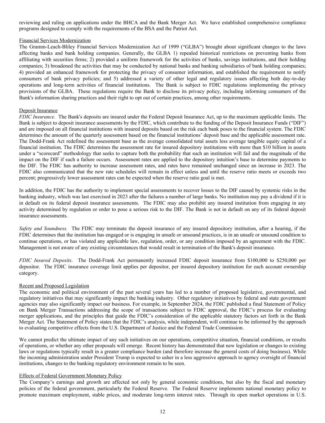 reviewing and ruling on applications under the BHCA and the Bank Merger Act. We have established comprehensive compliance programs designed to comply with the requirements of the BSA and the Patriot Act. Financial Services Modernization The Gramm-Leach-Bliley Financial Services Modernization Act of 1999 (“GLBA”) brought about significant changes to the laws affecting banks and bank holding companies. Generally, the GLBA 1) repealed historical restrictions on preventing banks from affiliating with securities firms; 2) provided a uniform framework for the activities of banks, savings institutions, and their holding companies; 3) broadened the activities that may be conducted by national banks and banking subsidiaries of bank holding companies; 4) provided an enhanced framework for protecting the privacy of consumer information, and established the requirement to notify consumers of bank privacy policies; and 5) addressed a variety of other legal and regulatory issues affecting both day-to-day operations and long-term activities of financial institutions. The Bank is subject to FDIC regulations implementing the privacy provisions of the GLBA. These regulations require the Bank to disclose its privacy policy, including informing consumers of the Bank's information sharing practices and their right to opt out of certain practices, among other requirements. Deposit Insurance FDIC Insurance. The Bank's deposits are insured under the Federal Deposit Insurance Act, up to the maximum applicable limits. The Bank is subject to deposit insurance assessments by the FDIC, which contribute to the funding of the Deposit Insurance Funds (“DIF”) and are imposed on all financial institutions with insured deposits based on the risk each bank poses to the financial system. The FDIC determines the amount of the quarterly assessment based on the financial institutions’ deposit base and the applicable assessment rate. The Dodd-Frank Act redefined the assessment base as the average consolidated total assets less average tangible equity capital of a financial institution. The FDIC determines the assessment rate for insured depository institutions with more than $10 billion in assets under a “scorecard” methodology that seeks to capture both the probability that such an institution will fail and the magnitude of the impact on the DIF if such a failure occurs. Assessment rates are applied to the depository intuition’s base to determine payments to the DIF. The FDIC has authority to increase assessment rates, and rates have remained unchanged since an increase in 2023. The FDIC also communicated that the new rate schedules will remain in effect unless and until the reserve ratio meets or exceeds two percent; progressively lower assessment rates can be expected when the reserve ratio goal is met. In addition, the FDIC has the authority to implement special assessments to recover losses to the DIF caused by systemic risks in the banking industry, which was last exercised in 2023 after the failures a number of large banks. No institution may pay a dividend if it is in default on its federal deposit insurance assessments. The FDIC may also prohibit any insured institution from engaging in any activity determined by regulation or order to pose a serious risk to the DIF. The Bank is not in default on any of its federal deposit insurance assessments. Safety and Soundness. The FDIC may terminate the deposit insurance of any insured depository institution, after a hearing, if the FDIC determines that the institution has engaged or is engaging in unsafe or unsound practices, is in an unsafe or unsound condition to continue operations, or has violated any applicable law, regulation, order, or any condition imposed by an agreement with the FDIC. Management is not aware of any existing circumstances that would result in termination of the Bank's deposit insurance. FDIC Insured Deposits. The Dodd-Frank Act permanently increased FDIC deposit insurance from $100,000 to $250,000 per depositor. The FDIC insurance coverage limit applies per depositor, per insured depository institution for each account ownership category. Recent and Proposed Legislation The economic and political environment of the past several years has led to a number of proposed legislative, governmental, and regulatory initiatives that may significantly impact the banking industry. Other regulatory initiatives by federal and state government agencies may also significantly impact our business. For example, in September 2024, the FDIC published a final Statement of Policy on Bank Merger Transactions addressing the scope of transactions subject to FDIC approval, the FDIC’s process for evaluating merger applications, and the principles that guide the FDIC’s consideration of the applicable statutory factors set forth in the Bank Merger Act. The Statement of Policy states that the FDIC’s analysis, while independent, will continue to be informed by the approach to evaluating competitive effects from the U.S. Department of Justice and the Federal Trade Commission. We cannot predict the ultimate impact of any such initiatives on our operations, competitive situation, financial conditions, or results of operations, or whether any other proposals will emerge. Recent history has demonstrated that new legislation or changes to existing laws or regulations typically result in a greater compliance burden (and therefore increase the general costs of doing business). While the incoming administration under President Trump is expected to usher in a less aggressive approach to agency oversight of financial institutions, changes to the banking regulatory environment remain to be seen. Effects of Federal Government Monetary Policy The Company’s earnings and growth are affected not only by general economic conditions, but also by the fiscal and monetary policies of the federal government, particularly the Federal Reserve. The Federal Reserve implements national 