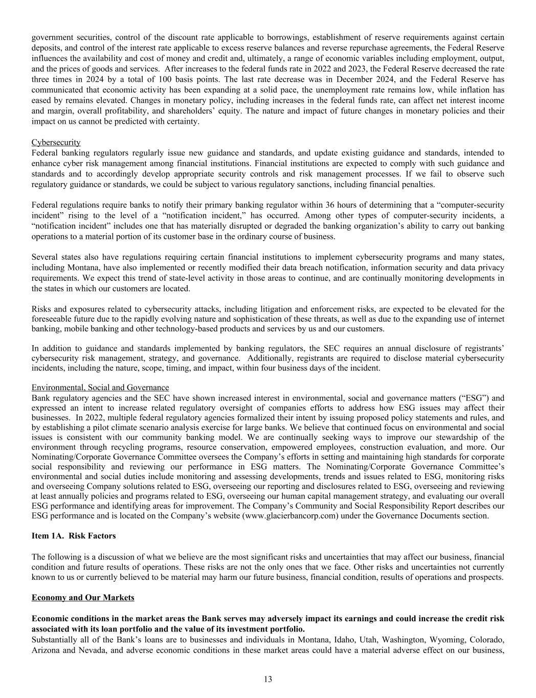 government securities, control of the discount rate applicable to borrowings, establishment of reserve requirements against certain deposits, and control of the interest rate applicable to excess reserve balances and reverse repurchase agreements, the Federal Reserve influences the availability and cost of money and credit and, ultimately, a range of economic variables including employment, output, and the prices of goods and services. After increases to the federal funds rate in 2022 and 2023, the Federal Reserve decreased the rate three times in 2024 by a total of 100 basis points. The last rate decrease was in December 2024, and the Federal Reserve has communicated that economic activity has been expanding at a solid pace, the unemployment rate remains low, while inflation has eased by remains elevated. Changes in monetary policy, including increases in the federal funds rate, can affect net interest income and margin, overall profitability, and shareholders’ equity. The nature and impact of future changes in monetary policies and their impact on us cannot be predicted with certainty. Cybersecurity Federal banking regulators regularly issue new guidance and standards, and update existing guidance and standards, intended to enhance cyber risk management among financial institutions. Financial institutions are expected to comply with such guidance and standards and to accordingly develop appropriate security controls and risk management processes. If we fail to observe such regulatory guidance or standards, we could be subject to various regulatory sanctions, including financial penalties. Federal regulations require banks to notify their primary banking regulator within 36 hours of determining that a “computer-security incident” rising to the level of a “notification incident,” has occurred. Among other types of computer-security incidents, a “notification incident” includes one that has materially disrupted or degraded the banking organization’s ability to carry out banking operations to a material portion of its customer base in the ordinary course of business. Several states also have regulations requiring certain financial institutions to implement cybersecurity programs and many states, including Montana, have also implemented or recently modified their data breach notification, information security and data privacy requirements. We expect this trend of state-level activity in those areas to continue, and are continually monitoring developments in the states in which our customers are located. Risks and exposures related to cybersecurity attacks, including litigation and enforcement risks, are expected to be elevated for the foreseeable future due to the rapidly evolving nature and sophistication of these threats, as well as due to the expanding use of internet banking, mobile banking and other technology-based products and services by us and our customers. In addition to guidance and standards implemented by banking regulators, the SEC requires an annual disclosure of registrants’ cybersecurity risk management, strategy, and governance. Additionally, registrants are required to disclose material cybersecurity incidents, including the nature, scope, timing, and impact, within four business days of the incident. Environmental, Social and Governance Bank regulatory agencies and the SEC have shown increased interest in environmental, social and governance matters (“ESG”) and expressed an intent to increase related regulatory oversight of companies efforts to address how ESG issues may affect their businesses. In 2022, multiple federal regulatory agencies formalized their intent by issuing proposed policy statements and rules, and by establishing a pilot climate scenario analysis exercise for large banks. We believe that continued focus on environmental and social issues is consistent with our community banking model. We are continually seeking ways to improve our stewardship of the environment through recycling programs, resource conservation, empowered employees, construction evaluation, and more. Our Nominating/Corporate Governance Committee oversees the Company’s efforts in setting and maintaining high standards for corporate social responsibility and reviewing our performance in ESG matters. The Nominating/Corporate Governance Committee’s environmental and social duties include monitoring and assessing developments, trends and issues related to ESG, monitoring risks and overseeing Company solutions related to ESG, overseeing our reporting and disclosures related to ESG, overseeing and reviewing at least annually policies and programs related to ESG, overseeing our human capital management strategy, and evaluating our overall ESG performance and identifying areas for improvement. The Company’s Community and Social Responsibility Report describes our ESG performance and is located on the Company’s website (www.glacierbancorp.com) under the Governance Documents section. Item 1A. Risk Factors The following is a discussion of what we believe are the most significant risks and uncertainties that may affect our business, financial condition and future results of operations. These risks are not the only ones that we face. Other risks and uncertainties not currently known to us or currently believed to be material may harm our future business, financial condition, results of operations and prospects. Economy and Our Markets Economic conditions in the market areas the Bank serves may adversely impact its earnings and could increase the credit risk associated with its loan portfolio and the value of its investment portfolio. Substantially all of the Bank’s loans are to businesses and individuals in Montana, Idaho, Utah, Washington, Wyoming, Colorado, Arizona and Nevada, and adverse economic conditions in these market areas could have a material adverse effect on our business, 13