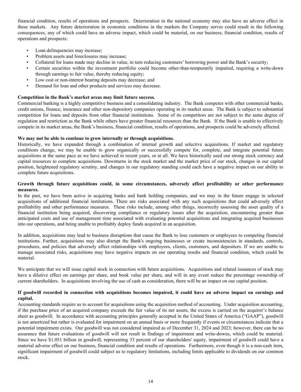 financial condition, results of operations and prospects. Deterioration in the national economy may also have an adverse effect in these markets. Any future deterioration in economic conditions in the markets the Company serves could result in the following consequences, any of which could have an adverse impact, which could be material, on our business, financial condition, results of operations and prospects: • Loan delinquencies may increase; • Problem assets and foreclosures may increase; • Collateral for loans made may decline in value, in turn reducing customers’ borrowing power and the Bank’s security; • Certain securities within the investment portfolio could become other-than-temporarily impaired, requiring a write-down through earnings to fair value, thereby reducing equity; • Low cost or non-interest bearing deposits may decrease; and • Demand for loan and other products and services may decrease. Competition in the Bank’s market areas may limit future success. Commercial banking is a highly competitive business and a consolidating industry. The Bank competes with other commercial banks, credit unions, finance, insurance and other non-depository companies operating in its market areas. The Bank is subject to substantial competition for loans and deposits from other financial institutions. Some of its competitors are not subject to the same degree of regulation and restriction as the Bank while others have greater financial resources than the Bank. If the Bank is unable to effectively compete in its market areas, the Bank’s business, financial condition, results of operations, and prospects could be adversely affected. We may not be able to continue to grow internally or through acquisitions. Historically, we have expanded through a combination of internal growth and selective acquisitions. If market and regulatory conditions change, we may be unable to grow organically or successfully compete for, complete, and integrate potential future acquisitions at the same pace as we have achieved in recent years, or at all. We have historically used our strong stock currency and capital resources to complete acquisitions. Downturns in the stock market and the market price of our stock, changes in our capital position, heightened regulatory scrutiny, and changes in our regulatory standing could each have a negative impact on our ability to complete future acquisitions. Growth through future acquisitions could, in some circumstances, adversely affect profitability or other performance measures. In the past, we have been active in acquiring banks and bank holding companies, and we may in the future engage in selected acquisitions of additional financial institutions. There are risks associated with any such acquisitions that could adversely affect profitability and other performance measures. These risks include, among other things, incorrectly assessing the asset quality of a financial institution being acquired, discovering compliance or regulatory issues after the acquisition, encountering greater than anticipated costs and use of management time associated with evaluating potential acquisitions and integrating acquired businesses into our operations, and being unable to profitably deploy funds acquired in an acquisition. In addition, acquisitions may lead to business disruptions that cause the Bank to lose customers or employees to competing financial institutions. Further, acquisitions may also disrupt the Bank's ongoing businesses or create inconsistencies in standards, controls, procedures, and policies that adversely affect relationships with employees, clients, customers, and depositors. If we are unable to manage associated risks, acquisitions may have negative impacts on our operating results and financial condition, which could be material. We anticipate that we will issue capital stock in connection with future acquisitions. Acquisitions and related issuances of stock may have a dilutive effect on earnings per share, and book value per share, and will in any event reduce the percentage ownership of current shareholders. In acquisitions involving the use of cash as consideration, there will be an impact on our capital position. If goodwill recorded in connection with acquisitions becomes impaired, it could have an adverse impact on earnings and capital. Accounting standards require us to account for acquisitions using the acquisition method of accounting. Under acquisition accounting, if the purchase price of an acquired company exceeds the fair value of its net assets, the excess is carried on the acquirer’s balance sheet as goodwill. In accordance with accounting principles generally accepted in the United States of America (“GAAP”), goodwill is not amortized but rather is evaluated for impairment on an annual basis or more frequently if events or circumstances indicate that a potential impairment exists. Our goodwill was not considered impaired as of December 31, 2024 and 2023; however, there can be no assurance that future evaluations of goodwill will not result in findings of impairment and write-downs, which could be material. Since we have $1.051 billion in goodwill, representing 33 percent of our shareholders' equity, impairment of goodwill could have a material adverse effect on our business, financial condition and results of operations. Furthermore, even though it is a non-cash item, significant impairment of goodwill could subject us to regulatory limitations, including limits applicable to dividends on our common stock. 14