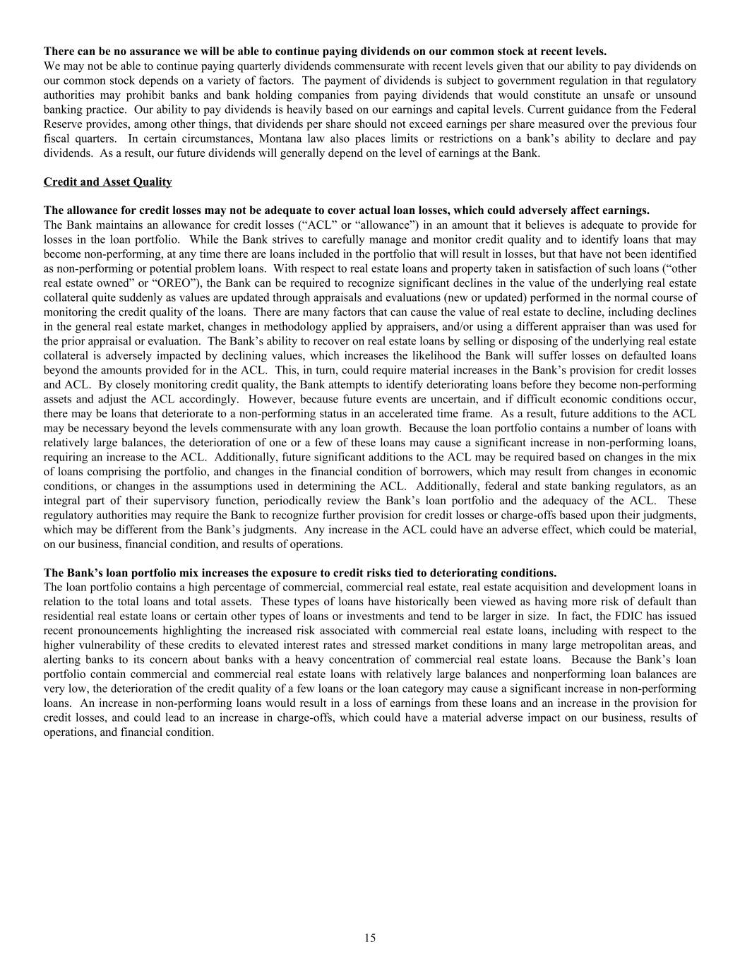 There can be no assurance we will be able to continue paying dividends on our common stock at recent levels. We may not be able to continue paying quarterly dividends commensurate with recent levels given that our ability to pay dividends on our common stock depends on a variety of factors. The payment of dividends is subject to government regulation in that regulatory authorities may prohibit banks and bank holding companies from paying dividends that would constitute an unsafe or unsound banking practice. Our ability to pay dividends is heavily based on our earnings and capital levels. Current guidance from the Federal Reserve provides, among other things, that dividends per share should not exceed earnings per share measured over the previous four fiscal quarters. In certain circumstances, Montana law also places limits or restrictions on a bank’s ability to declare and pay dividends. As a result, our future dividends will generally depend on the level of earnings at the Bank. Credit and Asset Quality The allowance for credit losses may not be adequate to cover actual loan losses, which could adversely affect earnings. The Bank maintains an allowance for credit losses (“ACL” or “allowance”) in an amount that it believes is adequate to provide for losses in the loan portfolio. While the Bank strives to carefully manage and monitor credit quality and to identify loans that may become non-performing, at any time there are loans included in the portfolio that will result in losses, but that have not been identified as non-performing or potential problem loans. With respect to real estate loans and property taken in satisfaction of such loans (“other real estate owned” or “OREO”), the Bank can be required to recognize significant declines in the value of the underlying real estate collateral quite suddenly as values are updated through appraisals and evaluations (new or updated) performed in the normal course of monitoring the credit quality of the loans. There are many factors that can cause the value of real estate to decline, including declines in the general real estate market, changes in methodology applied by appraisers, and/or using a different appraiser than was used for the prior appraisal or evaluation. The Bank’s ability to recover on real estate loans by selling or disposing of the underlying real estate collateral is adversely impacted by declining values, which increases the likelihood the Bank will suffer losses on defaulted loans beyond the amounts provided for in the ACL. This, in turn, could require material increases in the Bank’s provision for credit losses and ACL. By closely monitoring credit quality, the Bank attempts to identify deteriorating loans before they become non-performing assets and adjust the ACL accordingly. However, because future events are uncertain, and if difficult economic conditions occur, there may be loans that deteriorate to a non-performing status in an accelerated time frame. As a result, future additions to the ACL may be necessary beyond the levels commensurate with any loan growth. Because the loan portfolio contains a number of loans with relatively large balances, the deterioration of one or a few of these loans may cause a significant increase in non-performing loans, requiring an increase to the ACL. Additionally, future significant additions to the ACL may be required based on changes in the mix of loans comprising the portfolio, and changes in the financial condition of borrowers, which may result from changes in economic conditions, or changes in the assumptions used in determining the ACL. Additionally, federal and state banking regulators, as an integral part of their supervisory function, periodically review the Bank’s loan portfolio and the adequacy of the ACL. These regulatory authorities may require the Bank to recognize further provision for credit losses or charge-offs based upon their judgments, which may be different from the Bank’s judgments. Any increase in the ACL could have an adverse effect, which could be material, on our business, financial condition, and results of operations. The Bank’s loan portfolio mix increases the exposure to credit risks tied to deteriorating conditions. The loan portfolio contains a high percentage of commercial, commercial real estate, real estate acquisition and development loans in relation to the total loans and total assets. These types of loans have historically been viewed as having more risk of default than residential real estate loans or certain other types of loans or investments and tend to be larger in size. In fact, the FDIC has issued recent pronouncements highlighting the increased risk associated with commercial real estate loans, including with respect to the higher vulnerability of these credits to elevated interest rates and stressed market conditions in many large metropolitan areas, and alerting banks to its concern about banks with a heavy concentration of commercial real estate loans. Because the Bank’s loan portfolio contain commercial and commercial real estate loans with relatively large balances and nonperforming loan balances are very low, the deterioration of the credit quality of a few loans or the loan category may cause a significant increase in non-performing loans. An increase in non-performing loans would result in a loss of earnings from these loans and an increase in the provision for credit losses, and could lead to an increase in charge-offs, which could have a material adverse impact on our business, results of operations, and financial condition. 15