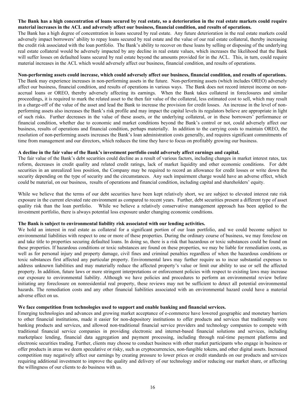 The Bank has a high concentration of loans secured by real estate, so a deterioration in the real estate markets could require material increases in the ACL and adversely affect our business, financial condition, and results of operations. The Bank has a high degree of concentration in loans secured by real estate. Any future deterioration in the real estate markets could adversely impact borrowers’ ability to repay loans secured by real estate and the value of our real estate collateral, thereby increasing the credit risk associated with the loan portfolio. The Bank’s ability to recover on these loans by selling or disposing of the underlying real estate collateral would be adversely impacted by any decline in real estate values, which increases the likelihood that the Bank will suffer losses on defaulted loans secured by real estate beyond the amounts provided for in the ACL. This, in turn, could require material increases in the ACL which would adversely affect our business, financial condition, and results of operations. Non-performing assets could increase, which could adversely affect our business, financial condition, and results of operations. The Bank may experience increases in non-performing assets in the future. Non-performing assets (which includes OREO) adversely affect our business, financial condition, and results of operations in various ways. The Bank does not record interest income on non- accrual loans or OREO, thereby adversely affecting its earnings. When the Bank takes collateral in foreclosures and similar proceedings, it is required to mark the related asset to the then fair value of the collateral, less estimated cost to sell, which may result in a charge-off of the value of the asset and lead the Bank to increase the provision for credit losses. An increase in the level of non- performing assets also increases the Bank’s risk profile and may impact the capital levels its regulators believe are appropriate in light of such risks. Further decreases in the value of these assets, or the underlying collateral, or in these borrowers’ performance or financial condition, whether due to economic and market conditions beyond the Bank’s control or not, could adversely affect our business, results of operations and financial condition, perhaps materially. In addition to the carrying costs to maintain OREO, the resolution of non-performing assets increases the Bank’s loan administration costs generally, and requires significant commitments of time from management and our directors, which reduces the time they have to focus on profitably growing our business. A decline in the fair value of the Bank’s investment portfolio could adversely affect earnings and capital. The fair value of the Bank’s debt securities could decline as a result of various factors, including changes in market interest rates, tax reform, decreases in credit quality and related credit ratings, lack of market liquidity and other economic conditions. For debt securities in an unrealized loss position, the Company may be required to record an allowance for credit losses or write down the security depending on the type of security and the circumstances. Any such impairment charge would have an adverse effect, which could be material, on our business, results of operations and financial condition, including capital and shareholders’ equity. While we believe that the terms of our debt securities have been kept relatively short, we are subject to elevated interest rate risk exposure in the current elevated rate environment as compared to recent years. Further, debt securities present a different type of asset quality risk than the loan portfolio. While we believe a relatively conservative management approach has been applied to the investment portfolio, there is always potential loss exposure under changing economic conditions. The Bank is subject to environmental liability risk associated with our lending activities. We hold an interest in real estate as collateral for a significant portion of our loan portfolio, and we could become subject to environmental liabilities with respect to one or more of these properties. During the ordinary course of business, we may foreclose on and take title to properties securing defaulted loans. In doing so, there is a risk that hazardous or toxic substances could be found on these properties. If hazardous conditions or toxic substances are found on these properties, we may be liable for remediation costs, as well as for personal injury and property damage, civil fines and criminal penalties regardless of when the hazardous conditions or toxic substances first affected any particular property. Environmental laws may further require us to incur substantial expenses to address unknown liabilities and may materially reduce the affected property’s value or limit our ability to use or sell the affected property. In addition, future laws or more stringent interpretations or enforcement policies with respect to existing laws may increase our exposure to environmental liability. Although we have policies and procedures to perform an environmental review before initiating any foreclosure on nonresidential real property, these reviews may not be sufficient to detect all potential environmental hazards. The remediation costs and any other financial liabilities associated with an environmental hazard could have a material adverse effect on us. We face competition from technologies used to support and enable banking and financial services. Emerging technologies and advances and growing market acceptance of e-commerce have lowered geographic and monetary barriers to other financial institutions, made it easier for non-depository institutions to offer products and services that traditionally were banking products and services, and allowed non-traditional financial service providers and technology companies to compete with traditional financial service companies in provid
