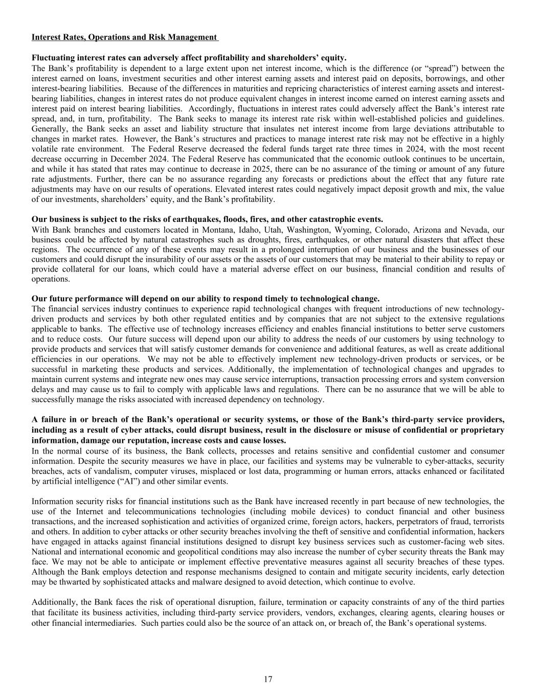 Interest Rates, Operations and Risk Management Fluctuating interest rates can adversely affect profitability and shareholders’ equity. The Bank’s profitability is dependent to a large extent upon net interest income, which is the difference (or “spread”) between the interest earned on loans, investment securities and other interest earning assets and interest paid on deposits, borrowings, and other interest-bearing liabilities. Because of the differences in maturities and repricing characteristics of interest earning assets and interest- bearing liabilities, changes in interest rates do not produce equivalent changes in interest income earned on interest earning assets and interest paid on interest bearing liabilities. Accordingly, fluctuations in interest rates could adversely affect the Bank’s interest rate spread, and, in turn, profitability. The Bank seeks to manage its interest rate risk within well-established policies and guidelines. Generally, the Bank seeks an asset and liability structure that insulates net interest income from large deviations attributable to changes in market rates. However, the Bank’s structures and practices to manage interest rate risk may not be effective in a highly volatile rate environment. The Federal Reserve decreased the federal funds target rate three times in 2024, with the most recent decrease occurring in December 2024. The Federal Reserve has communicated that the economic outlook continues to be uncertain, and while it has stated that rates may continue to decrease in 2025, there can be no assurance of the timing or amount of any future rate adjustments. Further, there can be no assurance regarding any forecasts or predictions about the effect that any future rate adjustments may have on our results of operations. Elevated interest rates could negatively impact deposit growth and mix, the value of our investments, shareholders’ equity, and the Bank’s profitability. Our business is subject to the risks of earthquakes, floods, fires, and other catastrophic events. With Bank branches and customers located in Montana, Idaho, Utah, Washington, Wyoming, Colorado, Arizona and Nevada, our business could be affected by natural catastrophes such as droughts, fires, earthquakes, or other natural disasters that affect these regions. The occurrence of any of these events may result in a prolonged interruption of our business and the businesses of our customers and could disrupt the insurability of our assets or the assets of our customers that may be material to their ability to repay or provide collateral for our loans, which could have a material adverse effect on our business, financial condition and results of operations. Our future performance will depend on our ability to respond timely to technological change. The financial services industry continues to experience rapid technological changes with frequent introductions of new technology- driven products and services by both other regulated entities and by companies that are not subject to the extensive regulations applicable to banks. The effective use of technology increases efficiency and enables financial institutions to better serve customers and to reduce costs. Our future success will depend upon our ability to address the needs of our customers by using technology to provide products and services that will satisfy customer demands for convenience and additional features, as well as create additional efficiencies in our operations. We may not be able to effectively implement new technology-driven products or services, or be successful in marketing these products and services. Additionally, the implementation of technological changes and upgrades to maintain current systems and integrate new ones may cause service interruptions, transaction processing errors and system conversion delays and may cause us to fail to comply with applicable laws and regulations. There can be no assurance that we will be able to successfully manage the risks associated with increased dependency on technology. A failure in or breach of the Bank’s operational or security systems, or those of the Bank’s third-party service providers, including as a result of cyber attacks, could disrupt business, result in the disclosure or misuse of confidential or proprietary information, damage our reputation, increase costs and cause losses. In the normal course of its business, the Bank collects, processes and retains sensitive and confidential customer and consumer information. Despite the security measures we have in place, our facilities and systems may be vulnerable to cyber-attacks, security breaches, acts of vandalism, computer viruses, misplaced or lost data, programming or human errors, attacks enhanced or facilitated by artificial intelligence (“AI”) and other similar events. Information security risks for financial institutions such as the Bank have increased recently in part because of new technologies, the use of the Internet and telecommunications technologies (including mobile devices) to conduct financial and other business transactions, and the increased sophistication and activities of organized crime, foreign actors, hackers, perpetrators of fraud, terrorists and others. In addition to cyber attacks or other security breaches involving the theft of sensitive and confidential information, hackers have engaged in attacks against financial institutions designed to disrupt key business services such as customer-facing web sites. National and international economic and geopolitical conditions may also increase the number of cyber security threats the Bank may face. We may not be able to anticipate or implement effective preventative measures against all security breaches of these types. Although the Bank employs detection and response mechanisms designed to contain and mitigate security incidents, early detection may be thwarted by sophisticated attacks and malware designed to avoid detection,