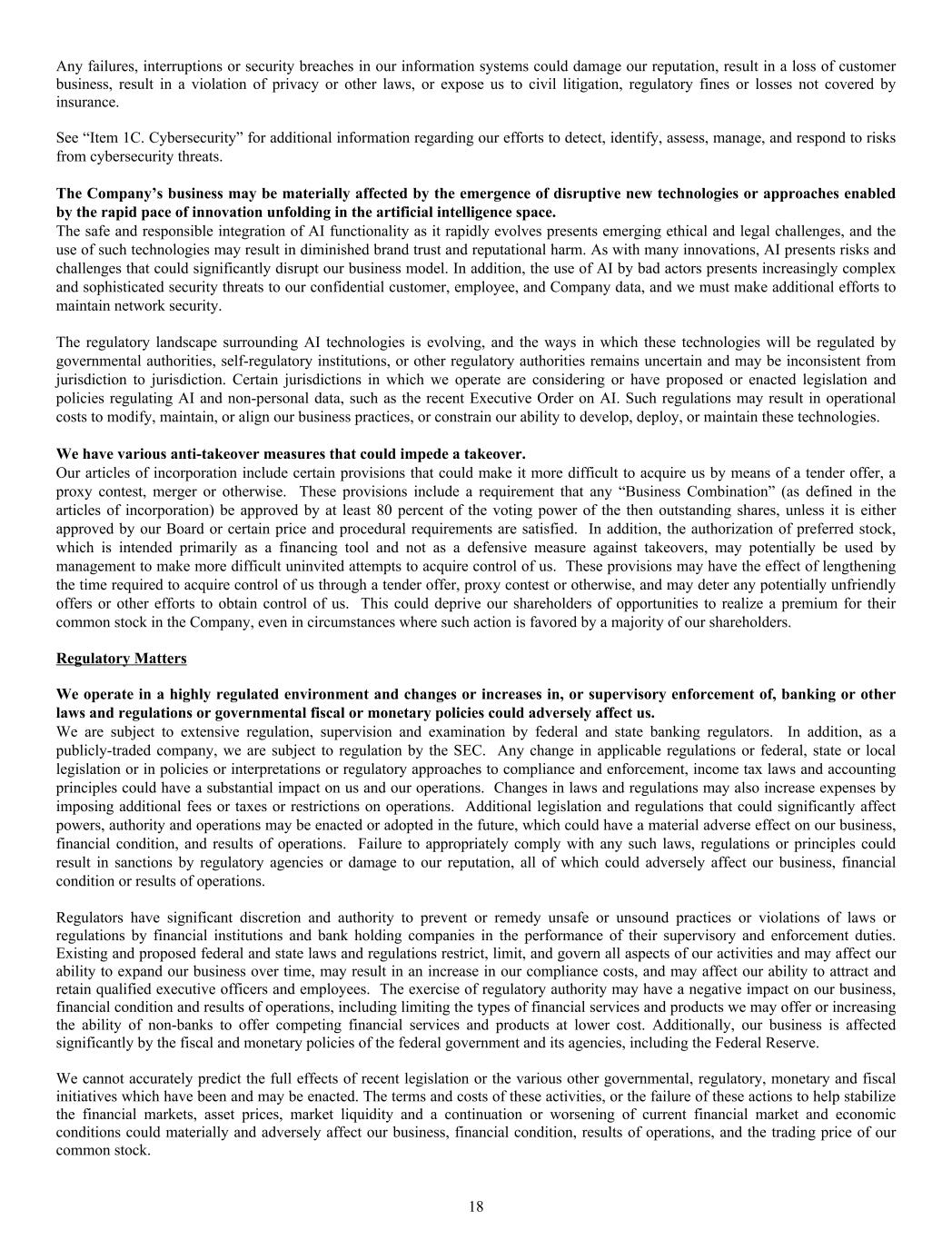Any failures, interruptions or security breaches in our information systems could damage our reputation, result in a loss of customer business, result in a violation of privacy or other laws, or expose us to civil litigation, regulatory fines or losses not covered by insurance. See “Item 1C. Cybersecurity” for additional information regarding our efforts to detect, identify, assess, manage, and respond to risks from cybersecurity threats. The Company’s business may be materially affected by the emergence of disruptive new technologies or approaches enabled by the rapid pace of innovation unfolding in the artificial intelligence space. The safe and responsible integration of AI functionality as it rapidly evolves presents emerging ethical and legal challenges, and the use of such technologies may result in diminished brand trust and reputational harm. As with many innovations, AI presents risks and challenges that could significantly disrupt our business model. In addition, the use of AI by bad actors presents increasingly complex and sophisticated security threats to our confidential customer, employee, and Company data, and we must make additional efforts to maintain network security. The regulatory landscape surrounding AI technologies is evolving, and the ways in which these technologies will be regulated by governmental authorities, self-regulatory institutions, or other regulatory authorities remains uncertain and may be inconsistent from jurisdiction to jurisdiction. Certain jurisdictions in which we operate are considering or have proposed or enacted legislation and policies regulating AI and non-personal data, such as the recent Executive Order on AI. Such regulations may result in operational costs to modify, maintain, or align our business practices, or constrain our ability to develop, deploy, or maintain these technologies. We have various anti-takeover measures that could impede a takeover. Our articles of incorporation include certain provisions that could make it more difficult to acquire us by means of a tender offer, a proxy contest, merger or otherwise. These provisions include a requirement that any “Business Combination” (as defined in the articles of incorporation) be approved by at least 80 percent of the voting power of the then outstanding shares, unless it is either approved by our Board or certain price and procedural requirements are satisfied. In addition, the authorization of preferred stock, which is intended primarily as a financing tool and not as a defensive measure against takeovers, may potentially be used by management to make more difficult uninvited attempts to acquire control of us. These provisions may have the effect of lengthening the time required to acquire control of us through a tender offer, proxy contest or otherwise, and may deter any potentially unfriendly offers or other efforts to obtain control of us. This could deprive our shareholders of opportunities to realize a premium for their common stock in the Company, even in circumstances where such action is favored by a majority of our shareholders. Regulatory Matters We operate in a highly regulated environment and changes or increases in, or supervisory enforcement of, banking or other laws and regulations or governmental fiscal or monetary policies could adversely affect us. We are subject to extensive regulation, supervision and examination by federal and state banking regulators. In addition, as a publicly-traded company, we are subject to regulation by the SEC. Any change in applicable regulations or federal, state or local legislation or in policies or interpretations or regulatory approaches to compliance and enforcement, income tax laws and accounting principles could have a substantial impact on us and our operations. Changes in laws and regulations may also increase expenses by imposing additional fees or taxes or restrictions on operations. Additional legislation and regulations that could significantly affect powers, authority and operations may be enacted or adopted in the future, which could have a material adverse effect on our business, financial condition, and results of operations. Failure to appropriately comply with any such laws, regulations or principles could result in sanctions by regulatory agencies or damage to our reputation, all of which could adversely affect our business, financial condition or results of operations. Regulators have significant discretion and authority to prevent or remedy unsafe or unsound practices or violations of laws or regulations by financial institutions and bank holding companies in the performance of their supervisory and enforcement duties. Existing and proposed federal and state laws and regulations restrict, limit, and govern all aspects of our activities and may affect our ability to expand our business over time, may result in an increase in our compliance costs, and may affect our ability to attract and retain qualified executive officers and employees. The exercise of regulatory authority may have a negative impact on our business, financial condition and results of operations, including limiting the types of financial services and products we may offer or increasing the ability of non-banks to offer competing financial services and products at lower cost. Additionally, our business is affected significantly by the fiscal and monetary policies of the federal government and its agencies, including the Federal Reserve. We cannot accurately predict the full effects of recent legislation or the various other governmental, regulatory, monetary and fiscal initiatives which have been and may be enacted. The terms and costs of these activities, or the failure of these actions to help stabilize the financial markets, asset prices, market liquidity and a continuation or worsening of current financial market and economic conditions could materially and adversely affect our business, financial condition, results of operations,
