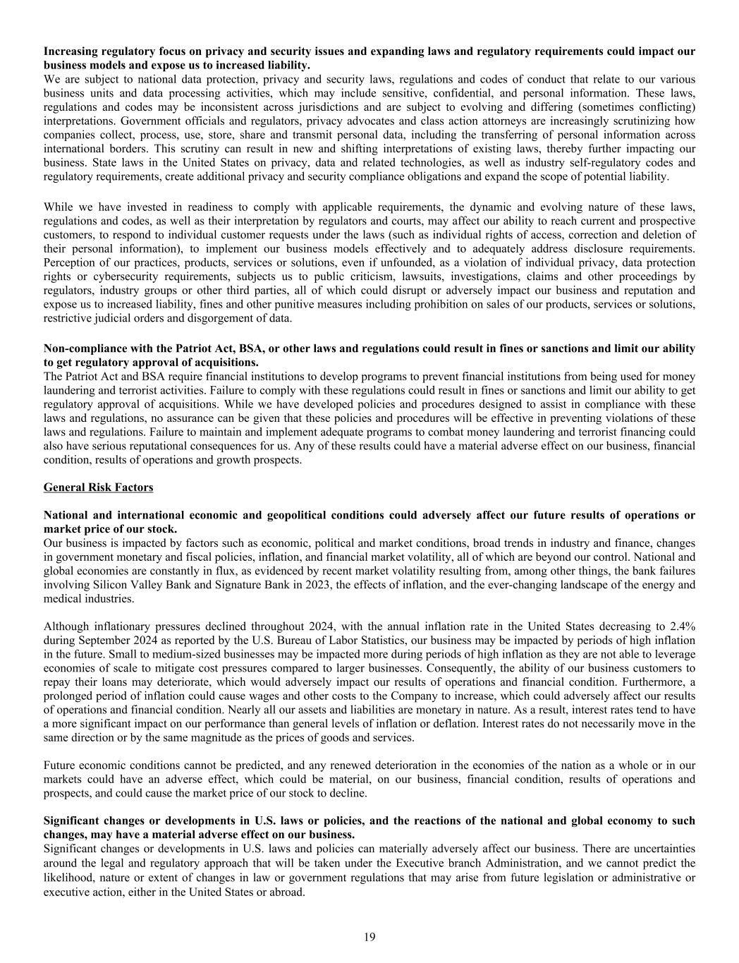 Increasing regulatory focus on privacy and security issues and expanding laws and regulatory requirements could impact our business models and expose us to increased liability. We are subject to national data protection, privacy and security laws, regulations and codes of conduct that relate to our various business units and data processing activities, which may include sensitive, confidential, and personal information. These laws, regulations and codes may be inconsistent across jurisdictions and are subject to evolving and differing (sometimes conflicting) interpretations. Government officials and regulators, privacy advocates and class action attorneys are increasingly scrutinizing how companies collect, process, use, store, share and transmit personal data, including the transferring of personal information across international borders. This scrutiny can result in new and shifting interpretations of existing laws, thereby further impacting our business. State laws in the United States on privacy, data and related technologies, as well as industry self-regulatory codes and regulatory requirements, create additional privacy and security compliance obligations and expand the scope of potential liability. While we have invested in readiness to comply with applicable requirements, the dynamic and evolving nature of these laws, regulations and codes, as well as their interpretation by regulators and courts, may affect our ability to reach current and prospective customers, to respond to individual customer requests under the laws (such as individual rights of access, correction and deletion of their personal information), to implement our business models effectively and to adequately address disclosure requirements. Perception of our practices, products, services or solutions, even if unfounded, as a violation of individual privacy, data protection rights or cybersecurity requirements, subjects us to public criticism, lawsuits, investigations, claims and other proceedings by regulators, industry groups or other third parties, all of which could disrupt or adversely impact our business and reputation and expose us to increased liability, fines and other punitive measures including prohibition on sales of our products, services or solutions, restrictive judicial orders and disgorgement of data. Non-compliance with the Patriot Act, BSA, or other laws and regulations could result in fines or sanctions and limit our ability to get regulatory approval of acquisitions. The Patriot Act and BSA require financial institutions to develop programs to prevent financial institutions from being used for money laundering and terrorist activities. Failure to comply with these regulations could result in fines or sanctions and limit our ability to get regulatory approval of acquisitions. While we have developed policies and procedures designed to assist in compliance with these laws and regulations, no assurance can be given that these policies and procedures will be effective in preventing violations of these laws and regulations. Failure to maintain and implement adequate programs to combat money laundering and terrorist financing could also have serious reputational consequences for us. Any of these results could have a material adverse effect on our business, financial condition, results of operations and growth prospects. General Risk Factors National and international economic and geopolitical conditions could adversely affect our future results of operations or market price of our stock. Our business is impacted by factors such as economic, political and market conditions, broad trends in industry and finance, changes in government monetary and fiscal policies, inflation, and financial market volatility, all of which are beyond our control. National and global economies are constantly in flux, as evidenced by recent market volatility resulting from, among other things, the bank failures involving Silicon Valley Bank and Signature Bank in 2023, the effects of inflation, and the ever-changing landscape of the energy and medical industries. Although inflationary pressures declined throughout 2024, with the annual inflation rate in the United States decreasing to 2.4% during September 2024 as reported by the U.S. Bureau of Labor Statistics, our business may be impacted by periods of high inflation in the future. Small to medium-sized businesses may be impacted more during periods of high inflation as they are not able to leverage economies of scale to mitigate cost pressures compared to larger businesses. Consequently, the ability of our business customers to repay their loans may deteriorate, which would adversely impact our results of operations and financial condition. Furthermore, a prolonged period of inflation could cause wages and other costs to the Company to increase, which could adversely affect our results of operations and financial condition. Nearly all our assets and liabilities are monetary in nature. As a result, interest rates tend to have a more significant impact on our performance than general levels of inflation or deflation. Interest rates do not necessarily move in the same direction or by the same magnitude as the prices of goods and services. Future economic conditions cannot be predicted, and any renewed deterioration in the economies of the nation as a whole or in our markets could have an adverse effect, which could be material, on our business, financial condition, results of operations and prospects, and could cause the market price of our stock to decline. Significant changes or developments in U.S. laws or policies, and the reactions of the national and global economy to such changes, may have a material adverse effect on our business. Significant changes or developments in U.S. laws and policies can materially adversely affect our business. There are uncertainties around the legal and regulatory approach that will be taken under the Executive branch Administration, and we