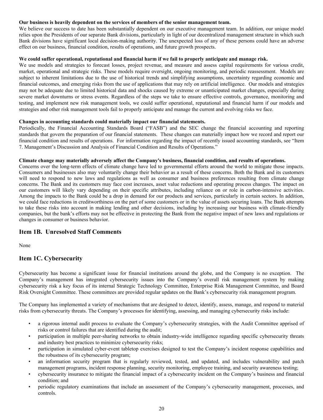 Our business is heavily dependent on the services of members of the senior management team. We believe our success to date has been substantially dependent on our executive management team. In addition, our unique model relies upon the Presidents of our separate Bank divisions, particularly in light of our decentralized management structure in which such Bank divisions have significant local decision-making authority. The unexpected loss of any of these persons could have an adverse effect on our business, financial condition, results of operations, and future growth prospects. We could suffer operational, reputational and financial harm if we fail to properly anticipate and manage risk. We use models and strategies to forecast losses, project revenue, and measure and assess capital requirements for various credit, market, operational and strategic risks. These models require oversight, ongoing monitoring, and periodic reassessment. Models are subject to inherent limitations due to the use of historical trends and simplifying assumptions, uncertainty regarding economic and financial outcomes, and emerging risks from the use of applications that may rely on artificial intelligence. Our models and strategies may not be adequate due to limited historical data and shocks caused by extreme or unanticipated market changes, especially during severe market downturns or stress events. Regardless of the steps we take to ensure effective controls, governance, monitoring and testing, and implement new risk management tools, we could suffer operational, reputational and financial harm if our models and strategies and other risk management tools fail to properly anticipate and manage the current and evolving risks we face. Changes in accounting standards could materially impact our financial statements. Periodically, the Financial Accounting Standards Board (“FASB”) and the SEC change the financial accounting and reporting standards that govern the preparation of our financial statements. These changes can materially impact how we record and report our financial condition and results of operations. For information regarding the impact of recently issued accounting standards, see “Item 7. Management’s Discussion and Analysis of Financial Condition and Results of Operations.” Climate change may materially adversely affect the Company's business, financial condition, and results of operations. Concerns over the long-term effects of climate change have led to governmental efforts around the world to mitigate those impacts. Consumers and businesses also may voluntarily change their behavior as a result of these concerns. Both the Bank and its customers will need to respond to new laws and regulations as well as consumer and business preferences resulting from climate change concerns. The Bank and its customers may face cost increases, asset value reductions and operating process changes. The impact on our customers will likely vary depending on their specific attributes, including reliance on or role in carbon-intensive activities. Among the impacts to the Bank could be a drop in demand for our products and services, particularly in certain sectors. In addition, we could face reductions in creditworthiness on the part of some customers or in the value of assets securing loans. The Bank attempts to take these risks into account in making lending and other decisions, including by increasing our business with climate-friendly companies, but the bank’s efforts may not be effective in protecting the Bank from the negative impact of new laws and regulations or changes in consumer or business behavior. Item 1B. Unresolved Staff Comments None Item 1C. Cybersecurity Cybersecurity has become a significant issue for financial institutions around the globe, and the Company is no exception. The Company’s management has integrated cybersecurity issues into the Company’s overall risk management system by making cybersecurity risk a key focus of its internal Strategic Technology Committee, Enterprise Risk Management Committee, and Board Risk Oversight Committee. These committees are provided regular updates on the Bank’s cybersecurity risk management program. The Company has implemented a variety of mechanisms that are designed to detect, identify, assess, manage, and respond to material risks from cybersecurity threats. The Company’s processes for identifying, assessing, and managing cybersecurity risks include: • a rigorous internal audit process to evaluate the Company’s cybersecurity strategies, with the Audit Committee apprised of risks or control failures that are identified during the audit; • participation in multiple peer-sharing networks to obtain industry-wide intelligence regarding specific cybersecurity threats and industry best practices to minimize cybersecurity risks; • participation in simulated cyber-event tabletop exercises designed to test the Company’s incident response capabilities and the robustness of its cybersecurity program; • an information security program that is regularly reviewed, tested, and updated, and includes vulnerability and patch management programs, incident response planning, security monitoring, employee training, and security awareness testing; • cybersecurity insurance to mitigate the financial impact of a cybersecurity incident on the Company’s business and financial condition; and • periodic regulatory examinations that include an assessment of the Company’s cybersecurity management, processes, and controls. 20