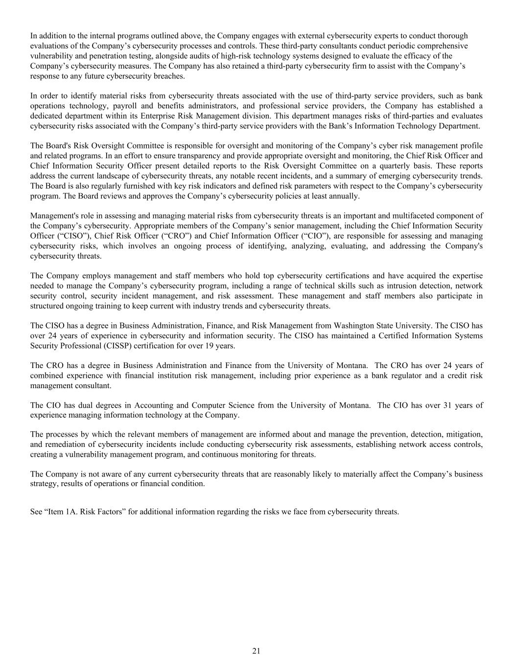 In addition to the internal programs outlined above, the Company engages with external cybersecurity experts to conduct thorough evaluations of the Company’s cybersecurity processes and controls. These third-party consultants conduct periodic comprehensive vulnerability and penetration testing, alongside audits of high-risk technology systems designed to evaluate the efficacy of the Company’s cybersecurity measures. The Company has also retained a third-party cybersecurity firm to assist with the Company’s response to any future cybersecurity breaches. In order to identify material risks from cybersecurity threats associated with the use of third-party service providers, such as bank operations technology, payroll and benefits administrators, and professional service providers, the Company has established a dedicated department within its Enterprise Risk Management division. This department manages risks of third-parties and evaluates cybersecurity risks associated with the Company’s third-party service providers with the Bank’s Information Technology Department. The Board's Risk Oversight Committee is responsible for oversight and monitoring of the Company’s cyber risk management profile and related programs. In an effort to ensure transparency and provide appropriate oversight and monitoring, the Chief Risk Officer and Chief Information Security Officer present detailed reports to the Risk Oversight Committee on a quarterly basis. These reports address the current landscape of cybersecurity threats, any notable recent incidents, and a summary of emerging cybersecurity trends. The Board is also regularly furnished with key risk indicators and defined risk parameters with respect to the Company’s cybersecurity program. The Board reviews and approves the Company’s cybersecurity policies at least annually. Management's role in assessing and managing material risks from cybersecurity threats is an important and multifaceted component of the Company’s cybersecurity. Appropriate members of the Company’s senior management, including the Chief Information Security Officer (“CISO”), Chief Risk Officer (“CRO”) and Chief Information Officer (“CIO”), are responsible for assessing and managing cybersecurity risks, which involves an ongoing process of identifying, analyzing, evaluating, and addressing the Company's cybersecurity threats. The Company employs management and staff members who hold top cybersecurity certifications and have acquired the expertise needed to manage the Company’s cybersecurity program, including a range of technical skills such as intrusion detection, network security control, security incident management, and risk assessment. These management and staff members also participate in structured ongoing training to keep current with industry trends and cybersecurity threats. The CISO has a degree in Business Administration, Finance, and Risk Management from Washington State University. The CISO has over 24 years of experience in cybersecurity and information security. The CISO has maintained a Certified Information Systems Security Professional (CISSP) certification for over 19 years. The CRO has a degree in Business Administration and Finance from the University of Montana. The CRO has over 24 years of combined experience with financial institution risk management, including prior experience as a bank regulator and a credit risk management consultant. The CIO has dual degrees in Accounting and Computer Science from the University of Montana. The CIO has over 31 years of experience managing information technology at the Company. The processes by which the relevant members of management are informed about and manage the prevention, detection, mitigation, and remediation of cybersecurity incidents include conducting cybersecurity risk assessments, establishing network access controls, creating a vulnerability management program, and continuous monitoring for threats. The Company is not aware of any current cybersecurity threats that are reasonably likely to materially affect the Company’s business strategy, results of operations or financial condition. See “Item 1A. Risk Factors” for additional information regarding the risks we face from cybersecurity threats. 21