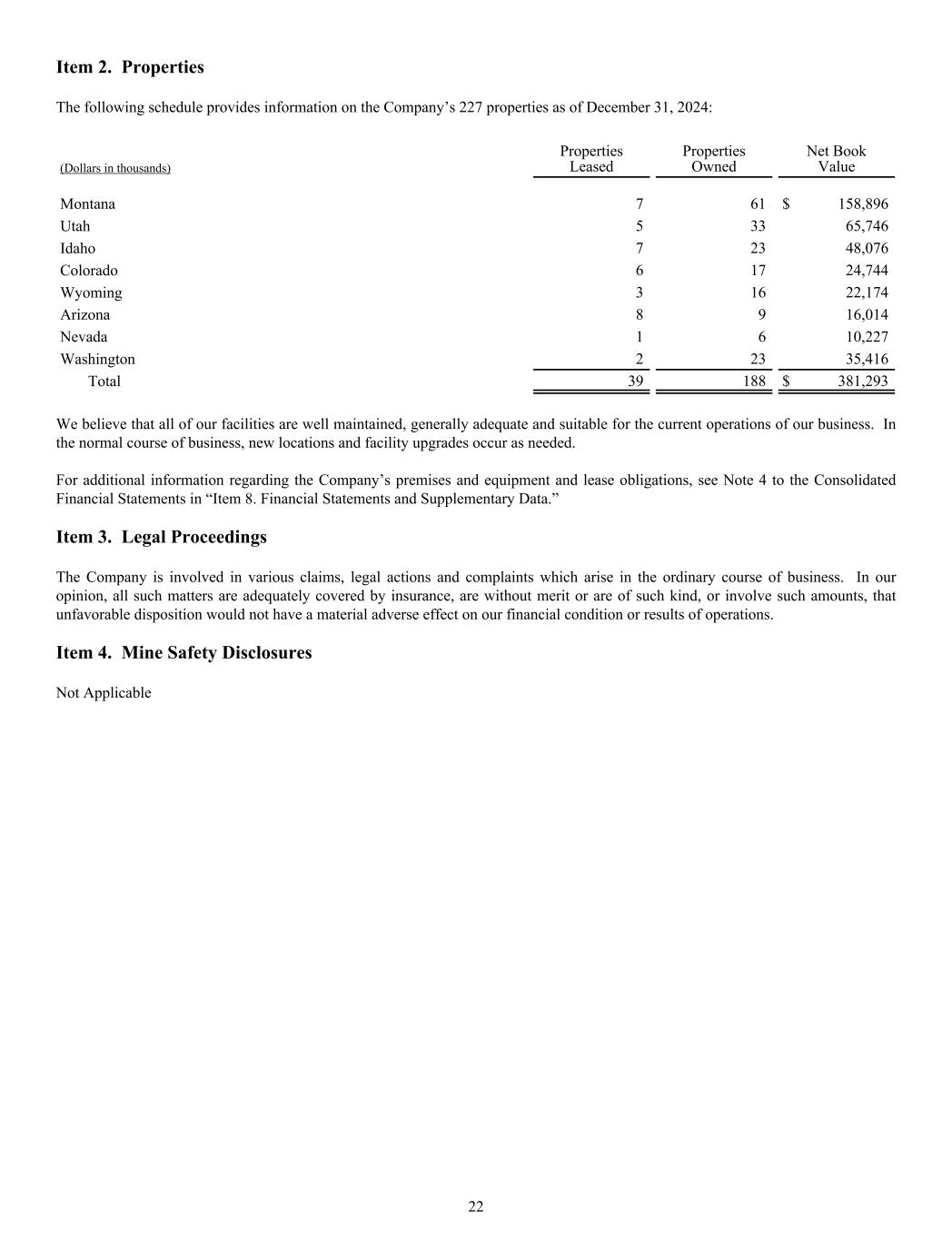 Item 2. Properties The following schedule provides information on the Company’s 227 properties as of December 31, 2024: (Dollars in thousands) Properties Leased Properties Owned Net Book Value Montana 7 61 $ 158,896 Utah 5 33 65,746 Idaho 7 23 48,076 Colorado 6 17 24,744 Wyoming 3 16 22,174 Arizona 8 9 16,014 Nevada 1 6 10,227 Washington 2 23 35,416 Total 39 188 $ 381,293 We believe that all of our facilities are well maintained, generally adequate and suitable for the current operations of our business. In the normal course of business, new locations and facility upgrades occur as needed. For additional information regarding the Company’s premises and equipment and lease obligations, see Note 4 to the Consolidated Financial Statements in “Item 8. Financial Statements and Supplementary Data.” Item 3. Legal Proceedings The Company is involved in various claims, legal actions and complaints which arise in the ordinary course of business. In our opinion, all such matters are adequately covered by insurance, are without merit or are of such kind, or involve such amounts, that unfavorable disposition would not have a material adverse effect on our financial condition or results of operations. Item 4. Mine Safety Disclosures Not Applicable 22