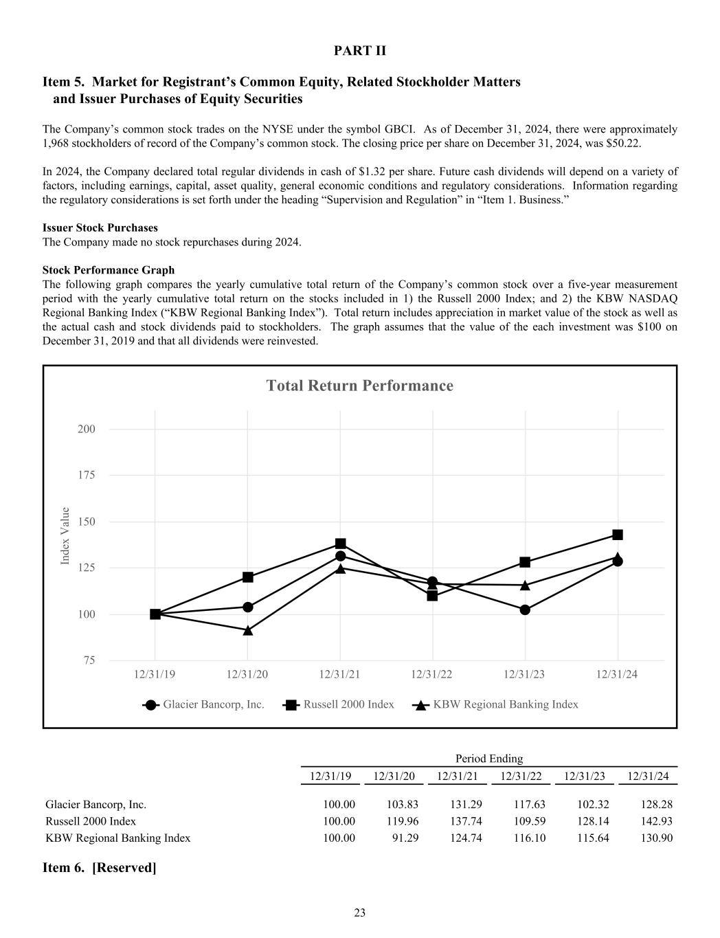 PART II Item 5. Market for Registrant’s Common Equity, Related Stockholder Matters and Issuer Purchases of Equity Securities The Company’s common stock trades on the NYSE under the symbol GBCI. As of December 31, 2024, there were approximately 1,968 stockholders of record of the Company’s common stock. The closing price per share on December 31, 2024, was $50.22. In 2024, the Company declared total regular dividends in cash of $1.32 per share. Future cash dividends will depend on a variety of factors, including earnings, capital, asset quality, general economic conditions and regulatory considerations. Information regarding the regulatory considerations is set forth under the heading “Supervision and Regulation” in “Item 1. Business.” Issuer Stock Purchases The Company made no stock repurchases during 2024. Stock Performance Graph The following graph compares the yearly cumulative total return of the Company’s common stock over a five-year measurement period with the yearly cumulative total return on the stocks included in 1) the Russell 2000 Index; and 2) the KBW NASDAQ Regional Banking Index (“KBW Regional Banking Index”). Total return includes appreciation in market value of the stock as well as the actual cash and stock dividends paid to stockholders. The graph assumes that the value of the each investment was $100 on December 31, 2019 and that all dividends were reinvested. In de x V al ue Total Return Performance Glacier Bancorp, Inc. Russell 2000 Index KBW Regional Banking Index 12/31/19 12/31/20 12/31/21 12/31/22 12/31/23 12/31/24 75 100 125 150 175 200 Period Ending 12/31/19 12/31/20 12/31/21 12/31/22 12/31/23 12/31/24 Glacier Bancorp, Inc. 100.00 103.83 131.29 117.63 102.32 128.28 Russell 2000 Index 100.00 119.96 137.74 109.59 128.14 142.93 KBW Regional Banking Index 100.00 91.29 124.74 116.10 115.64 130.90 Item 6. [Reserved] 23