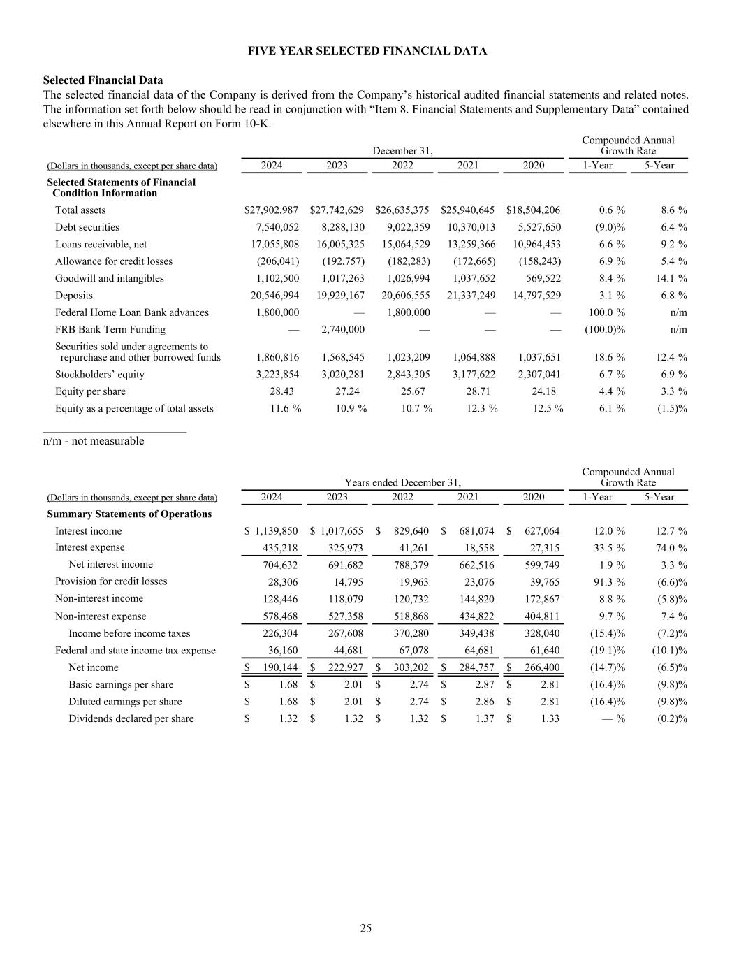 FIVE YEAR SELECTED FINANCIAL DATA Selected Financial Data The selected financial data of the Company is derived from the Company’s historical audited financial statements and related notes. The information set forth below should be read in conjunction with “Item 8. Financial Statements and Supplementary Data” contained elsewhere in this Annual Report on Form 10-K. December 31, Compounded Annual Growth Rate (Dollars in thousands, except per share data) 2024 2023 2022 2021 2020 1-Year 5-Year Selected Statements of Financial Condition Information Total assets $ 27,902,987 $ 27,742,629 $ 26,635,375 $ 25,940,645 $ 18,504,206 0.6 % 8.6 % Debt securities 7,540,052 8,288,130 9,022,359 10,370,013 5,527,650 (9.0) % 6.4 % Loans receivable, net 17,055,808 16,005,325 15,064,529 13,259,366 10,964,453 6.6 % 9.2 % Allowance for credit losses (206,041) (192,757) (182,283) (172,665) (158,243) 6.9 % 5.4 % Goodwill and intangibles 1,102,500 1,017,263 1,026,994 1,037,652 569,522 8.4 % 14.1 % Deposits 20,546,994 19,929,167 20,606,555 21,337,249 14,797,529 3.1 % 6.8 % Federal Home Loan Bank advances 1,800,000 — 1,800,000 — — 100.0 % n/m FRB Bank Term Funding — 2,740,000 — — — (100.0) % n/m Securities sold under agreements to repurchase and other borrowed funds 1,860,816 1,568,545 1,023,209 1,064,888 1,037,651 18.6 % 12.4 % Stockholders’ equity 3,223,854 3,020,281 2,843,305 3,177,622 2,307,041 6.7 % 6.9 % Equity per share 28.43 27.24 25.67 28.71 24.18 4.4 % 3.3 % Equity as a percentage of total assets 11.6 % 10.9 % 10.7 % 12.3 % 12.5 % 6.1 % (1.5) % ________________________ n/m - not measurable Years ended December 31, Compounded Annual Growth Rate (Dollars in thousands, except per share data) 2024 2023 2022 2021 2020 1-Year 5-Year Summary Statements of Operations Interest income $ 1,139,850 $ 1,017,655 $ 829,640 $ 681,074 $ 627,064 12.0 % 12.7 % Interest expense 435,218 325,973 41,261 18,558 27,315 33.5 % 74.0 % Net interest income 704,632 691,682 788,379 662,516 599,749 1.9 % 3.3 % Provision for credit losses 28,306 14,795 19,963 23,076 39,765 91.3 % (6.6) % Non-interest income 128,446 118,079 120,732 144,820 172,867 8.8 % (5.8) % Non-interest expense 578,468 527,358 518,868 434,822 404,811 9.7 % 7.4 % Income before income taxes 226,304 267,608 370,280 349,438 328,040 (15.4) % (7.2) % Federal and state income tax expense 36,160 44,681 67,078 64,681 61,640 (19.1) % (10.1) % Net income $ 190,144 $ 222,927 $ 303,202 $ 284,757 $ 266,400 (14.7) % (6.5) % Basic earnings per share $ 1.68 $ 2.01 $ 2.74 $ 2.87 $ 2.81 (16.4) % (9.8) % Diluted earnings per share $ 1.68 $ 2.01 $ 2.74 $ 2.86 $ 2.81 (16.4) % (9.8) % Dividends declared per share $ 1.32 $ 1.32 $ 1.32 $ 1.37 $ 1.33 — % (0.2) % 25