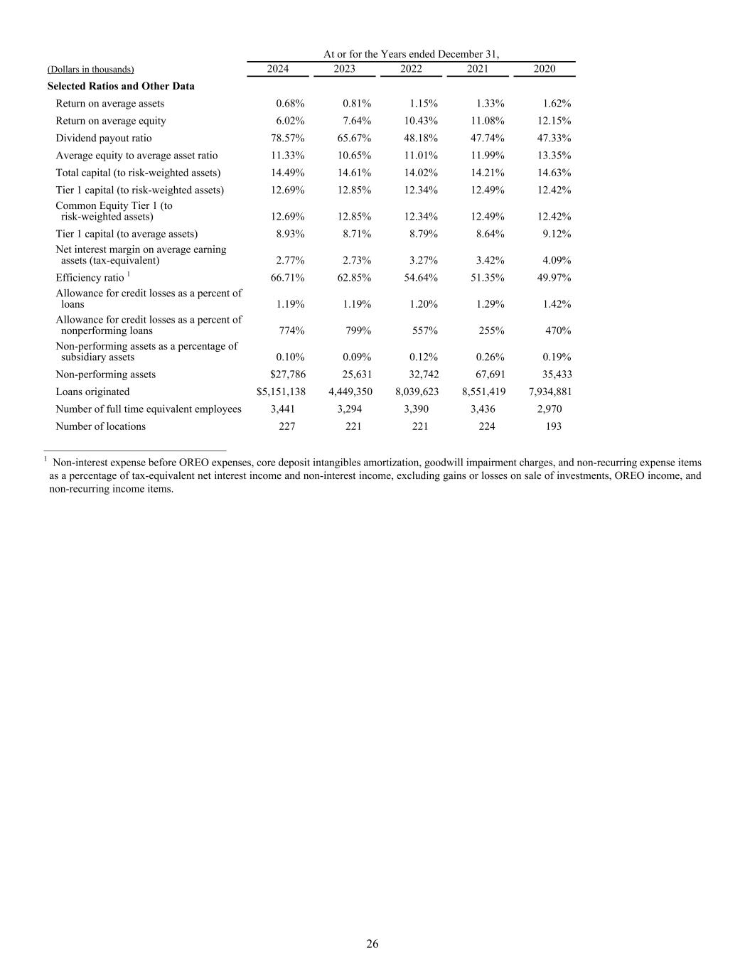At or for the Years ended December 31, (Dollars in thousands) 2024 2023 2022 2021 2020 Selected Ratios and Other Data Return on average assets 0.68% 0.81% 1.15% 1.33% 1.62% Return on average equity 6.02% 7.64% 10.43% 11.08% 12.15% Dividend payout ratio 78.57% 65.67% 48.18% 47.74% 47.33% Average equity to average asset ratio 11.33% 10.65% 11.01% 11.99% 13.35% Total capital (to risk-weighted assets) 14.49% 14.61% 14.02% 14.21% 14.63% Tier 1 capital (to risk-weighted assets) 12.69% 12.85% 12.34% 12.49% 12.42% Common Equity Tier 1 (to risk-weighted assets) 12.69% 12.85% 12.34% 12.49% 12.42% Tier 1 capital (to average assets) 8.93% 8.71% 8.79% 8.64% 9.12% Net interest margin on average earning assets (tax-equivalent) 2.77% 2.73% 3.27% 3.42% 4.09% Efficiency ratio 1 66.71% 62.85% 54.64% 51.35% 49.97% Allowance for credit losses as a percent of loans 1.19% 1.19% 1.20% 1.29% 1.42% Allowance for credit losses as a percent of nonperforming loans 774% 799% 557% 255% 470% Non-performing assets as a percentage of subsidiary assets 0.10% 0.09% 0.12% 0.26% 0.19% Non-performing assets $27,786 25,631 32,742 67,691 35,433 Loans originated $5,151,138 4,449,350 8,039,623 8,551,419 7,934,881 Number of full time equivalent employees 3,441 3,294 3,390 3,436 2,970 Number of locations 227 221 221 224 193 ______________________________ 1 Non-interest expense before OREO expenses, core deposit intangibles amortization, goodwill impairment charges, and non-recurring expense items as a percentage of tax-equivalent net interest income and non-interest income, excluding gains or losses on sale of investments, OREO income, and non-recurring income items. 26