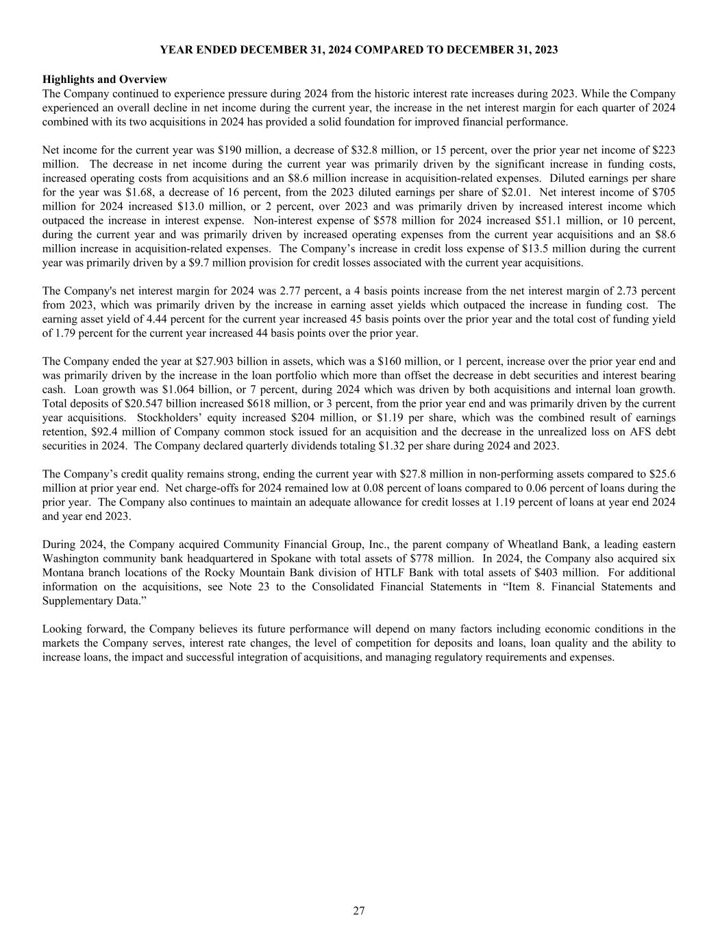 YEAR ENDED DECEMBER 31, 2024 COMPARED TO DECEMBER 31, 2023 Highlights and Overview The Company continued to experience pressure during 2024 from the historic interest rate increases during 2023. While the Company experienced an overall decline in net income during the current year, the increase in the net interest margin for each quarter of 2024 combined with its two acquisitions in 2024 has provided a solid foundation for improved financial performance. Net income for the current year was $190 million, a decrease of $32.8 million, or 15 percent, over the prior year net income of $223 million. The decrease in net income during the current year was primarily driven by the significant increase in funding costs, increased operating costs from acquisitions and an $8.6 million increase in acquisition-related expenses. Diluted earnings per share for the year was $1.68, a decrease of 16 percent, from the 2023 diluted earnings per share of $2.01. Net interest income of $705 million for 2024 increased $13.0 million, or 2 percent, over 2023 and was primarily driven by increased interest income which outpaced the increase in interest expense. Non-interest expense of $578 million for 2024 increased $51.1 million, or 10 percent, during the current year and was primarily driven by increased operating expenses from the current year acquisitions and an $8.6 million increase in acquisition-related expenses. The Company’s increase in credit loss expense of $13.5 million during the current year was primarily driven by a $9.7 million provision for credit losses associated with the current year acquisitions. The Company's net interest margin for 2024 was 2.77 percent, a 4 basis points increase from the net interest margin of 2.73 percent from 2023, which was primarily driven by the increase in earning asset yields which outpaced the increase in funding cost. The earning asset yield of 4.44 percent for the current year increased 45 basis points over the prior year and the total cost of funding yield of 1.79 percent for the current year increased 44 basis points over the prior year. The Company ended the year at $27.903 billion in assets, which was a $160 million, or 1 percent, increase over the prior year end and was primarily driven by the increase in the loan portfolio which more than offset the decrease in debt securities and interest bearing cash. Loan growth was $1.064 billion, or 7 percent, during 2024 which was driven by both acquisitions and internal loan growth. Total deposits of $20.547 billion increased $618 million, or 3 percent, from the prior year end and was primarily driven by the current year acquisitions. Stockholders’ equity increased $204 million, or $1.19 per share, which was the combined result of earnings retention, $92.4 million of Company common stock issued for an acquisition and the decrease in the unrealized loss on AFS debt securities in 2024. The Company declared quarterly dividends totaling $1.32 per share during 2024 and 2023. The Company’s credit quality remains strong, ending the current year with $27.8 million in non-performing assets compared to $25.6 million at prior year end. Net charge-offs for 2024 remained low at 0.08 percent of loans compared to 0.06 percent of loans during the prior year. The Company also continues to maintain an adequate allowance for credit losses at 1.19 percent of loans at year end 2024 and year end 2023. During 2024, the Company acquired Community Financial Group, Inc., the parent company of Wheatland Bank, a leading eastern Washington community bank headquartered in Spokane with total assets of $778 million. In 2024, the Company also acquired six Montana branch locations of the Rocky Mountain Bank division of HTLF Bank with total assets of $403 million. For additional information on the acquisitions, see Note 23 to the Consolidated Financial Statements in “Item 8. Financial Statements and Supplementary Data.” Looking forward, the Company believes its future performance will depend on many factors including economic conditions in the markets the Company serves, interest rate changes, the level of competition for deposits and loans, loan quality and the ability to increase loans, the impact and successful integration of acquisitions, and managing regulatory requirements and expenses. 27