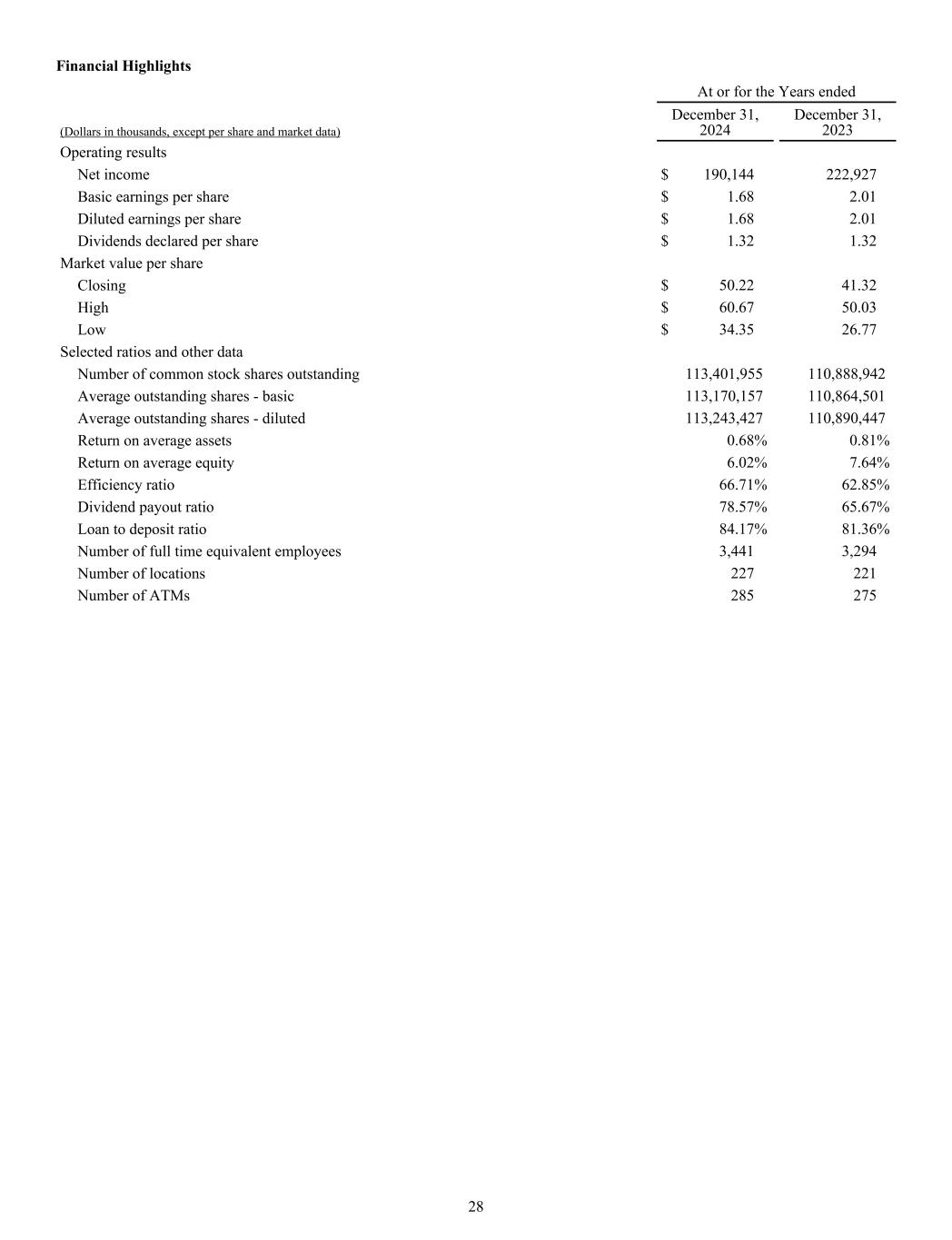 Financial Highlights At or for the Years ended (Dollars in thousands, except per share and market data) December 31, 2024 December 31, 2023 Operating results Net income $ 190,144 222,927 Basic earnings per share $ 1.68 2.01 Diluted earnings per share $ 1.68 2.01 Dividends declared per share $ 1.32 1.32 Market value per share Closing $ 50.22 41.32 High $ 60.67 50.03 Low $ 34.35 26.77 Selected ratios and other data Number of common stock shares outstanding 113,401,955 110,888,942 Average outstanding shares - basic 113,170,157 110,864,501 Average outstanding shares - diluted 113,243,427 110,890,447 Return on average assets 0.68% 0.81% Return on average equity 6.02% 7.64% Efficiency ratio 66.71% 62.85% Dividend payout ratio 78.57% 65.67% Loan to deposit ratio 84.17% 81.36% Number of full time equivalent employees 3,441 3,294 Number of locations 227 221 Number of ATMs 285 275 28