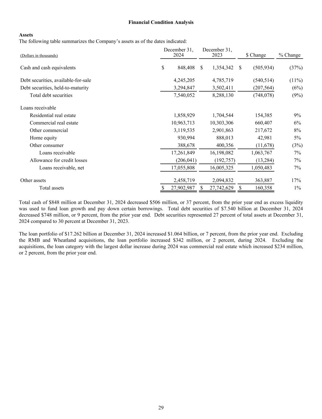 Financial Condition Analysis Assets The following table summarizes the Company’s assets as of the dates indicated: (Dollars in thousands) December 31, 2024 December 31, 2023 $ Change % Change Cash and cash equivalents $ 848,408 $ 1,354,342 $ (505,934) (37%) Debt securities, available-for-sale 4,245,205 4,785,719 (540,514) (11%) Debt securities, held-to-maturity 3,294,847 3,502,411 (207,564) (6%) Total debt securities 7,540,052 8,288,130 (748,078) (9%) Loans receivable Residential real estate 1,858,929 1,704,544 154,385 9% Commercial real estate 10,963,713 10,303,306 660,407 6% Other commercial 3,119,535 2,901,863 217,672 8% Home equity 930,994 888,013 42,981 5% Other consumer 388,678 400,356 (11,678) (3%) Loans receivable 17,261,849 16,198,082 1,063,767 7% Allowance for credit losses (206,041) (192,757) (13,284) 7% Loans receivable, net 17,055,808 16,005,325 1,050,483 7% Other assets 2,458,719 2,094,832 363,887 17% Total assets $ 27,902,987 $ 27,742,629 $ 160,358 1% Total cash of $848 million at December 31, 2024 decreased $506 million, or 37 percent, from the prior year end as excess liquidity was used to fund loan growth and pay down certain borrowings. Total debt securities of $7.540 billion at December 31, 2024 decreased $748 million, or 9 percent, from the prior year end. Debt securities represented 27 percent of total assets at December 31, 2024 compared to 30 percent at December 31, 2023. The loan portfolio of $17.262 billion at December 31, 2024 increased $1.064 billion, or 7 percent, from the prior year end. Excluding the RMB and Wheatland acquisitions, the loan portfolio increased $342 million, or 2 percent, during 2024. Excluding the acquisitions, the loan category with the largest dollar increase during 2024 was commercial real estate which increased $234 million, or 2 percent, from the prior year end. 29