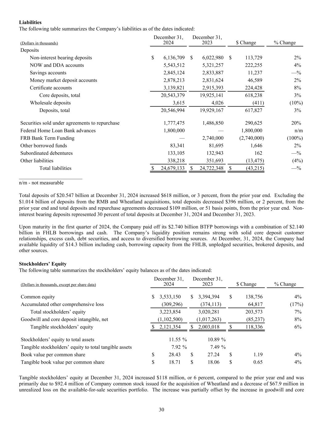 Liabilities The following table summarizes the Company’s liabilities as of the dates indicated: (Dollars in thousands) December 31, 2024 December 31, 2023 $ Change % Change Deposits Non-interest bearing deposits $ 6,136,709 $ 6,022,980 $ 113,729 2% NOW and DDA accounts 5,543,512 5,321,257 222,255 4% Savings accounts 2,845,124 2,833,887 11,237 —% Money market deposit accounts 2,878,213 2,831,624 46,589 2% Certificate accounts 3,139,821 2,915,393 224,428 8% Core deposits, total 20,543,379 19,925,141 618,238 3% Wholesale deposits 3,615 4,026 (411) (10%) Deposits, total 20,546,994 19,929,167 617,827 3% Securities sold under agreements to repurchase 1,777,475 1,486,850 290,625 20% Federal Home Loan Bank advances 1,800,000 — 1,800,000 n/m FRB Bank Term Funding — 2,740,000 (2,740,000) (100%) Other borrowed funds 83,341 81,695 1,646 2% Subordinated debentures 133,105 132,943 162 —% Other liabilities 338,218 351,693 (13,475) (4%) Total liabilities $ 24,679,133 $ 24,722,348 $ (43,215) —% ________________________ n/m - not measurable Total deposits of $20.547 billion at December 31, 2024 increased $618 million, or 3 percent, from the prior year end. Excluding the $1.014 billion of deposits from the RMB and Wheatland acquisitions, total deposits decreased $396 million, or 2 percent, from the prior year end and total deposits and repurchase agreements decreased $109 million, or 51 basis points, from the prior year end. Non- interest bearing deposits represented 30 percent of total deposits at December 31, 2024 and December 31, 2023. Upon maturity in the first quarter of 2024, the Company paid off its $2.740 billion BTFP borrowings with a combination of $2.140 billion in FHLB borrowings and cash. The Company’s liquidity position remains strong with solid core deposit customer relationships, excess cash, debt securities, and access to diversified borrowing sources. At December, 31, 2024, the Company had available liquidity of $14.3 billion including cash, borrowing capacity from the FHLB, unpledged securities, brokered deposits, and other sources. Stockholders’ Equity The following table summarizes the stockholders’ equity balances as of the dates indicated: (Dollars in thousands, except per share data) December 31, 2024 December 31, 2023 $ Change % Change Common equity $ 3,533,150 $ 3,394,394 $ 138,756 4% Accumulated other comprehensive loss (309,296) (374,113) 64,817 (17%) Total stockholders’ equity 3,223,854 3,020,281 203,573 7% Goodwill and core deposit intangible, net (1,102,500) (1,017,263) (85,237) 8% Tangible stockholders’ equity $ 2,121,354 $ 2,003,018 $ 118,336 6% Stockholders’ equity to total assets 11.55 % 10.89 % Tangible stockholders’ equity to total tangible assets 7.92 % 7.49 % Book value per common share $ 28.43 $ 27.24 $ 1.19 4% Tangible book value per common share $ 18.71 $ 18.06 $ 0.65 4% Tangible stockholders’ equity at December 31, 2024 increased $118 million, or 6 percent, compared to the prior year end and was primarily due to $92.4 million of Company common stock issued for the acquisition of Wheatland and a decrease of $67.9 million in unrealized loss on the available-for-sale securities portfolio. The increase was partially offset by the increase in goodwill and core 30