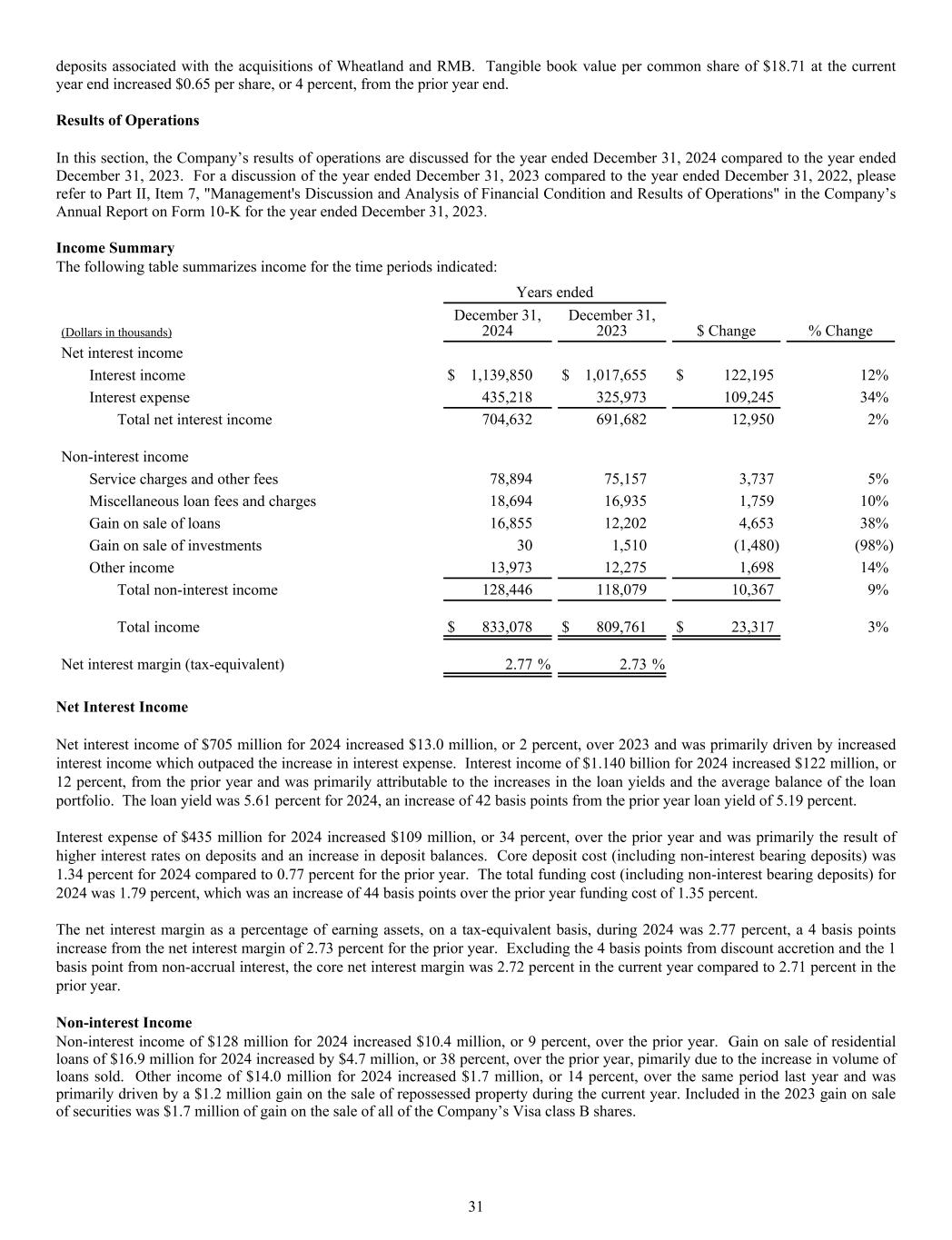 deposits associated with the acquisitions of Wheatland and RMB. Tangible book value per common share of $18.71 at the current year end increased $0.65 per share, or 4 percent, from the prior year end. Results of Operations In this section, the Company’s results of operations are discussed for the year ended December 31, 2024 compared to the year ended December 31, 2023. For a discussion of the year ended December 31, 2023 compared to the year ended December 31, 2022, please refer to Part II, Item 7, "Management's Discussion and Analysis of Financial Condition and Results of Operations" in the Company’s Annual Report on Form 10-K for the year ended December 31, 2023. Income Summary The following table summarizes income for the time periods indicated: Years ended $ Change % Change(Dollars in thousands) December 31, 2024 December 31, 2023 Net interest income Interest income $ 1,139,850 $ 1,017,655 $ 122,195 12% Interest expense 435,218 325,973 109,245 34% Total net interest income 704,632 691,682 12,950 2% Non-interest income Service charges and other fees 78,894 75,157 3,737 5% Miscellaneous loan fees and charges 18,694 16,935 1,759 10% Gain on sale of loans 16,855 12,202 4,653 38% Gain on sale of investments 30 1,510 (1,480) (98%) Other income 13,973 12,275 1,698 14% Total non-interest income 128,446 118,079 10,367 9% Total income $ 833,078 $ 809,761 $ 23,317 3% Net interest margin (tax-equivalent) 2.77 % 2.73 % Net Interest Income Net interest income of $705 million for 2024 increased $13.0 million, or 2 percent, over 2023 and was primarily driven by increased interest income which outpaced the increase in interest expense. Interest income of $1.140 billion for 2024 increased $122 million, or 12 percent, from the prior year and was primarily attributable to the increases in the loan yields and the average balance of the loan portfolio. The loan yield was 5.61 percent for 2024, an increase of 42 basis points from the prior year loan yield of 5.19 percent. Interest expense of $435 million for 2024 increased $109 million, or 34 percent, over the prior year and was primarily the result of higher interest rates on deposits and an increase in deposit balances. Core deposit cost (including non-interest bearing deposits) was 1.34 percent for 2024 compared to 0.77 percent for the prior year. The total funding cost (including non-interest bearing deposits) for 2024 was 1.79 percent, which was an increase of 44 basis points over the prior year funding cost of 1.35 percent. The net interest margin as a percentage of earning assets, on a tax-equivalent basis, during 2024 was 2.77 percent, a 4 basis points increase from the net interest margin of 2.73 percent for the prior year. Excluding the 4 basis points from discount accretion and the 1 basis point from non-accrual interest, the core net interest margin was 2.72 percent in the current year compared to 2.71 percent in the prior year. Non-interest Income Non-interest income of $128 million for 2024 increased $10.4 million, or 9 percent, over the prior year. Gain on sale of residential loans of $16.9 million for 2024 increased by $4.7 million, or 38 percent, over the prior year, pimarily due to the increase in volume of loans sold. Other income of $14.0 million for 2024 increased $1.7 million, or 14 percent, over the same period last year and was primarily driven by a $1.2 million gain on the sale of repossessed property during the current year. Included in the 2023 gain on sale of securities was $1.7 million of gain on the sale of all of the Company’s Visa class B shares. 31