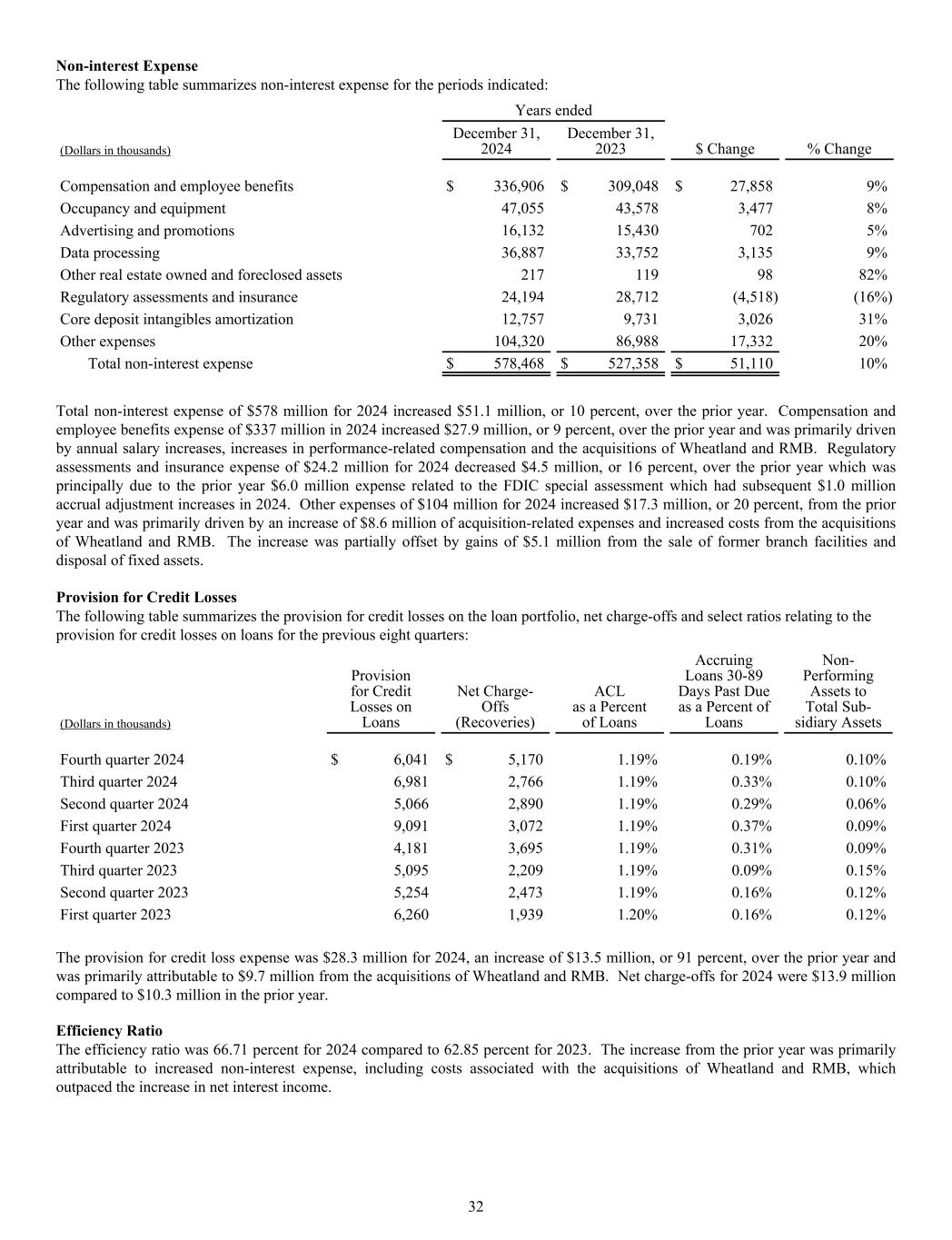 Non-interest Expense The following table summarizes non-interest expense for the periods indicated: Years ended $ Change % Change(Dollars in thousands) December 31, 2024 December 31, 2023 Compensation and employee benefits $ 336,906 $ 309,048 $ 27,858 9% Occupancy and equipment 47,055 43,578 3,477 8% Advertising and promotions 16,132 15,430 702 5% Data processing 36,887 33,752 3,135 9% Other real estate owned and foreclosed assets 217 119 98 82% Regulatory assessments and insurance 24,194 28,712 (4,518) (16%) Core deposit intangibles amortization 12,757 9,731 3,026 31% Other expenses 104,320 86,988 17,332 20% Total non-interest expense $ 578,468 $ 527,358 $ 51,110 10% Total non-interest expense of $578 million for 2024 increased $51.1 million, or 10 percent, over the prior year. Compensation and employee benefits expense of $337 million in 2024 increased $27.9 million, or 9 percent, over the prior year and was primarily driven by annual salary increases, increases in performance-related compensation and the acquisitions of Wheatland and RMB. Regulatory assessments and insurance expense of $24.2 million for 2024 decreased $4.5 million, or 16 percent, over the prior year which was principally due to the prior year $6.0 million expense related to the FDIC special assessment which had subsequent $1.0 million accrual adjustment increases in 2024. Other expenses of $104 million for 2024 increased $17.3 million, or 20 percent, from the prior year and was primarily driven by an increase of $8.6 million of acquisition-related expenses and increased costs from the acquisitions of Wheatland and RMB. The increase was partially offset by gains of $5.1 million from the sale of former branch facilities and disposal of fixed assets. Provision for Credit Losses The following table summarizes the provision for credit losses on the loan portfolio, net charge-offs and select ratios relating to the provision for credit losses on loans for the previous eight quarters: (Dollars in thousands) Provision for Credit Losses on Loans Net Charge- Offs (Recoveries) ACL as a Percent of Loans Accruing Loans 30-89 Days Past Due as a Percent of Loans Non- Performing Assets to Total Sub- sidiary Assets Fourth quarter 2024 $ 6,041 $ 5,170 1.19% 0.19% 0.10% Third quarter 2024 6,981 2,766 1.19% 0.33% 0.10% Second quarter 2024 5,066 2,890 1.19% 0.29% 0.06% First quarter 2024 9,091 3,072 1.19% 0.37% 0.09% Fourth quarter 2023 4,181 3,695 1.19% 0.31% 0.09% Third quarter 2023 5,095 2,209 1.19% 0.09% 0.15% Second quarter 2023 5,254 2,473 1.19% 0.16% 0.12% First quarter 2023 6,260 1,939 1.20% 0.16% 0.12% The provision for credit loss expense was $28.3 million for 2024, an increase of $13.5 million, or 91 percent, over the prior year and was primarily attributable to $9.7 million from the acquisitions of Wheatland and RMB. Net charge-offs for 2024 were $13.9 million compared to $10.3 million in the prior year. Efficiency Ratio The efficiency ratio was 66.71 percent for 2024 compared to 62.85 percent for 2023. The increase from the prior year was primarily attributable to increased non-interest expense, including costs associated with the acquisitions of Wheatland and RMB, which outpaced the increase in net interest income. 32