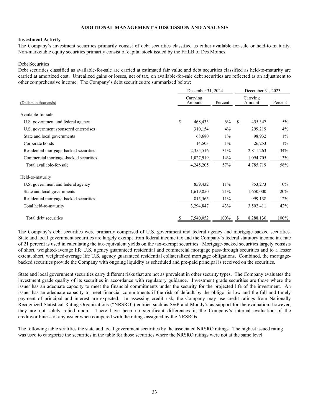 ADDITIONAL MANAGEMENT’S DISCUSSION AND ANALYSIS Investment Activity The Company’s investment securities primarily consist of debt securities classified as either available-for-sale or held-to-maturity. Non-marketable equity securities primarily consist of capital stock issued by the FHLB of Des Moines. Debt Securities Debt securities classified as available-for-sale are carried at estimated fair value and debt securities classified as held-to-maturity are carried at amortized cost. Unrealized gains or losses, net of tax, on available-for-sale debt securities are reflected as an adjustment to other comprehensive income. The Company’s debt securities are summarized below: December 31, 2024 December 31, 2023 (Dollars in thousands) Carrying Amount Percent Carrying Amount Percent Available-for-sale U.S. government and federal agency $ 468,433 6% $ 455,347 5% U.S. government sponsored enterprises 310,154 4% 299,219 4% State and local governments 68,680 1% 98,932 1% Corporate bonds 14,503 1% 26,253 1% Residential mortgage-backed securities 2,355,516 31% 2,811,263 34% Commercial mortgage-backed securities 1,027,919 14% 1,094,705 13% Total available-for-sale 4,245,205 57% 4,785,719 58% Held-to-maturity U.S. government and federal agency 859,432 11% 853,273 10% State and local governments 1,619,850 21% 1,650,000 20% Residential mortgage-backed securities 815,565 11% 999,138 12% Total held-to-maturity 3,294,847 43% 3,502,411 42% Total debt securities $ 7,540,052 100% $ 8,288,130 100% The Company’s debt securities were primarily comprised of U.S. government and federal agency and mortgage-backed securities. State and local government securities are largely exempt from federal income tax and the Company’s federal statutory income tax rate of 21 percent is used in calculating the tax-equivalent yields on the tax-exempt securities. Mortgage-backed securities largely consists of short, weighted-average life U.S. agency guaranteed residential and commercial mortgage pass-through securities and to a lesser extent, short, weighted-average life U.S. agency guaranteed residential collateralized mortgage obligations. Combined, the mortgage- backed securities provide the Company with ongoing liquidity as scheduled and pre-paid principal is received on the securities. State and local government securities carry different risks that are not as prevalent in other security types. The Company evaluates the investment grade quality of its securities in accordance with regulatory guidance. Investment grade securities are those where the issuer has an adequate capacity to meet the financial commitments under the security for the projected life of the investment. An issuer has an adequate capacity to meet financial commitments if the risk of default by the obligor is low and the full and timely payment of principal and interest are expected. In assessing credit risk, the Company may use credit ratings from Nationally Recognized Statistical Rating Organizations (“NRSRO”) entities such as S&P and Moody’s as support for the evaluation; however, they are not solely relied upon. There have been no significant differences in the Company’s internal evaluation of the creditworthiness of any issuer when compared with the ratings assigned by the NRSROs. The following table stratifies the state and local government securities by the associated NRSRO ratings. The highest issued rating was used to categorize the securities in the table for those securities where the NRSRO ratings were not at the same level. 33