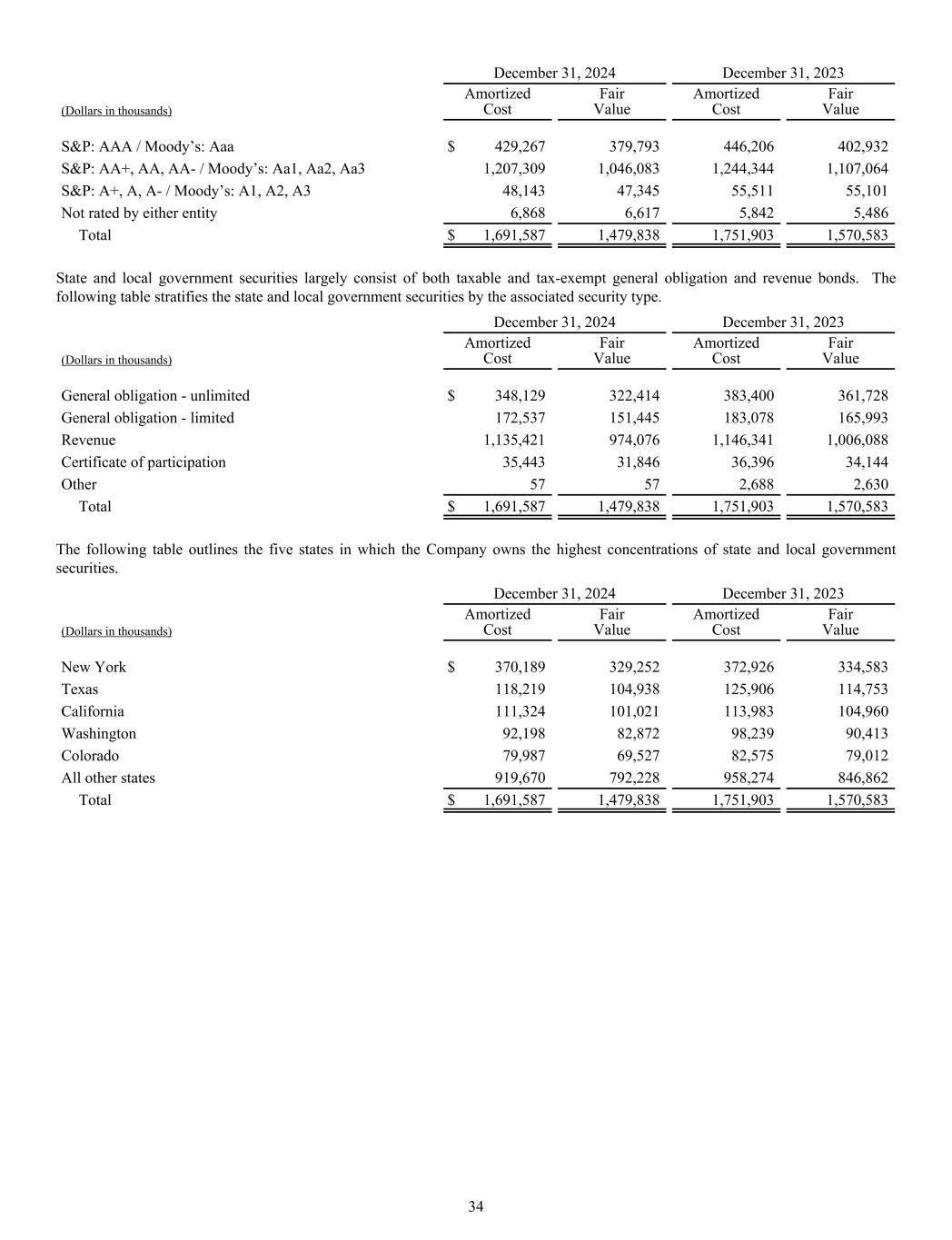 December 31, 2024 December 31, 2023 (Dollars in thousands) Amortized Cost Fair Value Amortized Cost Fair Value S&P: AAA / Moody’s: Aaa $ 429,267 379,793 446,206 402,932 S&P: AA+, AA, AA- / Moody’s: Aa1, Aa2, Aa3 1,207,309 1,046,083 1,244,344 1,107,064 S&P: A+, A, A- / Moody’s: A1, A2, A3 48,143 47,345 55,511 55,101 Not rated by either entity 6,868 6,617 5,842 5,486 Total $ 1,691,587 1,479,838 1,751,903 1,570,583 State and local government securities largely consist of both taxable and tax-exempt general obligation and revenue bonds. The following table stratifies the state and local government securities by the associated security type. December 31, 2024 December 31, 2023 (Dollars in thousands) Amortized Cost Fair Value Amortized Cost Fair Value General obligation - unlimited $ 348,129 322,414 383,400 361,728 General obligation - limited 172,537 151,445 183,078 165,993 Revenue 1,135,421 974,076 1,146,341 1,006,088 Certificate of participation 35,443 31,846 36,396 34,144 Other 57 57 2,688 2,630 Total $ 1,691,587 1,479,838 1,751,903 1,570,583 The following table outlines the five states in which the Company owns the highest concentrations of state and local government securities. December 31, 2024 December 31, 2023 (Dollars in thousands) Amortized Cost Fair Value Amortized Cost Fair Value New York $ 370,189 329,252 372,926 334,583 Texas 118,219 104,938 125,906 114,753 California 111,324 101,021 113,983 104,960 Washington 92,198 82,872 98,239 90,413 Colorado 79,987 69,527 82,575 79,012 All other states 919,670 792,228 958,274 846,862 Total $ 1,691,587 1,479,838 1,751,903 1,570,583 34