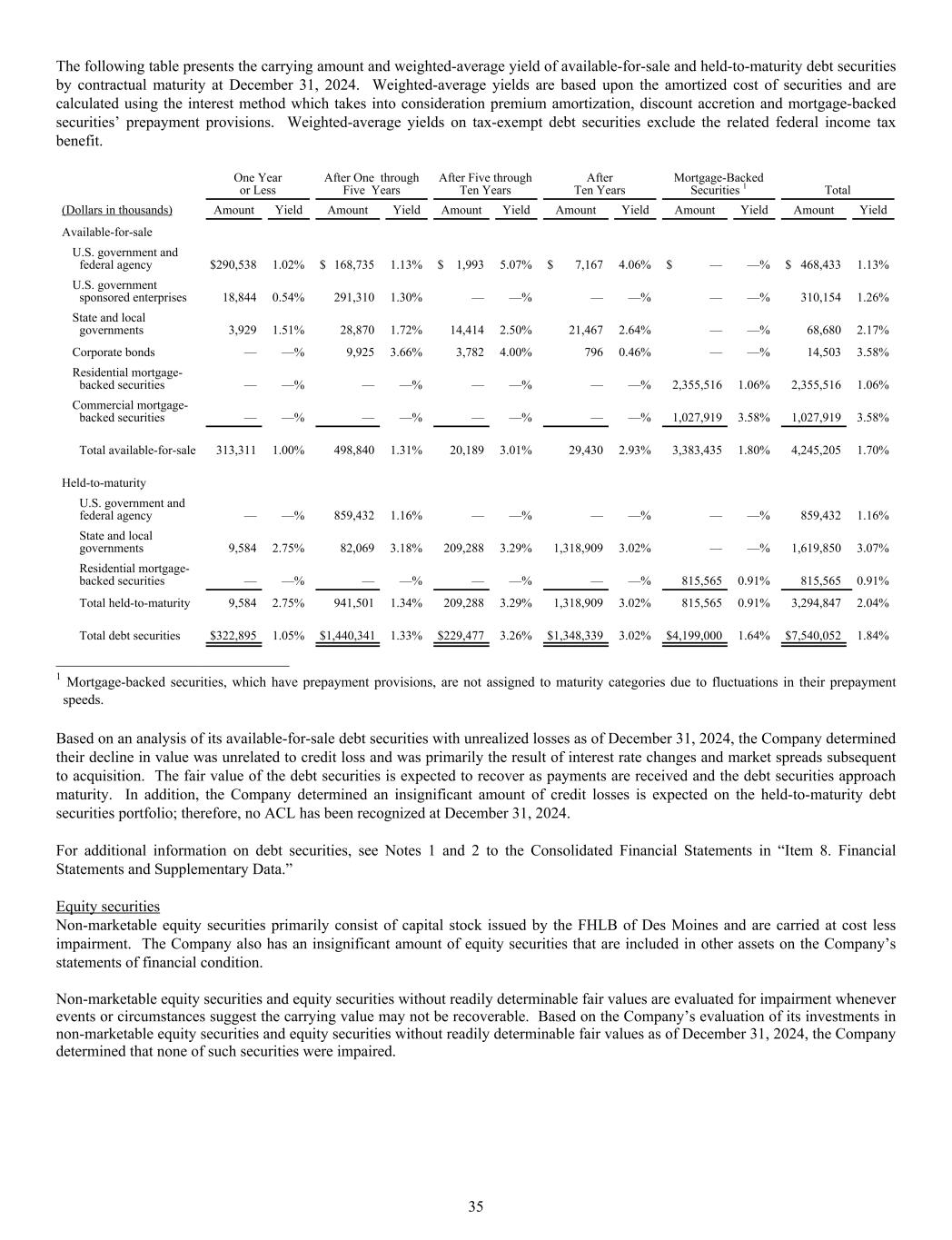 The following table presents the carrying amount and weighted-average yield of available-for-sale and held-to-maturity debt securities by contractual maturity at December 31, 2024. Weighted-average yields are based upon the amortized cost of securities and are calculated using the interest method which takes into consideration premium amortization, discount accretion and mortgage-backed securities’ prepayment provisions. Weighted-average yields on tax-exempt debt securities exclude the related federal income tax benefit. One Year or Less After One through Five Years After Five through Ten Years After Ten Years Mortgage-Backed Securities 1 Total (Dollars in thousands) Amount Yield Amount Yield Amount Yield Amount Yield Amount Yield Amount Yield Available-for-sale U.S. government and federal agency $ 290,538 1.02% $ 168,735 1.13% $ 1,993 5.07% $ 7,167 4.06% $ — —% $ 468,433 1.13% U.S. government sponsored enterprises 18,844 0.54% 291,310 1.30% — —% — —% — —% 310,154 1.26% State and local governments 3,929 1.51% 28,870 1.72% 14,414 2.50% 21,467 2.64% — —% 68,680 2.17% Corporate bonds — —% 9,925 3.66% 3,782 4.00% 796 0.46% — —% 14,503 3.58% Residential mortgage- backed securities — —% — —% — —% — —% 2,355,516 1.06% 2,355,516 1.06% Commercial mortgage- backed securities — —% — —% — —% — —% 1,027,919 3.58% 1,027,919 3.58% Total available-for-sale 313,311 1.00% 498,840 1.31% 20,189 3.01% 29,430 2.93% 3,383,435 1.80% 4,245,205 1.70% Held-to-maturity U.S. government and federal agency — —% 859,432 1.16% — —% — —% — —% 859,432 1.16% State and local governments 9,584 2.75% 82,069 3.18% 209,288 3.29% 1,318,909 3.02% — —% 1,619,850 3.07% Residential mortgage- backed securities — —% — —% — —% — —% 815,565 0.91% 815,565 0.91% Total held-to-maturity 9,584 2.75% 941,501 1.34% 209,288 3.29% 1,318,909 3.02% 815,565 0.91% 3,294,847 2.04% Total debt securities $ 322,895 1.05% $ 1,440,341 1.33% $ 229,477 3.26% $ 1,348,339 3.02% $ 4,199,000 1.64% $ 7,540,052 1.84% ______________________________ 1 Mortgage-backed securities, which have prepayment provisions, are not assigned to maturity categories due to fluctuations in their prepayment speeds. Based on an analysis of its available-for-sale debt securities with unrealized losses as of December 31, 2024, the Company determined their decline in value was unrelated to credit loss and was primarily the result of interest rate changes and market spreads subsequent to acquisition. The fair value of the debt securities is expected to recover as payments are received and the debt securities approach maturity. In addition, the Company determined an insignificant amount of credit losses is expected on the held-to-maturity debt securities portfolio; therefore, no ACL has been recognized at December 31, 2024. For additional information on debt securities, see Notes 1 and 2 to the Consolidated Financial Statements in “Item 8. Financial Statements and Supplementary Data.” Equity securities Non-marketable equity securities primarily consist of capital stock issued by the FHLB of Des Moines and are carried at cost less impairment. The Company also has an insignificant amount of equity securities that are included in other assets on the Company’s statements of financial condition. Non-marketable equity securities and equity securities without readily determinable fair values are evaluated for impairment whenever events or circumstances suggest the carrying value may not be recoverable. Based on the Company’s evaluation of its investments in non-marketable equity securities and equity securities without readily determinable fair values as of December 31, 2024, the Company determined that none of such securities were impaired. 35