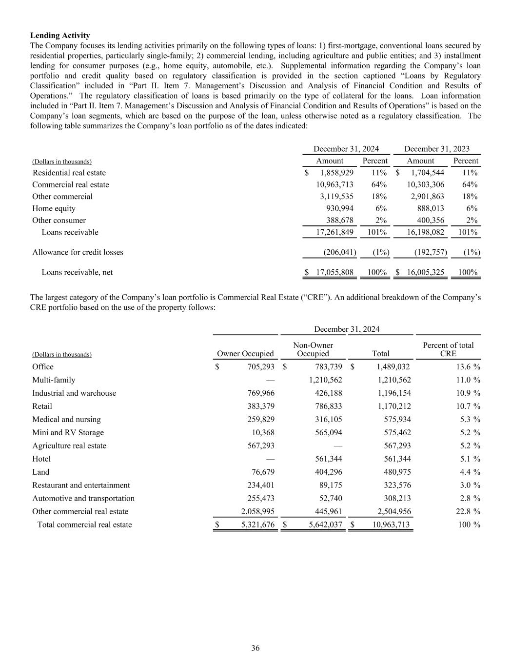 Lending Activity The Company focuses its lending activities primarily on the following types of loans: 1) first-mortgage, conventional loans secured by residential properties, particularly single-family; 2) commercial lending, including agriculture and public entities; and 3) installment lending for consumer purposes (e.g., home equity, automobile, etc.). Supplemental information regarding the Company’s loan portfolio and credit quality based on regulatory classification is provided in the section captioned “Loans by Regulatory Classification” included in “Part II. Item 7. Management’s Discussion and Analysis of Financial Condition and Results of Operations.” The regulatory classification of loans is based primarily on the type of collateral for the loans. Loan information included in “Part II. Item 7. Management’s Discussion and Analysis of Financial Condition and Results of Operations” is based on the Company’s loan segments, which are based on the purpose of the loan, unless otherwise noted as a regulatory classification. The following table summarizes the Company’s loan portfolio as of the dates indicated: December 31, 2024 December 31, 2023 (Dollars in thousands) Amount Percent Amount Percent Residential real estate $ 1,858,929 11% $ 1,704,544 11% Commercial real estate 10,963,713 64% 10,303,306 64% Other commercial 3,119,535 18% 2,901,863 18% Home equity 930,994 6% 888,013 6% Other consumer 388,678 2% 400,356 2% Loans receivable 17,261,849 101% 16,198,082 101% Allowance for credit losses (206,041) (1%) (192,757) (1%) Loans receivable, net $ 17,055,808 100% $ 16,005,325 100% The largest category of the Company’s loan portfolio is Commercial Real Estate (“CRE”). An additional breakdown of the Company’s CRE portfolio based on the use of the property follows: December 31, 2024 (Dollars in thousands) Owner Occupied Non-Owner Occupied Total Percent of total CRE Office $ 705,293 $ 783,739 $ 1,489,032 13.6 % Multi-family — 1,210,562 1,210,562 11.0 % Industrial and warehouse 769,966 426,188 1,196,154 10.9 % Retail 383,379 786,833 1,170,212 10.7 % Medical and nursing 259,829 316,105 575,934 5.3 % Mini and RV Storage 10,368 565,094 575,462 5.2 % Agriculture real estate 567,293 — 567,293 5.2 % Hotel — 561,344 561,344 5.1 % Land 76,679 404,296 480,975 4.4 % Restaurant and entertainment 234,401 89,175 323,576 3.0 % Automotive and transportation 255,473 52,740 308,213 2.8 % Other commercial real estate 2,058,995 445,961 2,504,956 22.8 % Total commercial real estate $ 5,321,676 $ 5,642,037 $ 10,963,713 100 % 36