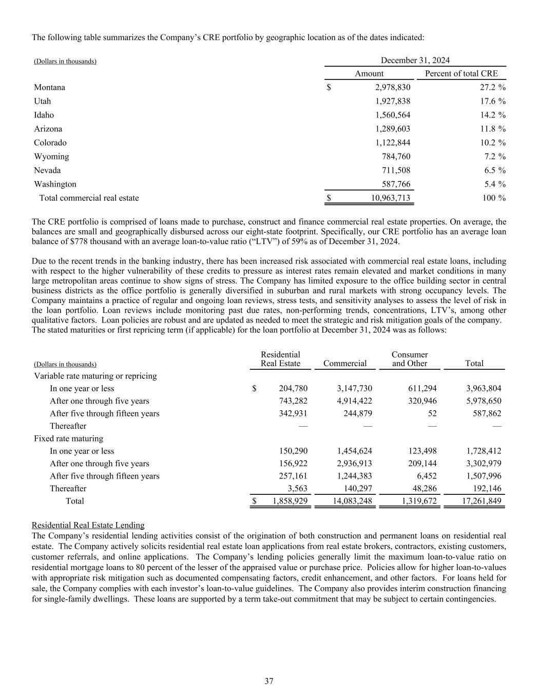 The following table summarizes the Company’s CRE portfolio by geographic location as of the dates indicated: (Dollars in thousands) December 31, 2024 Amount Percent of total CRE Montana $ 2,978,830 27.2 % Utah 1,927,838 17.6 % Idaho 1,560,564 14.2 % Arizona 1,289,603 11.8 % Colorado 1,122,844 10.2 % Wyoming 784,760 7.2 % Nevada 711,508 6.5 % Washington 587,766 5.4 % Total commercial real estate $ 10,963,713 100 % The CRE portfolio is comprised of loans made to purchase, construct and finance commercial real estate properties. On average, the balances are small and geographically disbursed across our eight-state footprint. Specifically, our CRE portfolio has an average loan balance of $778 thousand with an average loan-to-value ratio (“LTV”) of 59% as of December 31, 2024. Due to the recent trends in the banking industry, there has been increased risk associated with commercial real estate loans, including with respect to the higher vulnerability of these credits to pressure as interest rates remain elevated and market conditions in many large metropolitan areas continue to show signs of stress. The Company has limited exposure to the office building sector in central business districts as the office portfolio is generally diversified in suburban and rural markets with strong occupancy levels. The Company maintains a practice of regular and ongoing loan reviews, stress tests, and sensitivity analyses to assess the level of risk in the loan portfolio. Loan reviews include monitoring past due rates, non-performing trends, concentrations, LTV’s, among other qualitative factors. Loan policies are robust and are updated as needed to meet the strategic and risk mitigation goals of the company. The stated maturities or first repricing term (if applicable) for the loan portfolio at December 31, 2024 was as follows: (Dollars in thousands) Residential Real Estate Commercial Consumer and Other Total Variable rate maturing or repricing In one year or less $ 204,780 3,147,730 611,294 3,963,804 After one through five years 743,282 4,914,422 320,946 5,978,650 After five through fifteen years 342,931 244,879 52 587,862 Thereafter — — — — Fixed rate maturing In one year or less 150,290 1,454,624 123,498 1,728,412 After one through five years 156,922 2,936,913 209,144 3,302,979 After five through fifteen years 257,161 1,244,383 6,452 1,507,996 Thereafter 3,563 140,297 48,286 192,146 Total $ 1,858,929 14,083,248 1,319,672 17,261,849 Residential Real Estate Lending The Company’s residential lending activities consist of the origination of both construction and permanent loans on residential real estate. The Company actively solicits residential real estate loan applications from real estate brokers, contractors, existing customers, customer referrals, and online applications. The Company’s lending policies generally limit the maximum loan-to-value ratio on residential mortgage loans to 80 percent of the lesser of the appraised value or purchase price. Policies allow for higher loan-to-values with appropriate risk mitigation such as documented compensating factors, credit enhancement, and other factors. For loans held for sale, the Company complies with each investor’s loan-to-value guidelines. The Company also provides interim construction financing for single-family dwellings. These loans are supported by a term take-out commitment that may be subject to certain contingencies. 37