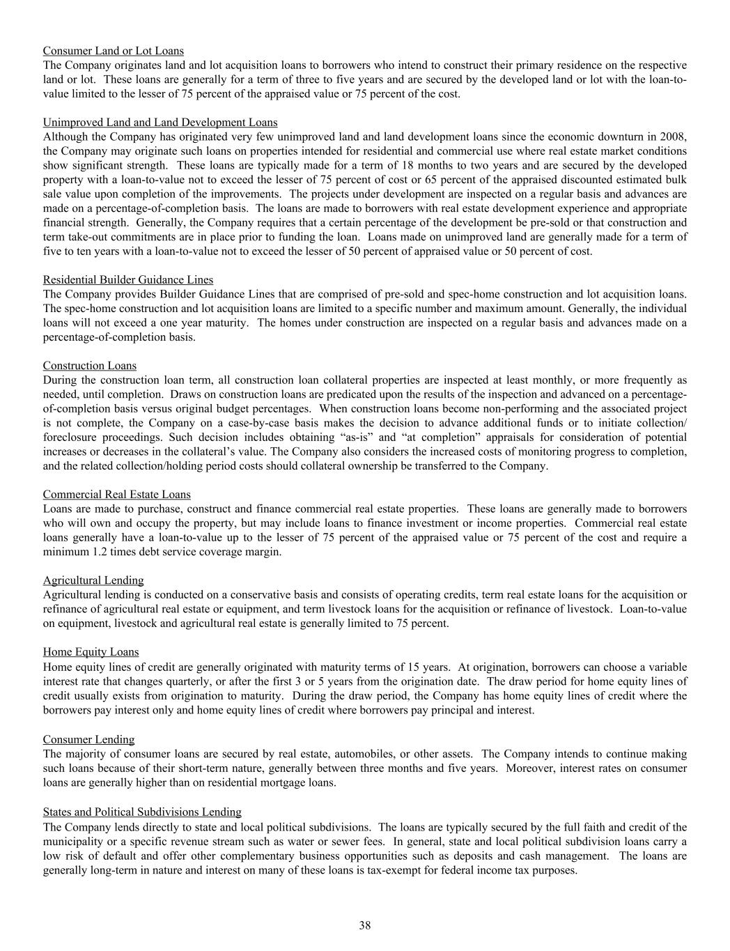 Consumer Land or Lot Loans The Company originates land and lot acquisition loans to borrowers who intend to construct their primary residence on the respective land or lot. These loans are generally for a term of three to five years and are secured by the developed land or lot with the loan-to- value limited to the lesser of 75 percent of the appraised value or 75 percent of the cost. Unimproved Land and Land Development Loans Although the Company has originated very few unimproved land and land development loans since the economic downturn in 2008, the Company may originate such loans on properties intended for residential and commercial use where real estate market conditions show significant strength. These loans are typically made for a term of 18 months to two years and are secured by the developed property with a loan-to-value not to exceed the lesser of 75 percent of cost or 65 percent of the appraised discounted estimated bulk sale value upon completion of the improvements. The projects under development are inspected on a regular basis and advances are made on a percentage-of-completion basis. The loans are made to borrowers with real estate development experience and appropriate financial strength. Generally, the Company requires that a certain percentage of the development be pre-sold or that construction and term take-out commitments are in place prior to funding the loan. Loans made on unimproved land are generally made for a term of five to ten years with a loan-to-value not to exceed the lesser of 50 percent of appraised value or 50 percent of cost. Residential Builder Guidance Lines The Company provides Builder Guidance Lines that are comprised of pre-sold and spec-home construction and lot acquisition loans. The spec-home construction and lot acquisition loans are limited to a specific number and maximum amount. Generally, the individual loans will not exceed a one year maturity. The homes under construction are inspected on a regular basis and advances made on a percentage-of-completion basis. Construction Loans During the construction loan term, all construction loan collateral properties are inspected at least monthly, or more frequently as needed, until completion. Draws on construction loans are predicated upon the results of the inspection and advanced on a percentage- of-completion basis versus original budget percentages. When construction loans become non-performing and the associated project is not complete, the Company on a case-by-case basis makes the decision to advance additional funds or to initiate collection/ foreclosure proceedings. Such decision includes obtaining “as-is” and “at completion” appraisals for consideration of potential increases or decreases in the collateral’s value. The Company also considers the increased costs of monitoring progress to completion, and the related collection/holding period costs should collateral ownership be transferred to the Company. Commercial Real Estate Loans Loans are made to purchase, construct and finance commercial real estate properties. These loans are generally made to borrowers who will own and occupy the property, but may include loans to finance investment or income properties. Commercial real estate loans generally have a loan-to-value up to the lesser of 75 percent of the appraised value or 75 percent of the cost and require a minimum 1.2 times debt service coverage margin. Agricultural Lending Agricultural lending is conducted on a conservative basis and consists of operating credits, term real estate loans for the acquisition or refinance of agricultural real estate or equipment, and term livestock loans for the acquisition or refinance of livestock. Loan-to-value on equipment, livestock and agricultural real estate is generally limited to 75 percent. Home Equity Loans Home equity lines of credit are generally originated with maturity terms of 15 years. At origination, borrowers can choose a variable interest rate that changes quarterly, or after the first 3 or 5 years from the origination date. The draw period for home equity lines of credit usually exists from origination to maturity. During the draw period, the Company has home equity lines of credit where the borrowers pay interest only and home equity lines of credit where borrowers pay principal and interest. Consumer Lending The majority of consumer loans are secured by real estate, automobiles, or other assets. The Company intends to continue making such loans because of their short-term nature, generally between three months and five years. Moreover, interest rates on consumer loans are generally higher than on residential mortgage loans. States and Political Subdivisions Lending The Company lends directly to state and local political subdivisions. The loans are typically secured by the full faith and credit of the municipality or a specific revenue stream such as water or sewer fees. In general, state and local political subdivision loans carry a low risk of default and offer other complementary business opportunities such as deposits and cash management. The loans are generally long-term in nature and interest on many of these loans is tax-exempt for federal income tax purposes. 38