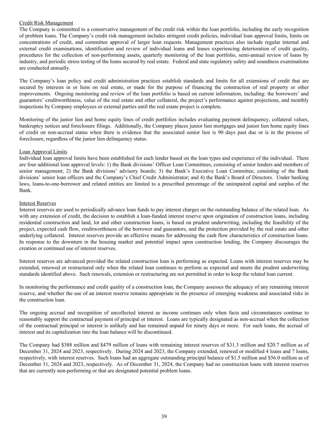 Credit Risk Management The Company is committed to a conservative management of the credit risk within the loan portfolio, including the early recognition of problem loans. The Company’s credit risk management includes stringent credit policies, individual loan approval limits, limits on concentrations of credit, and committee approval of larger loan requests. Management practices also include regular internal and external credit examinations, identification and review of individual loans and leases experiencing deterioration of credit quality, procedures for the collection of non-performing assets, quarterly monitoring of the loan portfolio, semi-annual review of loans by industry, and periodic stress testing of the loans secured by real estate. Federal and state regulatory safety and soundness examinations are conducted annually. The Company’s loan policy and credit administration practices establish standards and limits for all extensions of credit that are secured by interests in or liens on real estate, or made for the purpose of financing the construction of real property or other improvements. Ongoing monitoring and review of the loan portfolio is based on current information, including: the borrowers’ and guarantors’ creditworthiness, value of the real estate and other collateral, the project’s performance against projections, and monthly inspections by Company employees or external parties until the real estate project is complete. Monitoring of the junior lien and home equity lines of credit portfolios includes evaluating payment delinquency, collateral values, bankruptcy notices and foreclosure filings. Additionally, the Company places junior lien mortgages and junior lien home equity lines of credit on non-accrual status when there is evidence that the associated senior lien is 90 days past due or is in the process of foreclosure, regardless of the junior lien delinquency status. Loan Approval Limits Individual loan approval limits have been established for each lender based on the loan types and experience of the individual. There are four additional loan approval levels: 1) the Bank divisions’ Officer Loan Committees, consisting of senior lenders and members of senior management; 2) the Bank divisions’ advisory boards; 3) the Bank’s Executive Loan Committee, consisting of the Bank divisions’ senior loan officers and the Company’s Chief Credit Administrator; and 4) the Bank’s Board of Directors. Under banking laws, loans-to-one-borrower and related entities are limited to a prescribed percentage of the unimpaired capital and surplus of the Bank. Interest Reserves Interest reserves are used to periodically advance loan funds to pay interest charges on the outstanding balance of the related loan. As with any extension of credit, the decision to establish a loan-funded interest reserve upon origination of construction loans, including residential construction and land, lot and other construction loans, is based on prudent underwriting, including the feasibility of the project, expected cash flow, creditworthiness of the borrower and guarantors, and the protection provided by the real estate and other underlying collateral. Interest reserves provide an effective means for addressing the cash flow characteristics of construction loans. In response to the downturn in the housing market and potential impact upon construction lending, the Company discourages the creation or continued use of interest reserves. Interest reserves are advanced provided the related construction loan is performing as expected. Loans with interest reserves may be extended, renewed or restructured only when the related loan continues to perform as expected and meets the prudent underwriting standards identified above. Such renewals, extension or restructuring are not permitted in order to keep the related loan current. In monitoring the performance and credit quality of a construction loan, the Company assesses the adequacy of any remaining interest reserve, and whether the use of an interest reserve remains appropriate in the presence of emerging weakness and associated risks in the construction loan. The ongoing accrual and recognition of uncollected interest as income continues only when facts and circumstances continue to reasonably support the contractual payment of principal or interest. Loans are typically designated as non-accrual when the collection of the contractual principal or interest is unlikely and has remained unpaid for ninety days or more. For such loans, the accrual of interest and its capitalization into the loan balance will be discontinued. The Company had $388 million and $479 million of loans with remaining interest reserves of $31.3 million and $20.7 million as of December 31, 2024 and 2023, respectively. During 2024 and 2023, the Company extended, renewed or modified 4 loans and 7 loans, respectively, with interest reserves. Such loans had an aggregate outstanding principal balance of $1.5 million and $56.0 million as of December 31, 2024 and 2023, respectively. As of December 31, 2024, the Company had no construction loans with interest reserves that are currently non-performing or that are designated potential problem loans. 39