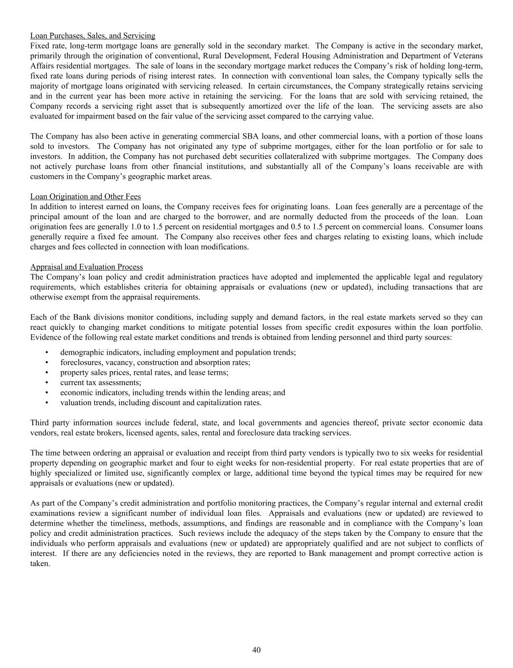 Loan Purchases, Sales, and Servicing Fixed rate, long-term mortgage loans are generally sold in the secondary market. The Company is active in the secondary market, primarily through the origination of conventional, Rural Development, Federal Housing Administration and Department of Veterans Affairs residential mortgages. The sale of loans in the secondary mortgage market reduces the Company’s risk of holding long-term, fixed rate loans during periods of rising interest rates. In connection with conventional loan sales, the Company typically sells the majority of mortgage loans originated with servicing released. In certain circumstances, the Company strategically retains servicing and in the current year has been more active in retaining the servicing. For the loans that are sold with servicing retained, the Company records a servicing right asset that is subsequently amortized over the life of the loan. The servicing assets are also evaluated for impairment based on the fair value of the servicing asset compared to the carrying value. The Company has also been active in generating commercial SBA loans, and other commercial loans, with a portion of those loans sold to investors. The Company has not originated any type of subprime mortgages, either for the loan portfolio or for sale to investors. In addition, the Company has not purchased debt securities collateralized with subprime mortgages. The Company does not actively purchase loans from other financial institutions, and substantially all of the Company’s loans receivable are with customers in the Company’s geographic market areas. Loan Origination and Other Fees In addition to interest earned on loans, the Company receives fees for originating loans. Loan fees generally are a percentage of the principal amount of the loan and are charged to the borrower, and are normally deducted from the proceeds of the loan. Loan origination fees are generally 1.0 to 1.5 percent on residential mortgages and 0.5 to 1.5 percent on commercial loans. Consumer loans generally require a fixed fee amount. The Company also receives other fees and charges relating to existing loans, which include charges and fees collected in connection with loan modifications. Appraisal and Evaluation Process The Company’s loan policy and credit administration practices have adopted and implemented the applicable legal and regulatory requirements, which establishes criteria for obtaining appraisals or evaluations (new or updated), including transactions that are otherwise exempt from the appraisal requirements. Each of the Bank divisions monitor conditions, including supply and demand factors, in the real estate markets served so they can react quickly to changing market conditions to mitigate potential losses from specific credit exposures within the loan portfolio. Evidence of the following real estate market conditions and trends is obtained from lending personnel and third party sources: • demographic indicators, including employment and population trends; • foreclosures, vacancy, construction and absorption rates; • property sales prices, rental rates, and lease terms; • current tax assessments; • economic indicators, including trends within the lending areas; and • valuation trends, including discount and capitalization rates. Third party information sources include federal, state, and local governments and agencies thereof, private sector economic data vendors, real estate brokers, licensed agents, sales, rental and foreclosure data tracking services. The time between ordering an appraisal or evaluation and receipt from third party vendors is typically two to six weeks for residential property depending on geographic market and four to eight weeks for non-residential property. For real estate properties that are of highly specialized or limited use, significantly complex or large, additional time beyond the typical times may be required for new appraisals or evaluations (new or updated). As part of the Company’s credit administration and portfolio monitoring practices, the Company’s regular internal and external credit examinations review a significant number of individual loan files. Appraisals and evaluations (new or updated) are reviewed to determine whether the timeliness, methods, assumptions, and findings are reasonable and in compliance with the Company’s loan policy and credit administration practices. Such reviews include the adequacy of the steps taken by the Company to ensure that the individuals who perform appraisals and evaluations (new or updated) are appropriately qualified and are not subject to conflicts of interest. If there are any deficiencies noted in the reviews, they are reported to Bank management and prompt corrective action is taken. 40
