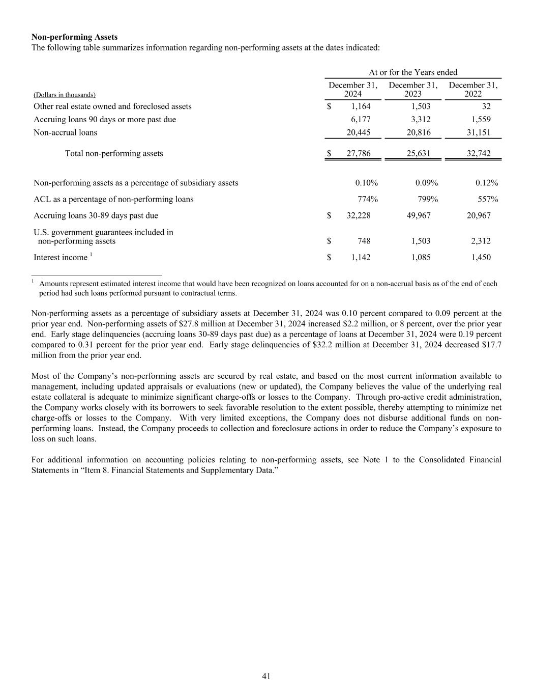 Non-performing Assets The following table summarizes information regarding non-performing assets at the dates indicated: At or for the Years ended (Dollars in thousands) December 31, 2024 December 31, 2023 December 31, 2022 Other real estate owned and foreclosed assets $ 1,164 1,503 32 Accruing loans 90 days or more past due 6,177 3,312 1,559 Non-accrual loans 20,445 20,816 31,151 Total non-performing assets $ 27,786 25,631 32,742 Non-performing assets as a percentage of subsidiary assets 0.10% 0.09% 0.12% ACL as a percentage of non-performing loans 774% 799% 557% Accruing loans 30-89 days past due $ 32,228 49,967 20,967 U.S. government guarantees included in non-performing assets $ 748 1,503 2,312 Interest income 1 $ 1,142 1,085 1,450 ______________________________ 1 Amounts represent estimated interest income that would have been recognized on loans accounted for on a non-accrual basis as of the end of each period had such loans performed pursuant to contractual terms. Non-performing assets as a percentage of subsidiary assets at December 31, 2024 was 0.10 percent compared to 0.09 percent at the prior year end. Non-performing assets of $27.8 million at December 31, 2024 increased $2.2 million, or 8 percent, over the prior year end. Early stage delinquencies (accruing loans 30-89 days past due) as a percentage of loans at December 31, 2024 were 0.19 percent compared to 0.31 percent for the prior year end. Early stage delinquencies of $32.2 million at December 31, 2024 decreased $17.7 million from the prior year end. Most of the Company’s non-performing assets are secured by real estate, and based on the most current information available to management, including updated appraisals or evaluations (new or updated), the Company believes the value of the underlying real estate collateral is adequate to minimize significant charge-offs or losses to the Company. Through pro-active credit administration, the Company works closely with its borrowers to seek favorable resolution to the extent possible, thereby attempting to minimize net charge-offs or losses to the Company. With very limited exceptions, the Company does not disburse additional funds on non- performing loans. Instead, the Company proceeds to collection and foreclosure actions in order to reduce the Company’s exposure to loss on such loans. For additional information on accounting policies relating to non-performing assets, see Note 1 to the Consolidated Financial Statements in “Item 8. Financial Statements and Supplementary Data.” 41