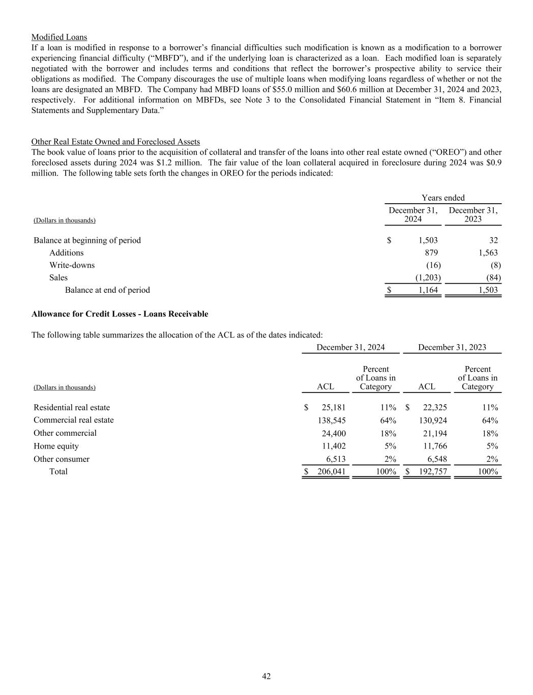 Modified Loans If a loan is modified in response to a borrower’s financial difficulties such modification is known as a modification to a borrower experiencing financial difficulty (“MBFD”), and if the underlying loan is characterized as a loan. Each modified loan is separately negotiated with the borrower and includes terms and conditions that reflect the borrower’s prospective ability to service their obligations as modified. The Company discourages the use of multiple loans when modifying loans regardless of whether or not the loans are designated an MBFD. The Company had MBFD loans of $55.0 million and $60.6 million at December 31, 2024 and 2023, respectively. For additional information on MBFDs, see Note 3 to the Consolidated Financial Statement in “Item 8. Financial Statements and Supplementary Data.” Other Real Estate Owned and Foreclosed Assets The book value of loans prior to the acquisition of collateral and transfer of the loans into other real estate owned (“OREO”) and other foreclosed assets during 2024 was $1.2 million. The fair value of the loan collateral acquired in foreclosure during 2024 was $0.9 million. The following table sets forth the changes in OREO for the periods indicated: Years ended (Dollars in thousands) December 31, 2024 December 31, 2023 Balance at beginning of period $ 1,503 32 Additions 879 1,563 Write-downs (16) (8) Sales (1,203) (84) Balance at end of period $ 1,164 1,503 Allowance for Credit Losses - Loans Receivable The following table summarizes the allocation of the ACL as of the dates indicated: December 31, 2024 December 31, 2023 (Dollars in thousands) ACL Percent of Loans in Category ACL Percent of Loans in Category Residential real estate $ 25,181 11% $ 22,325 11% Commercial real estate 138,545 64% 130,924 64% Other commercial 24,400 18% 21,194 18% Home equity 11,402 5% 11,766 5% Other consumer 6,513 2% 6,548 2% Total $ 206,041 100% $ 192,757 100% 42