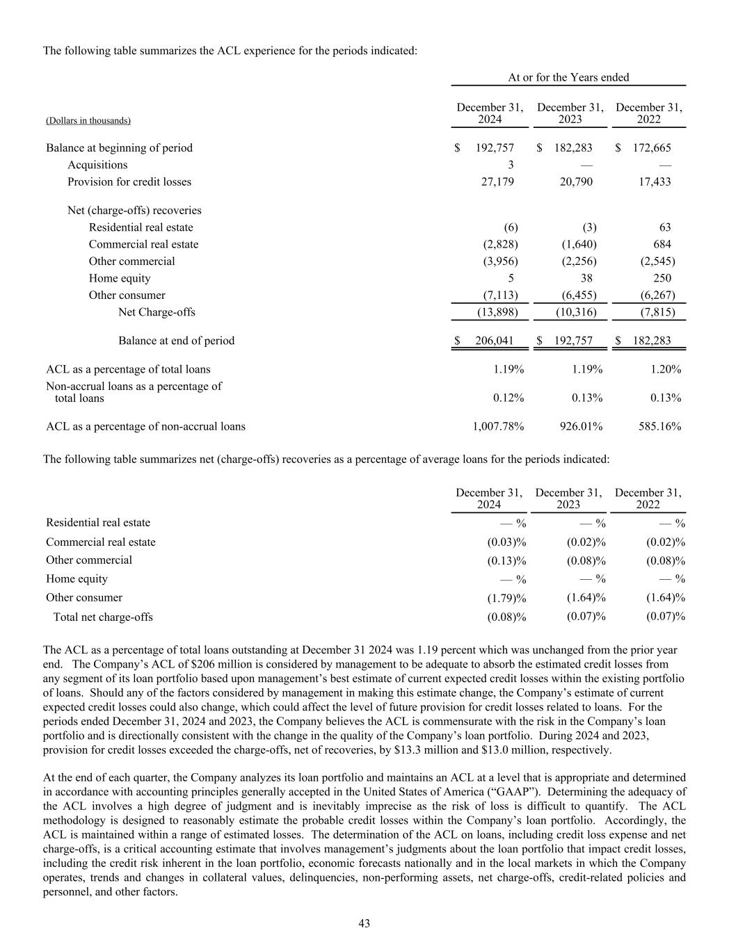 The following table summarizes the ACL experience for the periods indicated: At or for the Years ended (Dollars in thousands) December 31, 2024 December 31, 2023 December 31, 2022 Balance at beginning of period $ 192,757 $ 182,283 $ 172,665 Acquisitions 3 — — Provision for credit losses 27,179 20,790 17,433 Net (charge-offs) recoveries Residential real estate (6) (3) 63 Commercial real estate (2,828) (1,640) 684 Other commercial (3,956) (2,256) (2,545) Home equity 5 38 250 Other consumer (7,113) (6,455) (6,267) Net Charge-offs (13,898) (10,316) (7,815) Balance at end of period $ 206,041 $ 192,757 $ 182,283 ACL as a percentage of total loans 1.19% 1.19% 1.20% Non-accrual loans as a percentage of total loans 0.12% 0.13% 0.13% ACL as a percentage of non-accrual loans 1,007.78% 926.01% 585.16% The following table summarizes net (charge-offs) recoveries as a percentage of average loans for the periods indicated: December 31, 2024 December 31, 2023 December 31, 2022 Residential real estate — % — % — % Commercial real estate (0.03) % (0.02) % (0.02) % Other commercial (0.13) % (0.08) % (0.08) % Home equity — % — % — % Other consumer (1.79) % (1.64) % (1.64) % Total net charge-offs (0.08) % (0.07) % (0.07) % The ACL as a percentage of total loans outstanding at December 31 2024 was 1.19 percent which was unchanged from the prior year end. The Company’s ACL of $206 million is considered by management to be adequate to absorb the estimated credit losses from any segment of its loan portfolio based upon management’s best estimate of current expected credit losses within the existing portfolio of loans. Should any of the factors considered by management in making this estimate change, the Company’s estimate of current expected credit losses could also change, which could affect the level of future provision for credit losses related to loans. For the periods ended December 31, 2024 and 2023, the Company believes the ACL is commensurate with the risk in the Company’s loan portfolio and is directionally consistent with the change in the quality of the Company’s loan portfolio. During 2024 and 2023, provision for credit losses exceeded the charge-offs, net of recoveries, by $13.3 million and $13.0 million, respectively. At the end of each quarter, the Company analyzes its loan portfolio and maintains an ACL at a level that is appropriate and determined in accordance with accounting principles generally accepted in the United States of America (“GAAP”). Determining the adequacy of the ACL involves a high degree of judgment and is inevitably imprecise as the risk of loss is difficult to quantify. The ACL methodology is designed to reasonably estimate the probable credit losses within the Company’s loan portfolio. Accordingly, the ACL is maintained within a range of estimated losses. The determination of the ACL on loans, including credit loss expense and net charge-offs, is a critical accounting estimate that involves management’s judgments about the loan portfolio that impact credit losses, including the credit risk inherent in the loan portfolio, economic forecasts nationally and in the local markets in which the Company operates, trends and changes in collateral values, delinquencies, non-performing assets, net charge-offs, credit-related policies and personnel, and other factors. 43