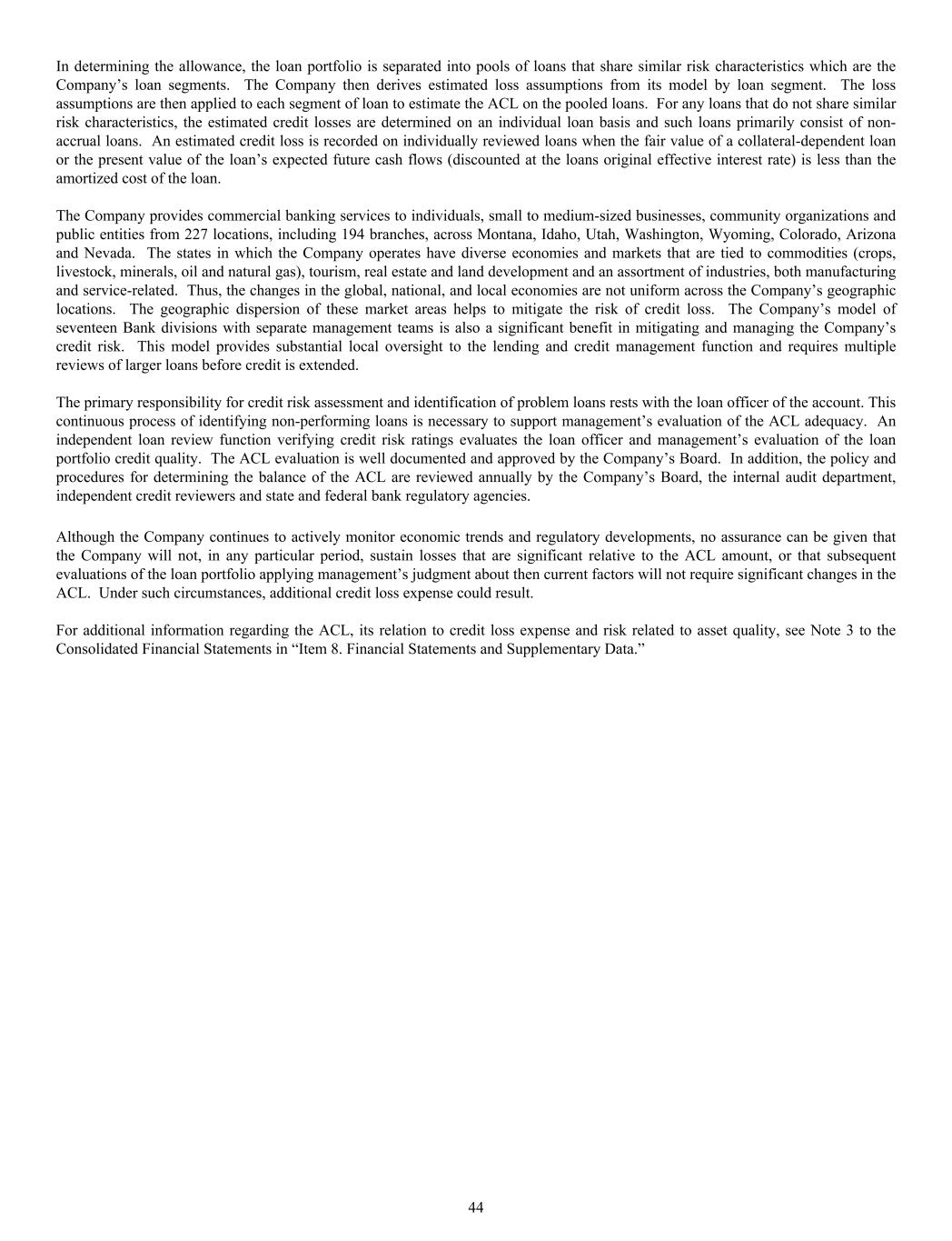 In determining the allowance, the loan portfolio is separated into pools of loans that share similar risk characteristics which are the Company’s loan segments. The Company then derives estimated loss assumptions from its model by loan segment. The loss assumptions are then applied to each segment of loan to estimate the ACL on the pooled loans. For any loans that do not share similar risk characteristics, the estimated credit losses are determined on an individual loan basis and such loans primarily consist of non- accrual loans. An estimated credit loss is recorded on individually reviewed loans when the fair value of a collateral-dependent loan or the present value of the loan’s expected future cash flows (discounted at the loans original effective interest rate) is less than the amortized cost of the loan. The Company provides commercial banking services to individuals, small to medium-sized businesses, community organizations and public entities from 227 locations, including 194 branches, across Montana, Idaho, Utah, Washington, Wyoming, Colorado, Arizona and Nevada. The states in which the Company operates have diverse economies and markets that are tied to commodities (crops, livestock, minerals, oil and natural gas), tourism, real estate and land development and an assortment of industries, both manufacturing and service-related. Thus, the changes in the global, national, and local economies are not uniform across the Company’s geographic locations. The geographic dispersion of these market areas helps to mitigate the risk of credit loss. The Company’s model of seventeen Bank divisions with separate management teams is also a significant benefit in mitigating and managing the Company’s credit risk. This model provides substantial local oversight to the lending and credit management function and requires multiple reviews of larger loans before credit is extended. The primary responsibility for credit risk assessment and identification of problem loans rests with the loan officer of the account. This continuous process of identifying non-performing loans is necessary to support management’s evaluation of the ACL adequacy. An independent loan review function verifying credit risk ratings evaluates the loan officer and management’s evaluation of the loan portfolio credit quality. The ACL evaluation is well documented and approved by the Company’s Board. In addition, the policy and procedures for determining the balance of the ACL are reviewed annually by the Company’s Board, the internal audit department, independent credit reviewers and state and federal bank regulatory agencies. Although the Company continues to actively monitor economic trends and regulatory developments, no assurance can be given that the Company will not, in any particular period, sustain losses that are significant relative to the ACL amount, or that subsequent evaluations of the loan portfolio applying management’s judgment about then current factors will not require significant changes in the ACL. Under such circumstances, additional credit loss expense could result. For additional information regarding the ACL, its relation to credit loss expense and risk related to asset quality, see Note 3 to the Consolidated Financial Statements in “Item 8. Financial Statements and Supplementary Data.” 44