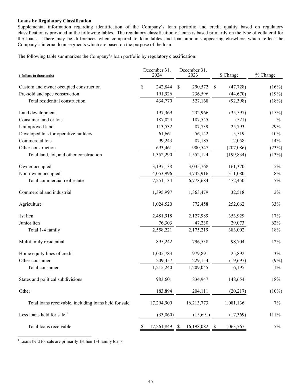 Loans by Regulatory Classification Supplemental information regarding identification of the Company’s loan portfolio and credit quality based on regulatory classification is provided in the following tables. The regulatory classification of loans is based primarily on the type of collateral for the loans. There may be differences when compared to loan tables and loan amounts appearing elsewhere which reflect the Company’s internal loan segments which are based on the purpose of the loan. The following table summarizes the Company’s loan portfolio by regulatory classification: (Dollars in thousands) December 31, 2024 December 31, 2023 $ Change % Change Custom and owner occupied construction $ 242,844 $ 290,572 $ (47,728) (16%) Pre-sold and spec construction 191,926 236,596 (44,670) (19%) Total residential construction 434,770 527,168 (92,398) (18%) Land development 197,369 232,966 (35,597) (15%) Consumer land or lots 187,024 187,545 (521) —% Unimproved land 113,532 87,739 25,793 29% Developed lots for operative builders 61,661 56,142 5,519 10% Commercial lots 99,243 87,185 12,058 14% Other construction 693,461 900,547 (207,086) (23%) Total land, lot, and other construction 1,352,290 1,552,124 (199,834) (13%) Owner occupied 3,197,138 3,035,768 161,370 5% Non-owner occupied 4,053,996 3,742,916 311,080 8% Total commercial real estate 7,251,134 6,778,684 472,450 7% Commercial and industrial 1,395,997 1,363,479 32,518 2% Agriculture 1,024,520 772,458 252,062 33% 1st lien 2,481,918 2,127,989 353,929 17% Junior lien 76,303 47,230 29,073 62% Total 1-4 family 2,558,221 2,175,219 383,002 18% Multifamily residential 895,242 796,538 98,704 12% Home equity lines of credit 1,005,783 979,891 25,892 3% Other consumer 209,457 229,154 (19,697) (9%) Total consumer 1,215,240 1,209,045 6,195 1% States and political subdivisions 983,601 834,947 148,654 18% Other 183,894 204,111 (20,217) (10%) Total loans receivable, including loans held for sale 17,294,909 16,213,773 1,081,136 7% Less loans held for sale 1 (33,060) (15,691) (17,369) 111% Total loans receivable $ 17,261,849 $ 16,198,082 $ 1,063,767 7% ______________________________ 1 Loans held for sale are primarily 1st lien 1-4 family loans. 45