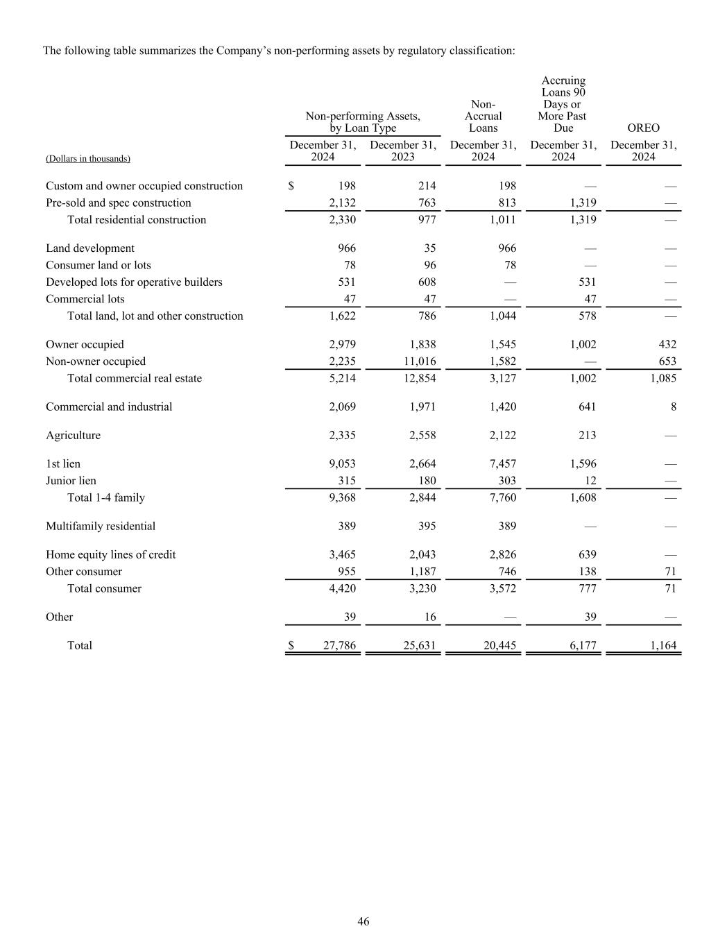 The following table summarizes the Company’s non-performing assets by regulatory classification: Non-performing Assets, by Loan Type Non- Accrual Loans Accruing Loans 90 Days or More Past Due OREO (Dollars in thousands) December 31, 2024 December 31, 2023 December 31, 2024 December 31, 2024 December 31, 2024 Custom and owner occupied construction $ 198 214 198 — — Pre-sold and spec construction 2,132 763 813 1,319 — Total residential construction 2,330 977 1,011 1,319 — Land development 966 35 966 — — Consumer land or lots 78 96 78 — — Developed lots for operative builders 531 608 — 531 — Commercial lots 47 47 — 47 — Total land, lot and other construction 1,622 786 1,044 578 — Owner occupied 2,979 1,838 1,545 1,002 432 Non-owner occupied 2,235 11,016 1,582 — 653 Total commercial real estate 5,214 12,854 3,127 1,002 1,085 Commercial and industrial 2,069 1,971 1,420 641 8 Agriculture 2,335 2,558 2,122 213 — 1st lien 9,053 2,664 7,457 1,596 — Junior lien 315 180 303 12 — Total 1-4 family 9,368 2,844 7,760 1,608 — Multifamily residential 389 395 389 — — Home equity lines of credit 3,465 2,043 2,826 639 — Other consumer 955 1,187 746 138 71 Total consumer 4,420 3,230 3,572 777 71 Other 39 16 — 39 — Total $ 27,786 25,631 20,445 6,177 1,164 46