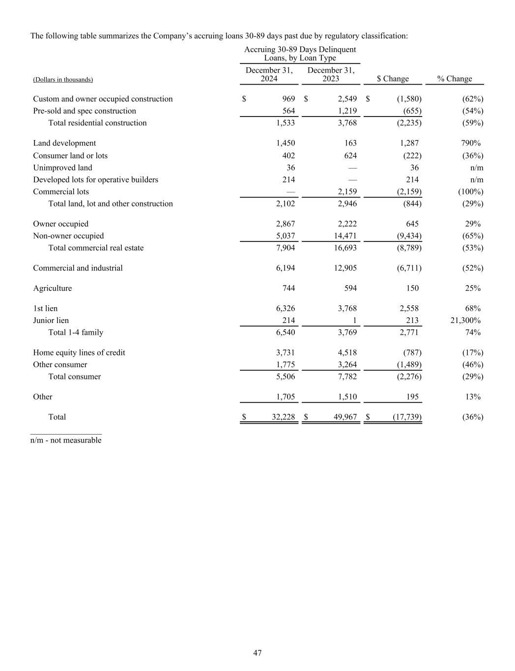 The following table summarizes the Company’s accruing loans 30-89 days past due by regulatory classification: Accruing 30-89 Days Delinquent Loans, by Loan Type (Dollars in thousands) December 31, 2024 December 31, 2023 $ Change % Change Custom and owner occupied construction $ 969 $ 2,549 $ (1,580) (62%) Pre-sold and spec construction 564 1,219 (655) (54%) Total residential construction 1,533 3,768 (2,235) (59%) Land development 1,450 163 1,287 790% Consumer land or lots 402 624 (222) (36%) Unimproved land 36 — 36 n/m Developed lots for operative builders 214 — 214 n/m Commercial lots — 2,159 (2,159) (100%) Total land, lot and other construction 2,102 2,946 (844) (29%) Owner occupied 2,867 2,222 645 29% Non-owner occupied 5,037 14,471 (9,434) (65%) Total commercial real estate 7,904 16,693 (8,789) (53%) Commercial and industrial 6,194 12,905 (6,711) (52%) Agriculture 744 594 150 25% 1st lien 6,326 3,768 2,558 68% Junior lien 214 1 213 21,300% Total 1-4 family 6,540 3,769 2,771 74% Home equity lines of credit 3,731 4,518 (787) (17%) Other consumer 1,775 3,264 (1,489) (46%) Total consumer 5,506 7,782 (2,276) (29%) Other 1,705 1,510 195 13% Total $ 32,228 $ 49,967 $ (17,739) (36%) _________________ n/m - not measurable 47